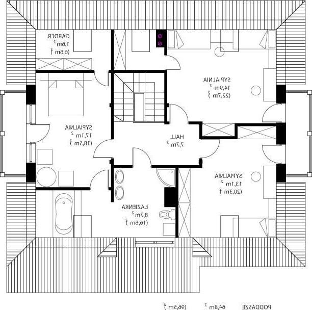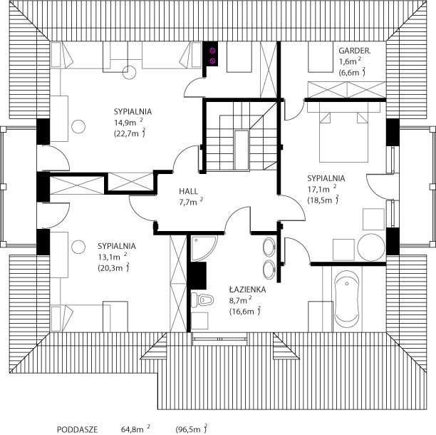 * oraz strefę nocną (poddasze), w której znajdują się trzy sypialnie; dwie garderoby i łazienka.