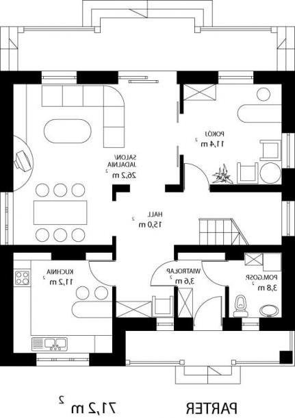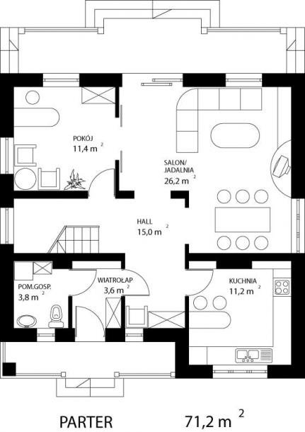 * dzienną (parter), w skład której wchodzą - wiatrołap; hall; W.C.+C.O.; kuchnia; biblioteka; salon