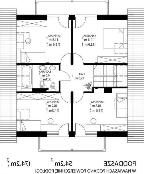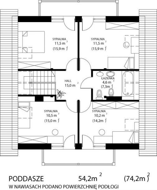 * oraz strefę nocną (poddasze), w której znajdują się cztery sypialnie i łazienka.