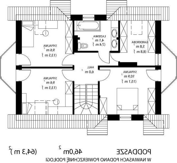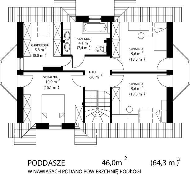 * oraz strefę nocną (poddasze), w której znajdują się trzy sypialnie; garderoba i łazienka.