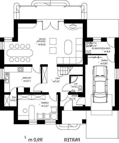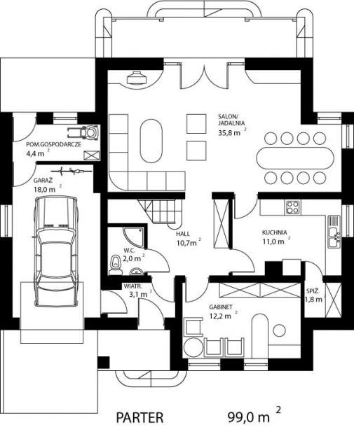 * dzienną (parter), w skład której wchodzą - wiatrołap; hall; w.c.; kuchnia; spiżarnia; salon/jadalnia; gabinet; garaż i kotłownia