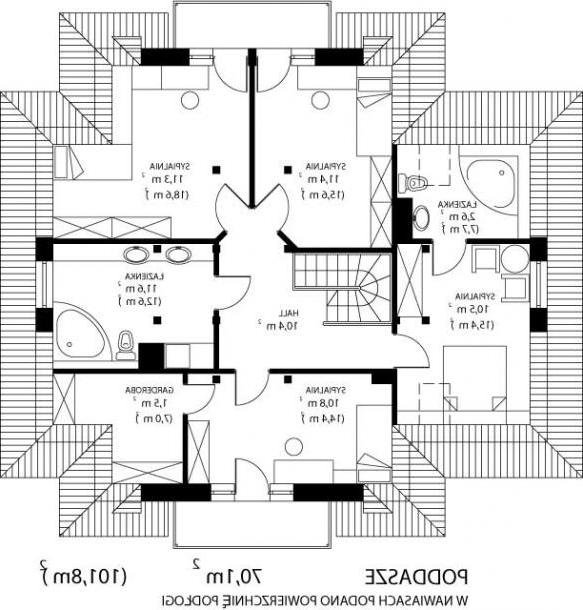 * oraz strefę nocną (poddasze), w której znajdują się cztery sypialnie, dwie łazienki i garderoba.