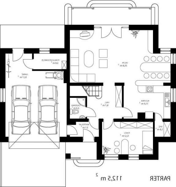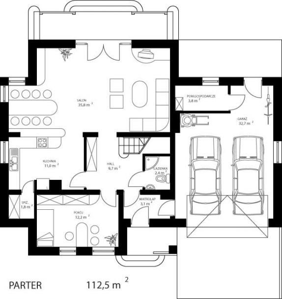 * dzienną (parter), w skład której wchodzą - wiatrołap; hall; łazienka; kuchnia; salon/jadalnia; pokój; spiżarnia; kotłownia i garaż (dwustanowiskowy);