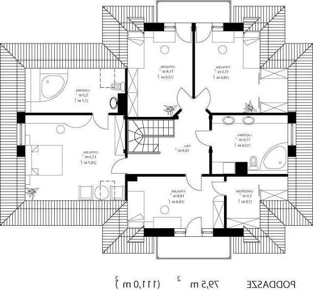 * oraz strefę nocną (poddasze), w której znajdują się cztery sypialnie; dwie łazienki; garderoba.