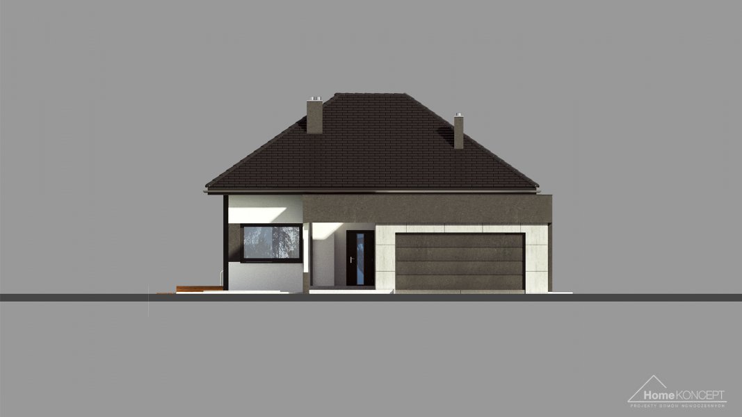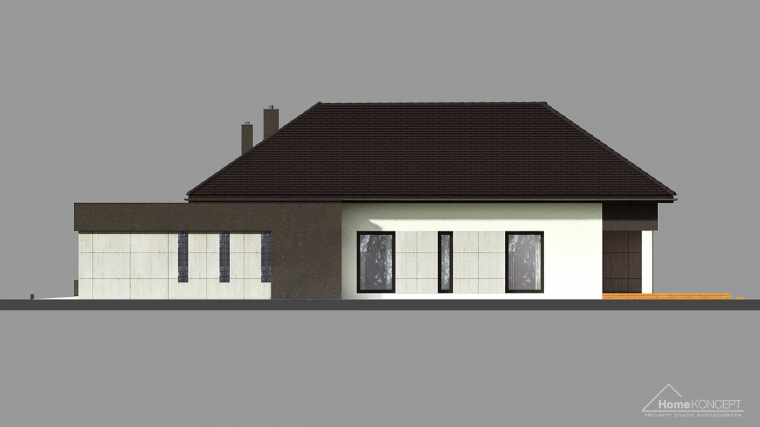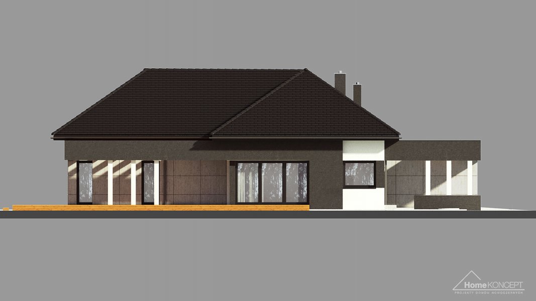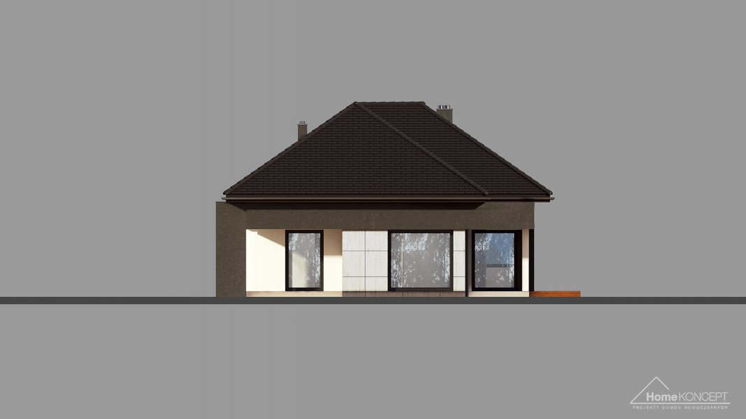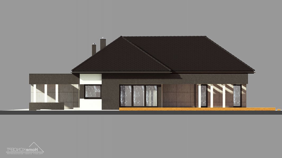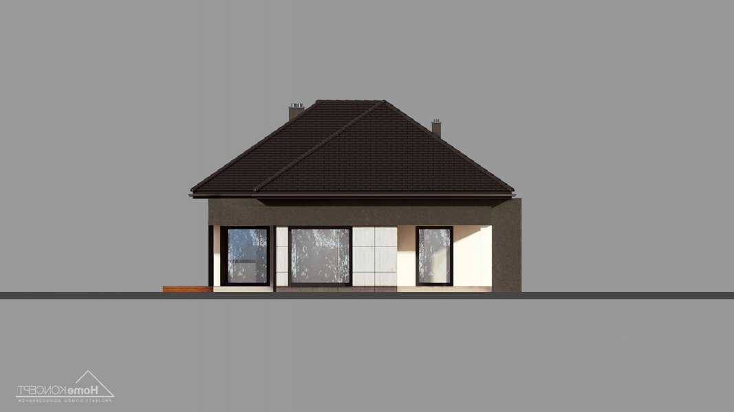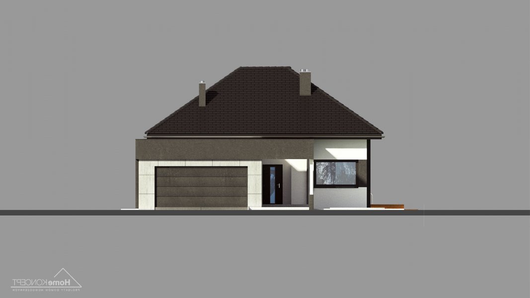 Projekt domu HomeKONCEPT 46 to doskonała propozycja dla właścicieli wąskich działek o szerokości 19,40 m, którzy pokochali nowoczesną stylistykę Pracowni HomeKONCEPT. Budynek wyróżnia stonowana kolorystyka elewacji zaprojektowana z wykorzystaniem tynku o strukturze betonu, który uzupełniono ciemniejszym tynkiem silikonowym. Całość kompozycji dopełnia bardzo elegancka płaska dachówka ceramiczna lub betonowa. Wysunięty do przodu garaż razem z ozdobnym, ażurowym belkowaniem tworzy ciekawą aranżację strefy wejściowej. W części ogrodowej do dyspozycji mieszkańców jest przyjemny, wielofunkcyjny taras, osłonięty przed nadmiernym nasłonecznieniem, ażurowym belkowaniem. Duże przeszklenia zaprojektowane w pomieszczeniach strefy dziennej idealnie doświetlają wnętrza, ułatwiając jednocześnie komunikację domowników z ogrodem. Niewielki zadaszony taras połączony z jedną z sypialni tworzy dyskretną, oddzieloną od głównej części wypoczynkowej przestrzeń wypoczynkową.