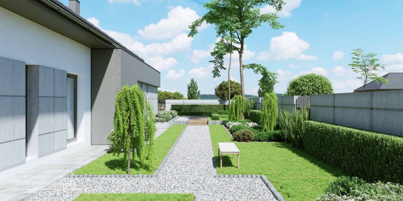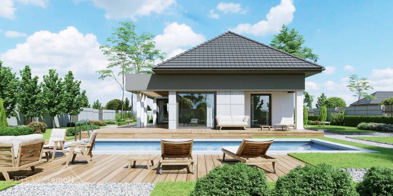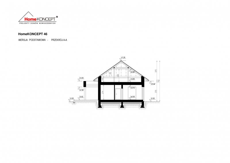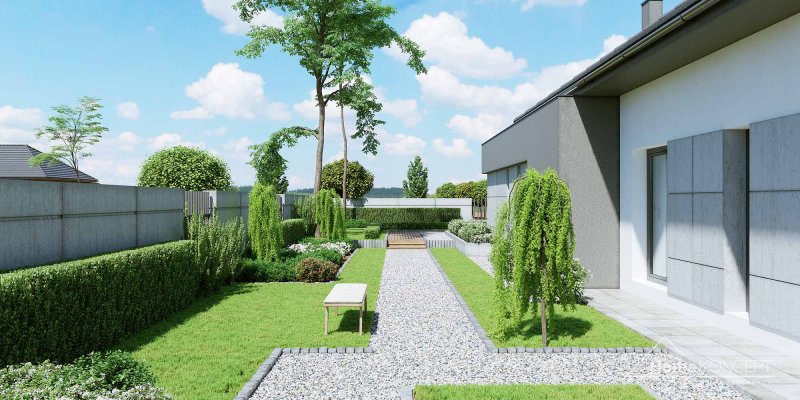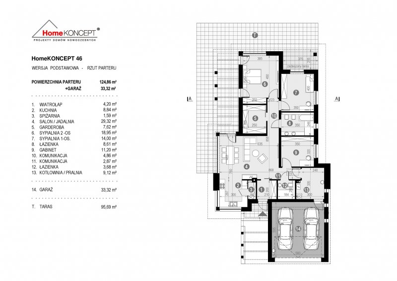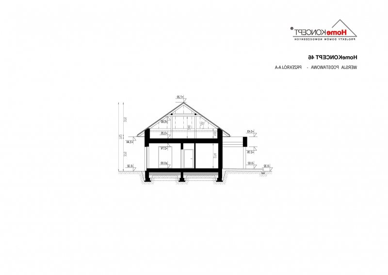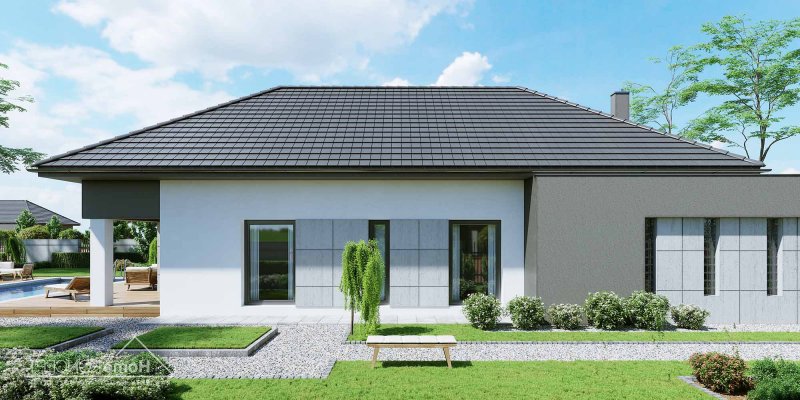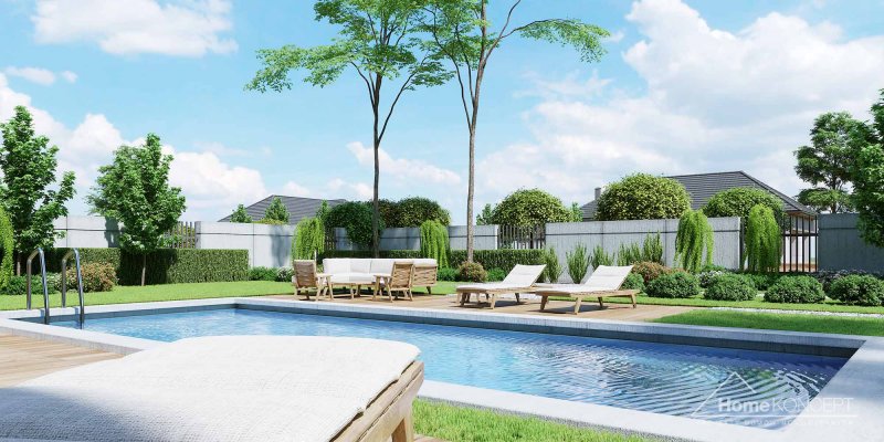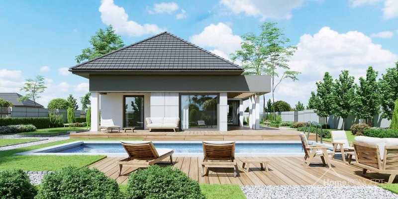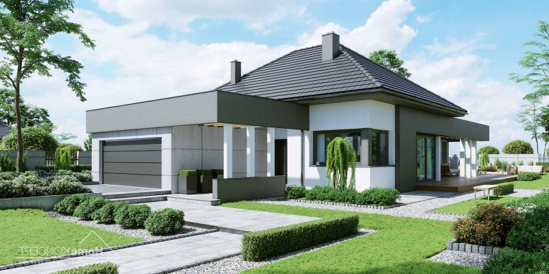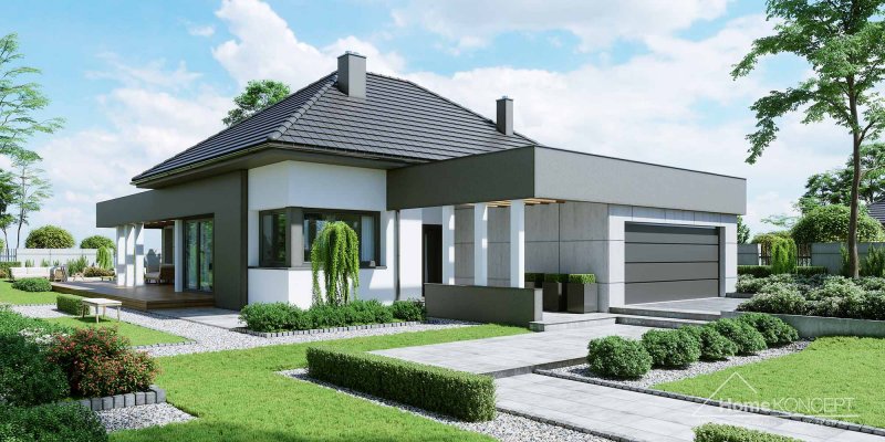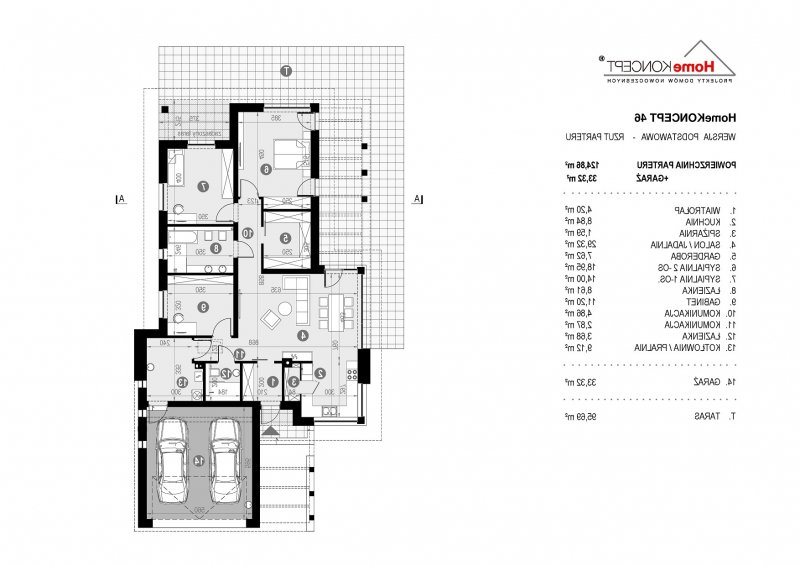 Projekt domu HomeKONCEPT 46 to doskonała propozycja dla właścicieli wąskich działek o szerokości 19,40 m, którzy pokochali nowoczesną stylistykę Pracowni HomeKONCEPT. Budynek wyróżnia stonowana kolorystyka elewacji zaprojektowana z wykorzystaniem tynku o strukturze betonu, który uzupełniono ciemniejszym tynkiem silikonowym. Całość kompozycji dopełnia bardzo elegancka płaska dachówka ceramiczna lub betonowa. Wysunięty do przodu garaż razem z ozdobnym, ażurowym belkowaniem tworzy ciekawą aranżację strefy wejściowej. W części ogrodowej do dyspozycji mieszkańców jest przyjemny, wielofunkcyjny taras, osłonięty przed nadmiernym nasłonecznieniem, ażurowym belkowaniem. Duże przeszklenia zaprojektowane w pomieszczeniach strefy dziennej idealnie doświetlają wnętrza, ułatwiając jednocześnie komunikację domowników z ogrodem. Niewielki zadaszony taras połączony z jedną z sypialni tworzy dyskretną, oddzieloną od głównej części wypoczynkowej przestrzeń wypoczynkową.