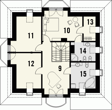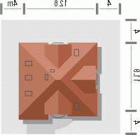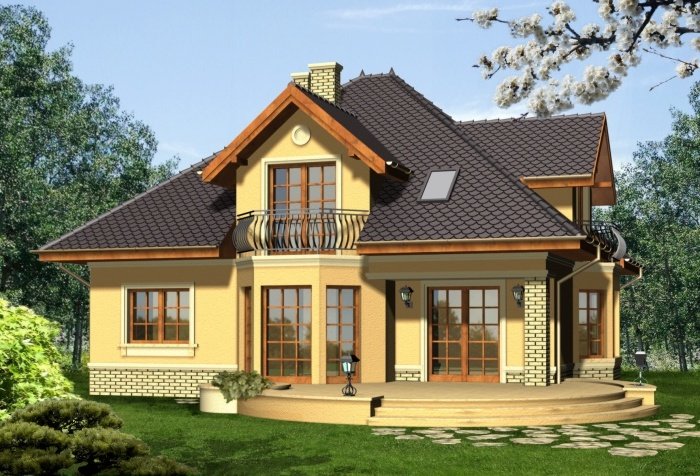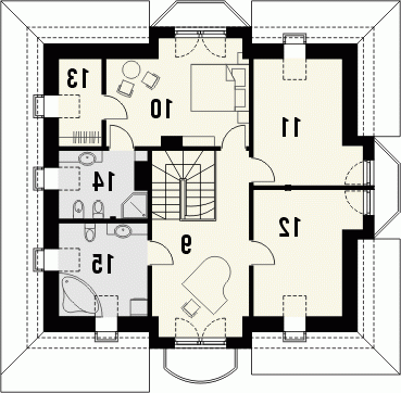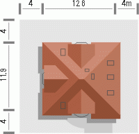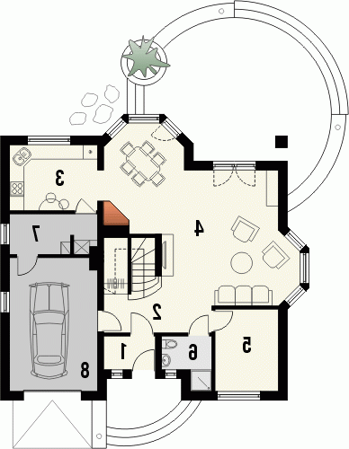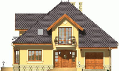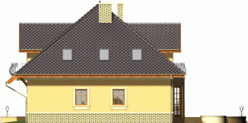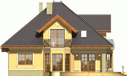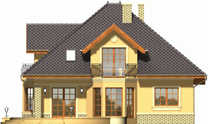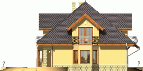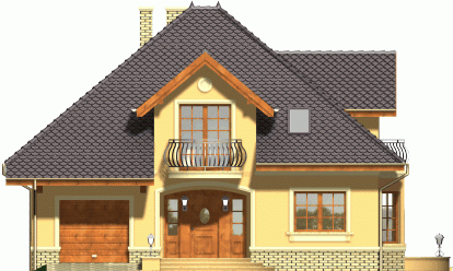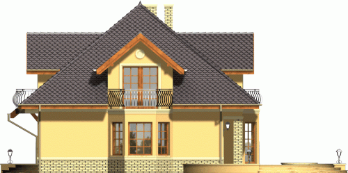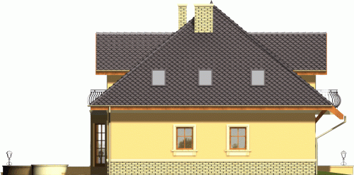 Budynek niepodpiwniczony piętrowy z garażem. Na parterze zaprojektowano pokój dzienny z jadalnią, kuchnię, dodatkowy pokój, łazienkę, garaż i pomieszczenie gospodarcze ze spiżarką. Zaletą domu jest duży salon z wykuszem, połączony z jadalnią i kuchnią. Na poddaszu znajdują się trzy pokoje i dwie łazienki oraz garderoba. Dokumentacja dostępna również w odbiciu lustrzanym.