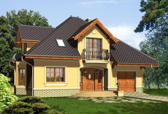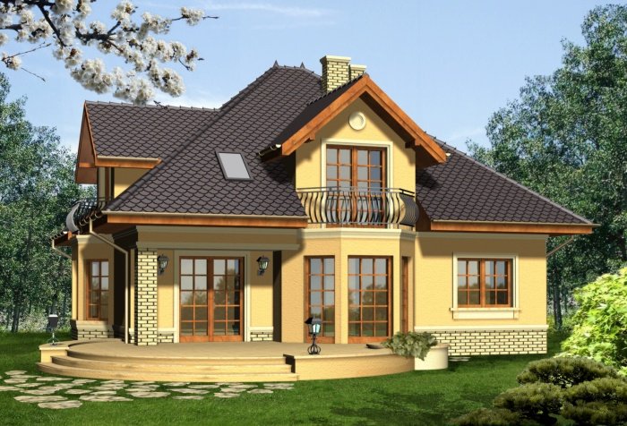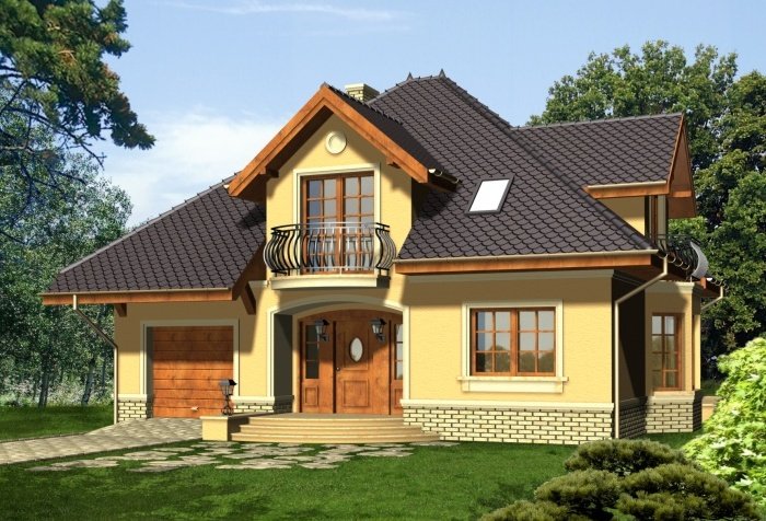 Ściany budynku zaprojektowano z betonu komórkowego ze styropianem lub w innej technologii w ramach adaptacji. Strop gęstożebrowy, więźba drewniana, pokrycie dachówką ceramiczną lub cementową. Inne pokrycia w ramach adaptacji. Elewacje tynkowane, cokoły tynkowane lub okładane płytką klinkierową.