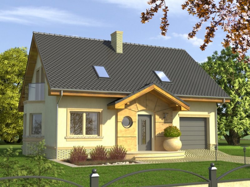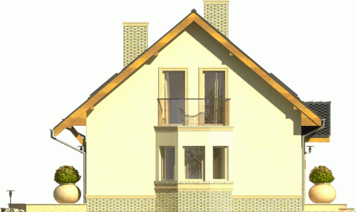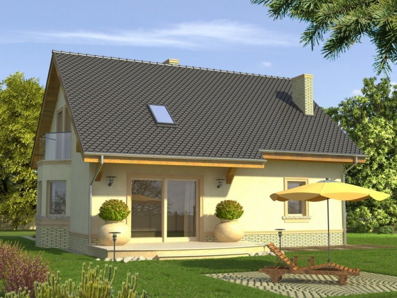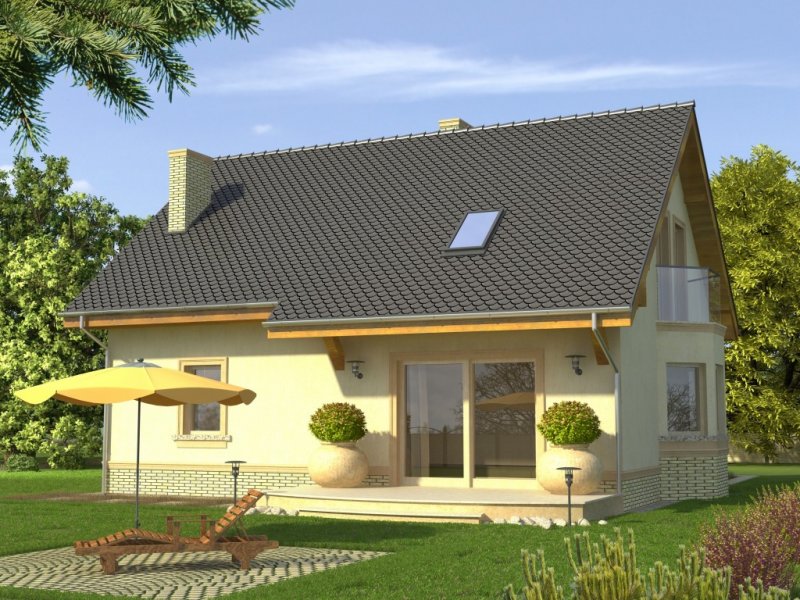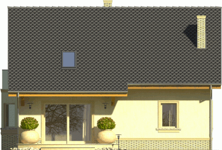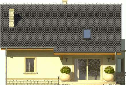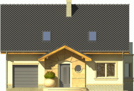Ekonomiczny, zwarty dom z dachem dwuspadowym, z wejściem podkreślonym przez okrągłe okno, daszek i okładzinę fragmentu ściany. Część tarasu od strony ogrodu jest praktycznie zadaszona przedłużoną połacią dachu.