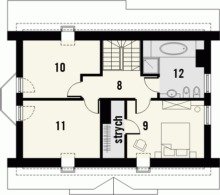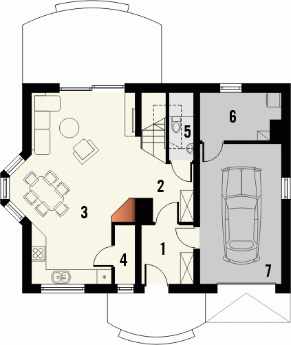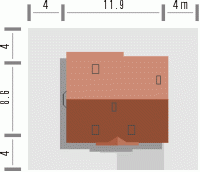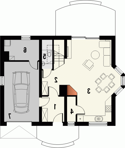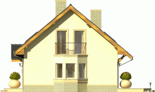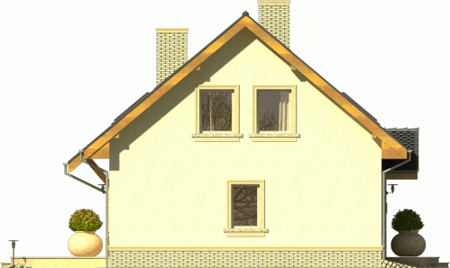 Budynek niepodpiwniczony, piętrowy, z jednostanowiskowym garażem wbudowanym. Parter zwraca uwagę atrakcyjną strefą dzienną z wykuszem przy jadalni, funkcjonalną spiżarką przy kuchni oraz szerokim przeszkleniem prowadzącym na taras ogrodowy. Poddasze pod stromym dachem dwuspadowym mieści 3 duże pokoje oraz wygodną łazienkę. Dokumentacja dostępna również w odbiciu lustrzanym.