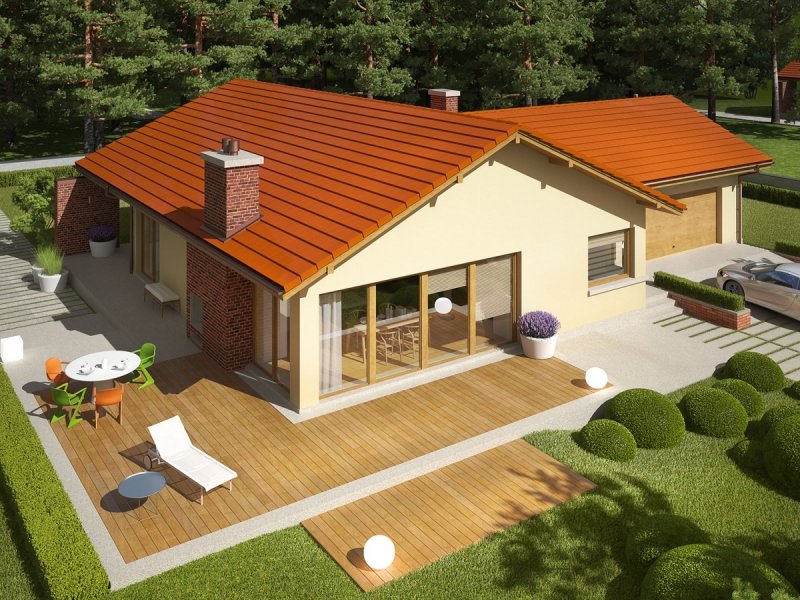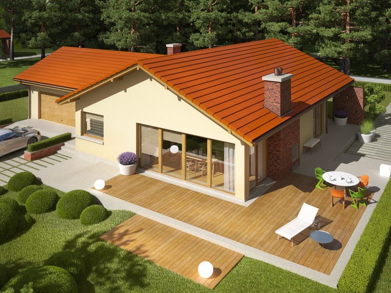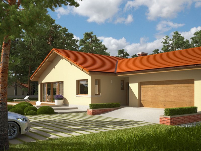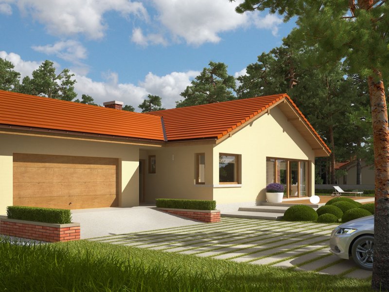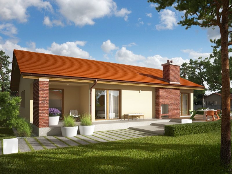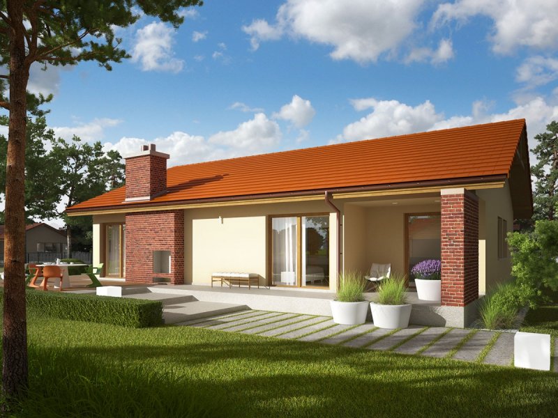 India G2 (wersja A) to piękny dom w klimacie ponadczasowej elegancji. Wielkoformatowe przeszklenia zamieniają fasadę budynku w atrakcyjne okno na świat – tworzą ogrodową witrynę, która optycznie powiększa przestrzeń i wchłania do wnętrza naturalne światło oraz kojącą zieleń roślin. Komfortowy układ funkcjonalny harmonijnie łączy się z przestrzenią tarasu, na którym domownicy odpoczywają w towarzystwie atrakcyjnego, zewnętrznego kominka. Ciekawa bryła budynku, w połączeniu z brzoskwinią elewacją oraz klinkierowymi akcentami sprawia, że dom emanuje przytulnym wdziękiem. Estetycznym dopełnieniem całości jest prosty, tradycyjny dach.