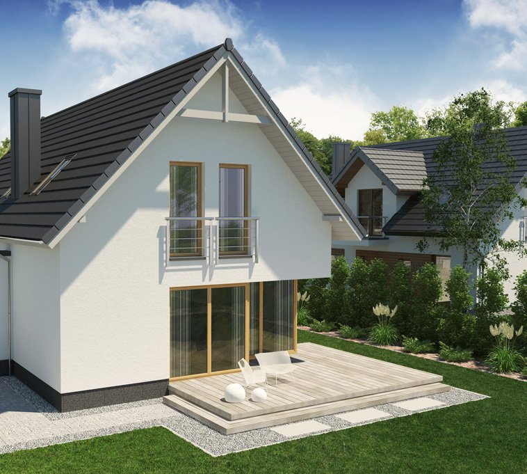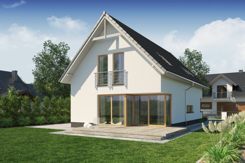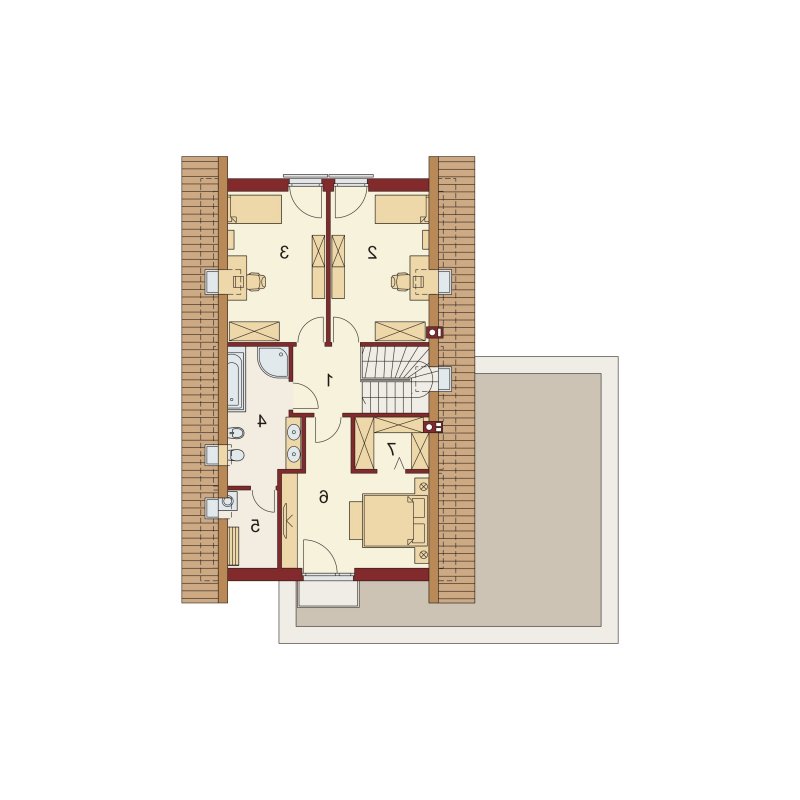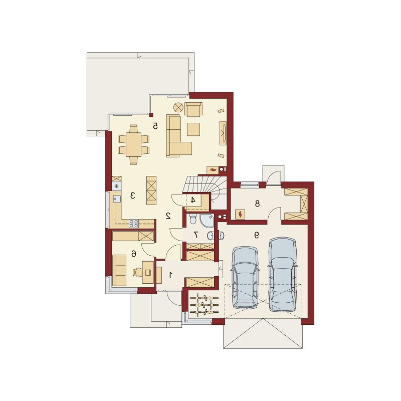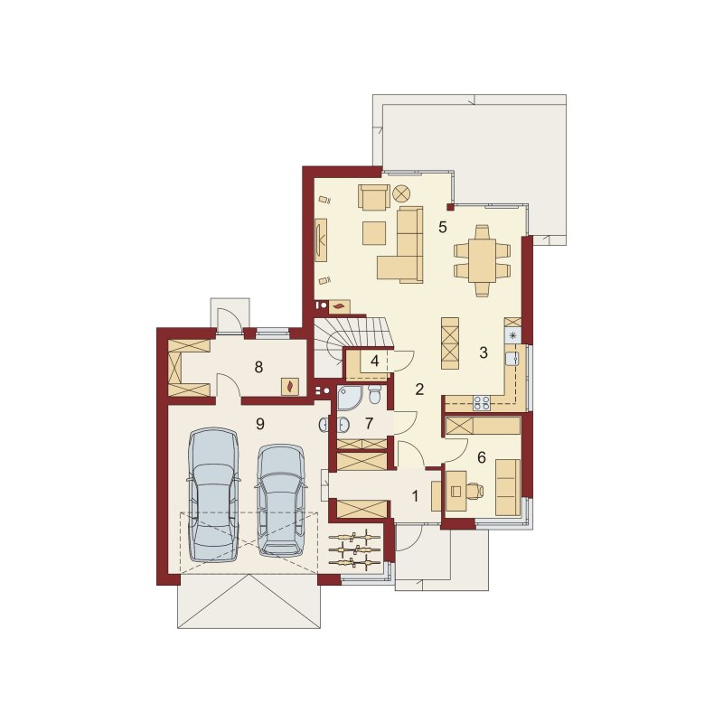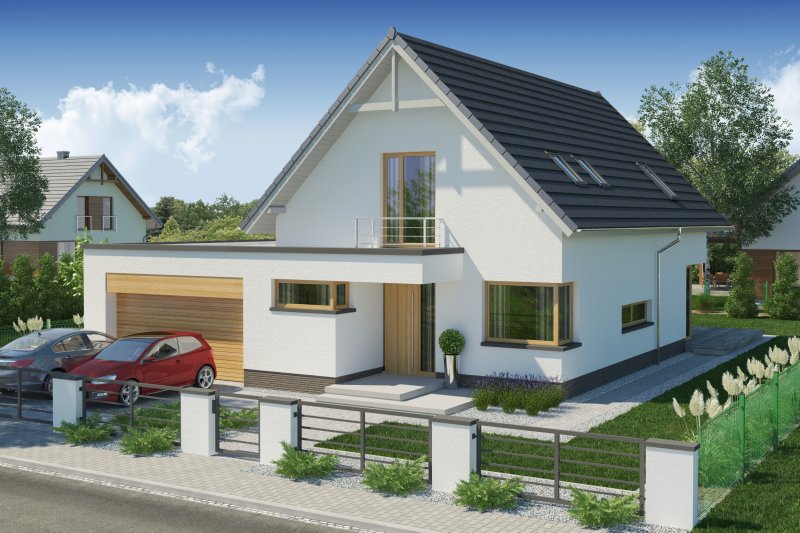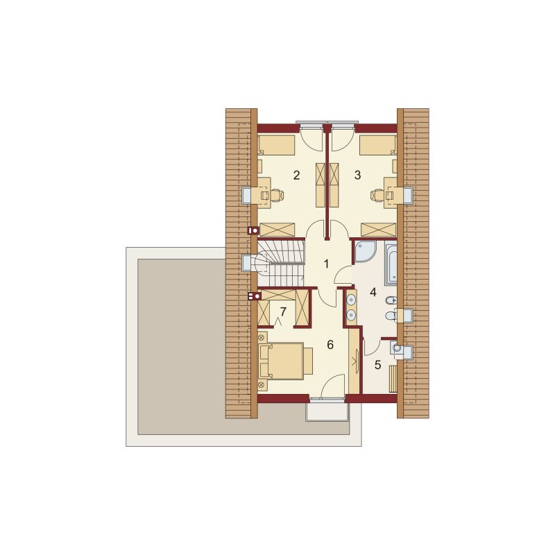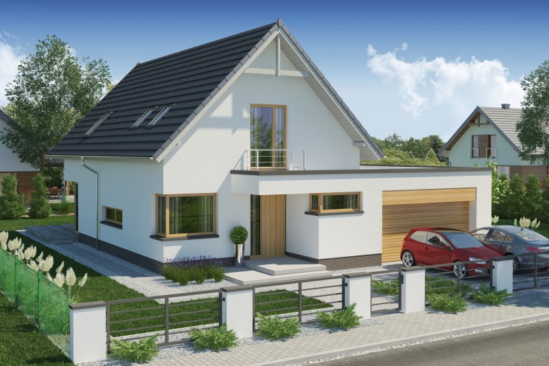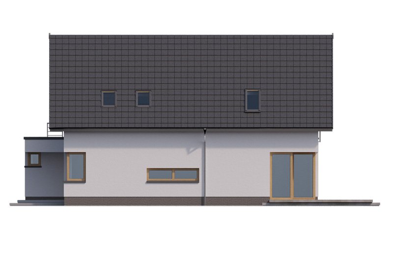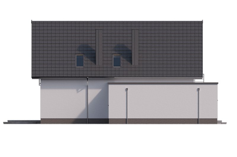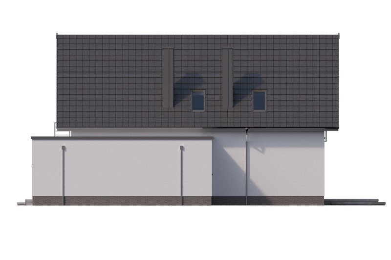 JANUARY 2 PS to parterowy dom z poddaszem użytkowym przeznaczony na wąską działkę i zaprojektowany dla 4-5-osobowej rodziny. Na parterze znajduje się: przestronny salon z jadalnią i wyjściem na zacieniony podcieniem taras, łatwa do zamknięcia w ramach adaptacji kuchnia ze zlokalizowaną pod schodami spiżarnią oraz gabinet, który wraz ze położoną niedaleko łazienką doskonale sprawdzi się także jako pokój gościnny czy sypialnia. Dodatkowo znajdziemy tu kotłownię i dwustanowiskowy garaż, do którego dojść można przez pomieszczenie pełniące funkcję przestronnej garderoby dostępnej z wiatrołapu.