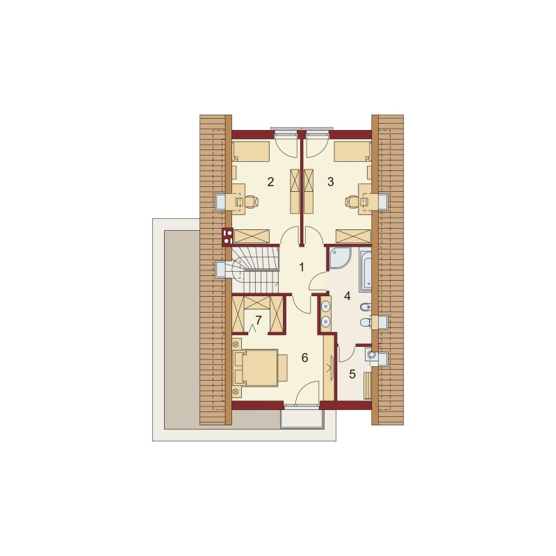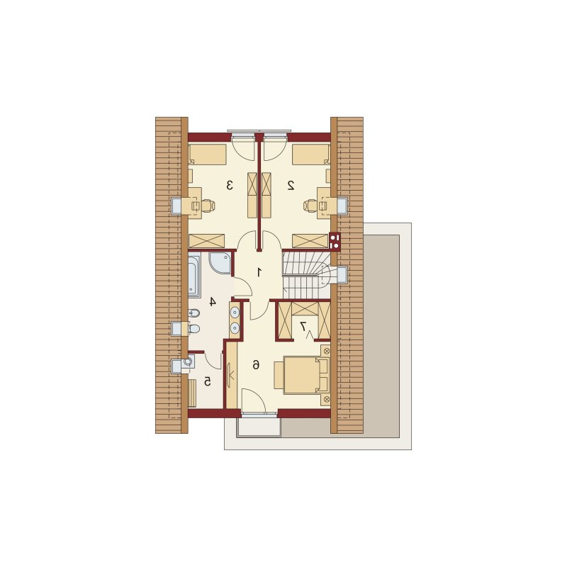 Na poddaszu odnajdziemy trzy duże pokoje - w tym jeden z własną garderobą i wyjściem na taras oraz przestronną łazienkę z wydzielonym pomieszczeniem pralni.