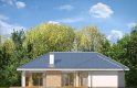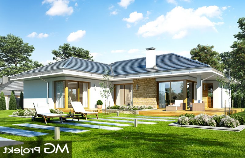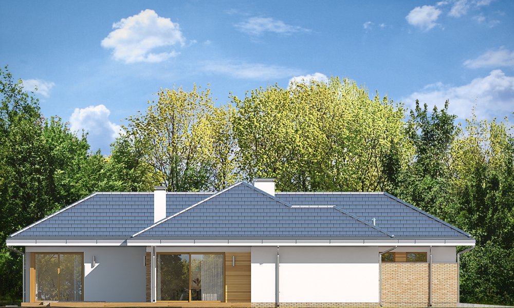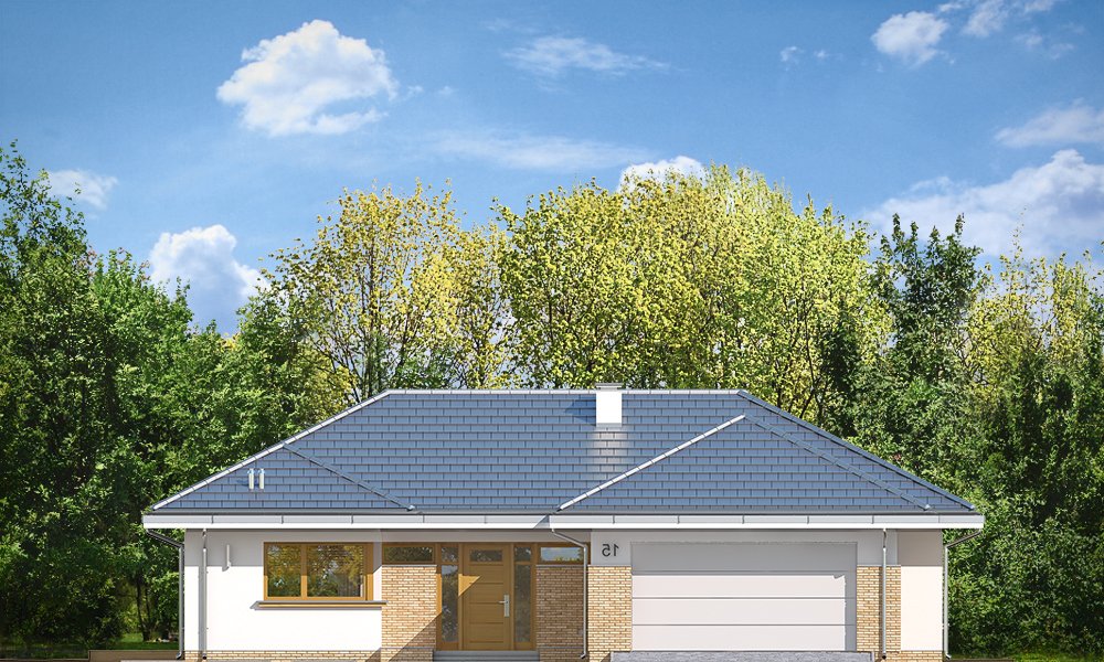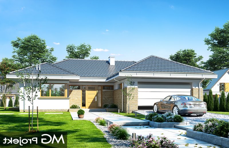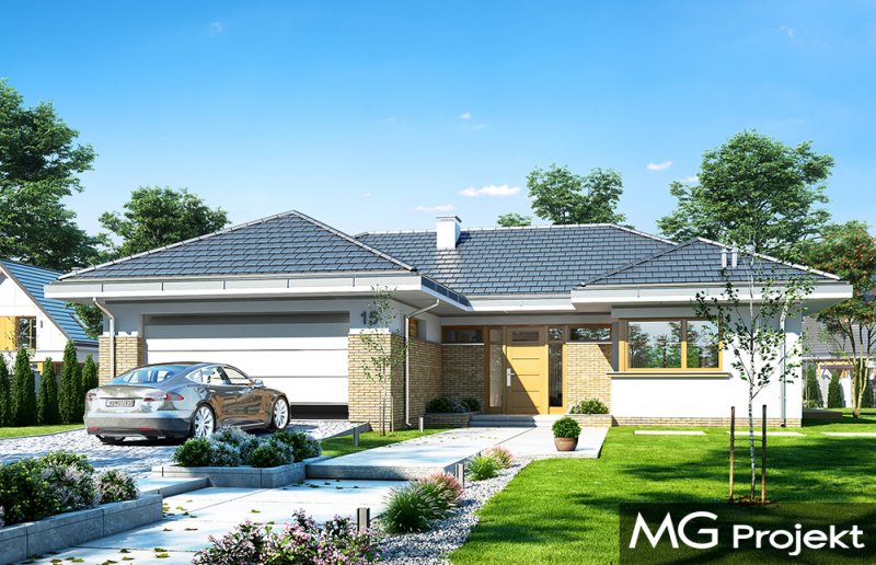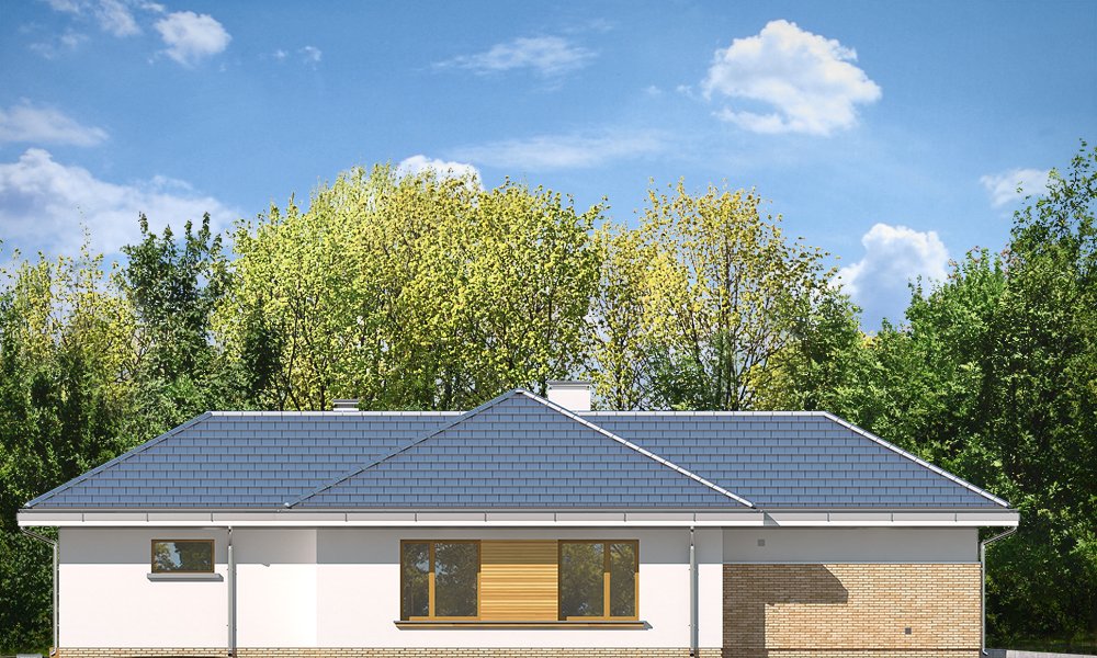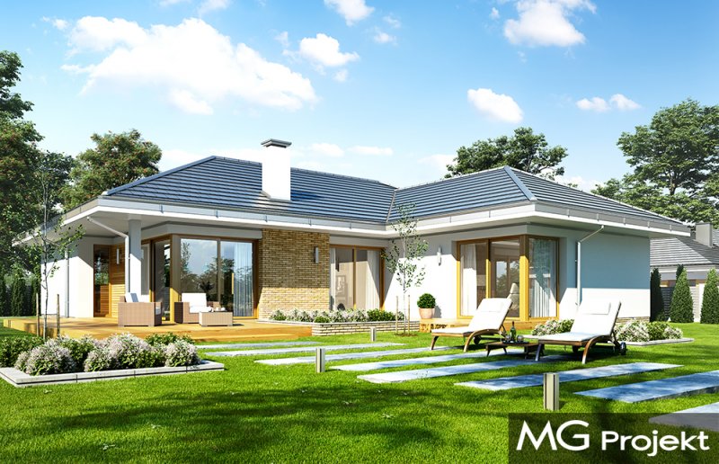 Jedyny to dom jednorodzinny, parterowy, dla cztero-pięcioosobowej rodziny. Nawiązuje wyglądem do architektury amerykańskich bungalowów z południowych stanów, ale w europejskim murowanym, solidnym wydaniu. Jest to nowoczesny, energooszczędny dom dla rodziny pragnącej zamieszkać blisko ogrodu, na jednym poziomie, bez biegania po schodach. Oczywiście też domek dla szczęśliwców, którzy dysponują ładną działką :). Budynek zaprojektowano na planie litery T. Front budynku zakomponowano wokół reprezentacyjnego wejścia - wchodzimy po schodkach patio, a stąd z podestu szerokimi pięknymi drzwiami z naświetlami do wnętrza. Obok wejścia mamy piękne narożne okno kuchenne, a z drugiej strony elewacji wystający szeroki garaż. Z kolei elewację ogrodową zdobią piękne narożne przeszklenia łączące wnętrze z tarasem i ogrodem, oraz solidna ceglana ściana komina. Dom całkowicie otwiera się na zieleń łapiąc słońce i wprowadzając ogród do wnętrza. Zasada projektowania środka domu w tym projekcie jest prosta i bezkompromisowa : żadnych klitek, udawanych pokoików. Pokoje są ładne, wymiarowe i funkcjonalnie połączone ze sobą. Projekt z pewnością będzie dobrą propozycją dla osób mających już za sobą jeden czy dwa nieudane domy i mających wyobrażenie o tym co daje rzeczywisty komfort i wygodę mieszkania. Do domu wchodzimy przez duży przeszklony przedsionek. Na lewo przechodzimy przez szatnię do kotłowni i garażu. Na prawo - przez spiżarnię (magazyn) do pięknej kuchni. Na wprost otwiera nam się bajeczne duża przestrzeń dzienna - miejsce codziennego życia domowników. Przestrzeń dzienna połączona jest z kuchnią, a pięknymi przeszkleniami z tarasem i ogrodem. Na środku salonu mamy komplet kanap, po bokach ścianę TV, i jadalnię, a na wprost ścianę kominkową na tle widocznego przez szyby ogrodu :). Dużą przestrzeń salonu potęguje otwarcie przestrzenne sufitu aż do wysokości dachu. Z części dziennej przechodzimy do prywatnej części domowników. Mamy tutaj holl – pokój ogólny, w którym zmieści się dodatkowa kanapa – taka do posiedzenia sobie, apartament rodziców, z sypialnią w pełni otwartą na ogród, garderobą i łazienką, oraz dwie sypialnie dzieci, dodatkowa łazienka i wc. Nad dużą częścią powierzchni parteru mamy do dyspozycji strych, który można wykorzystać jako domowy magazyn przedmiotów różnych. Dom mimo swojej niewielkiej powierzchni jest bardzo komfortowy i funkcjonalny. Z pewnością będzie się w nim świetnie mieszkało. Do tego ma prostą konstrukcję i nie będzie drogi w budowie, a energooszczędne rozwiązania i dobre izolacje zapewnią niedrogie koszty utrzymania. Zapraszamy !