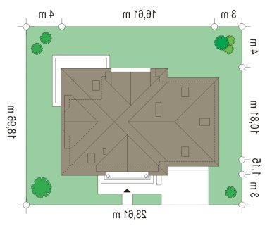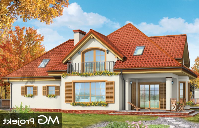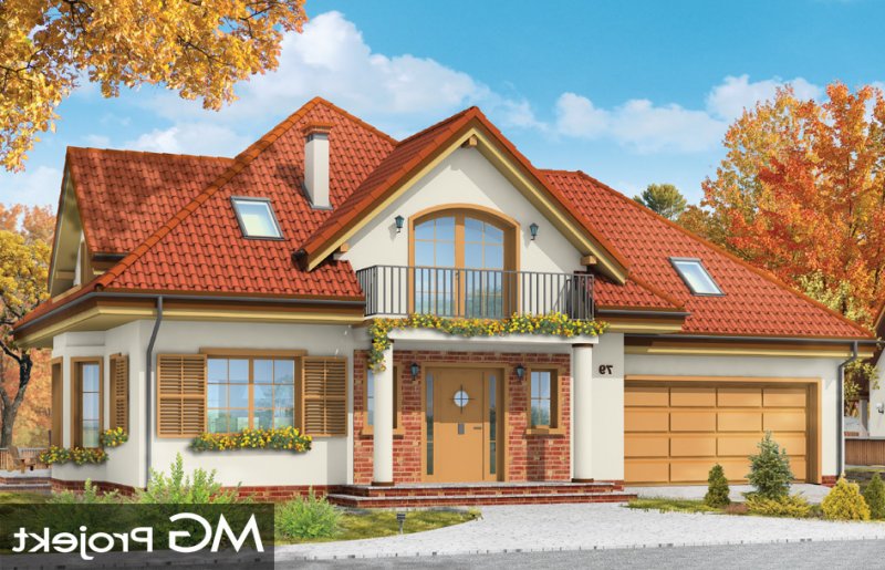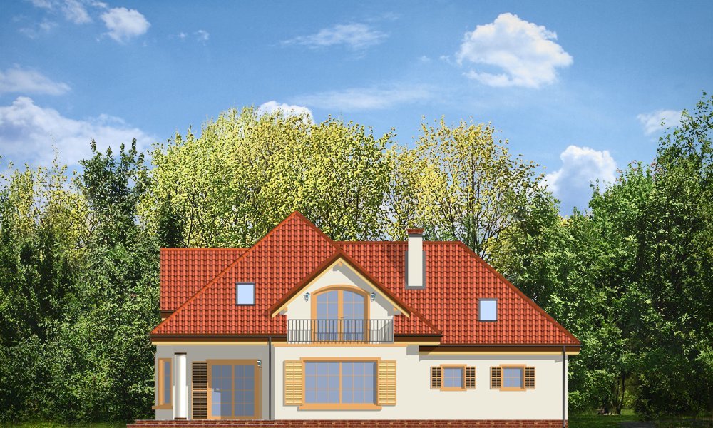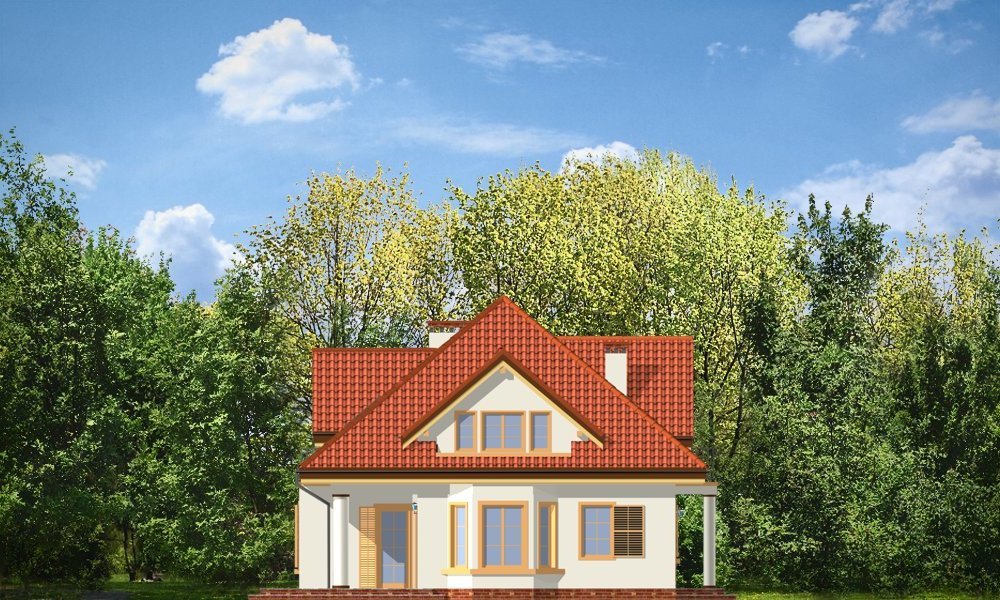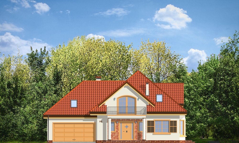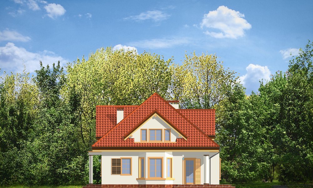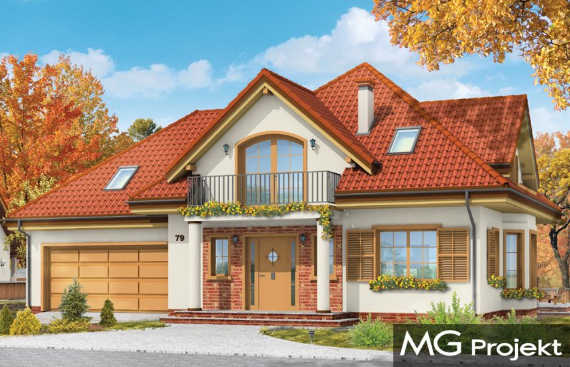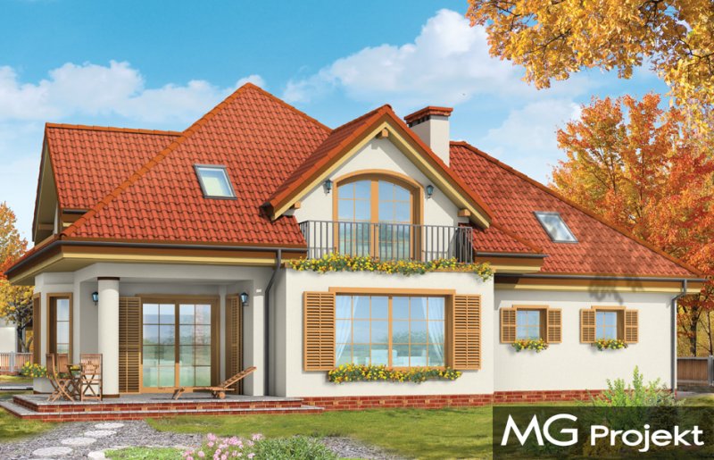 Julka to budynek jednorodzinny parterowy z poddaszem użytkowym dla rodziny 4-5cio osobowej. Projekt architektonicznie wzorowany jest na serii popularnych projektów Benedykt. Jest to jednak projekt o mniejszej powierzchni. Wymiary zewnętrzne budynku pozwolą posadowić go na niedużej działce. Mimo niewielkiej powierzchni użytkowej dom jest bardzo funkcjonalny wewnątrz, oraz prezentuje się bardzo dostojnie na zewnątrz. Kopertowy dach z dobudowaną bryłą garażu ozdobiony został szerokimi lukarnami z balkonami. Od strony wejściowej balkon wsparty został na kolumnach tworząc podcień wejściowy, od ogrodu zaprojektowano wykusz z pięknym oknem z salonu. Dodatkowego sznytu domowi dodają wykusz w jadalni, oraz podcień ogrodowy z salonu, wsparty na kolumnie podpierającej narożnik domu. Na parterze zaplanowano pokój dzienny z jadalnią połączony z holem i z częściowo otwartą kuchnią. Reprezentacyjne schody będą stanowiły ozdobę przestrzeni dziennej na parterze. Przy wejściu zaprojektowano dodatkowe pomieszczenie, które może być wykorzystane do celów gospodarczych (wówczas połączone z garażem), lub może być ewentualnie pokoikiem do pracy - gabinetem. W części garażowej znajduje się dwustanowiskowy, wygodny garaż i dwa pomieszczenia gospodarcze w tym kotłownia. Na poddaszu przewidziano trzy przestronne sypialnie i wygodną łazienkę. Każda z sypialni ma przewidziane ściany z szafami wbudowanymi - można również wygrodzić w nich garderoby.