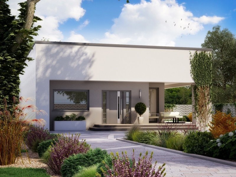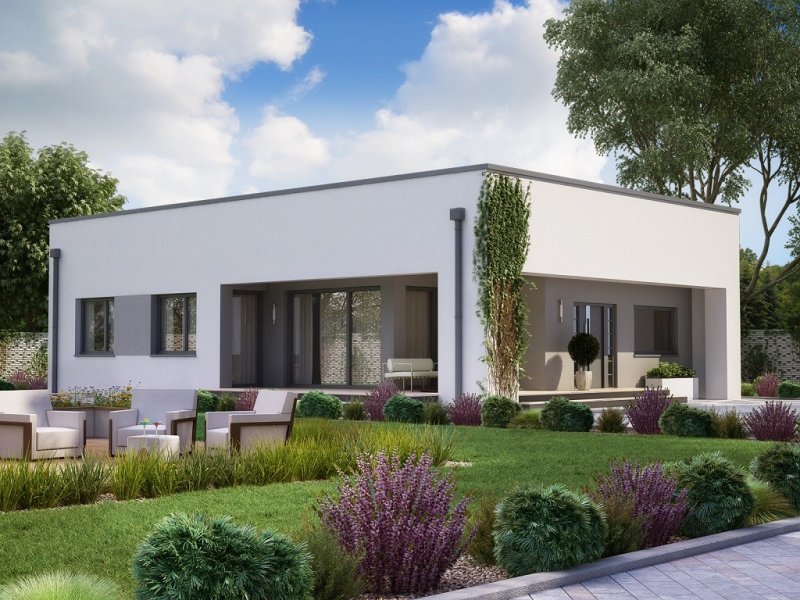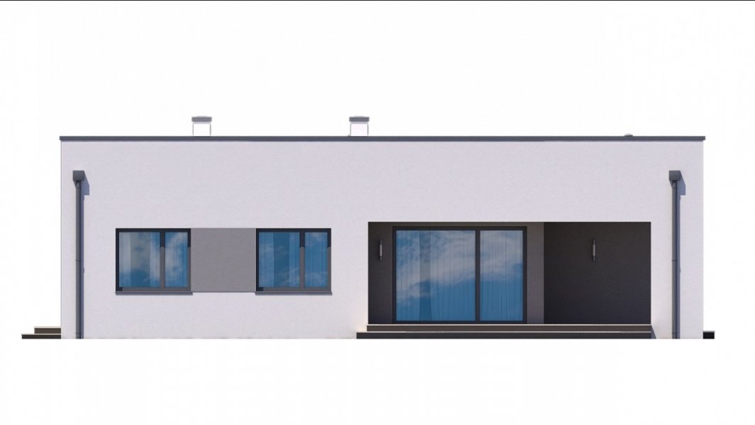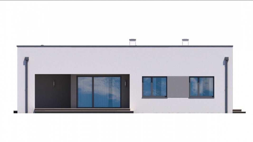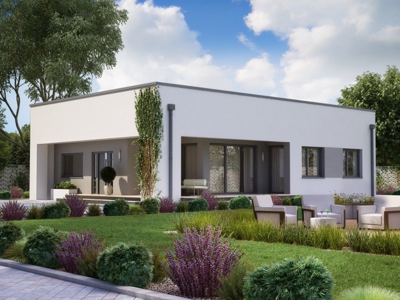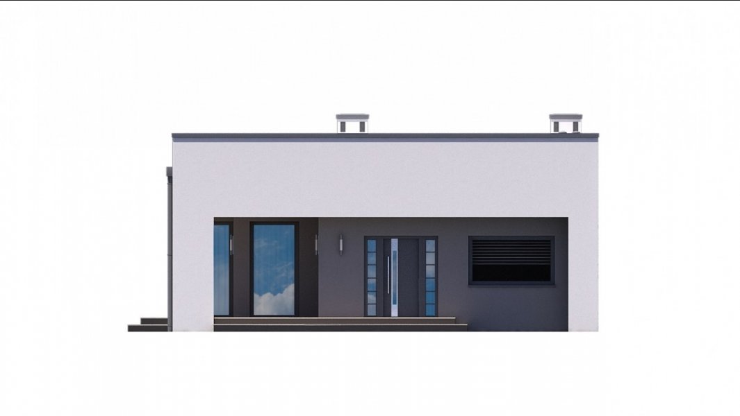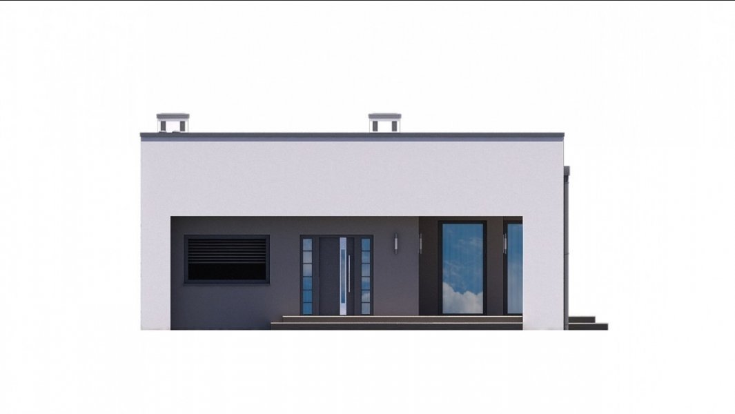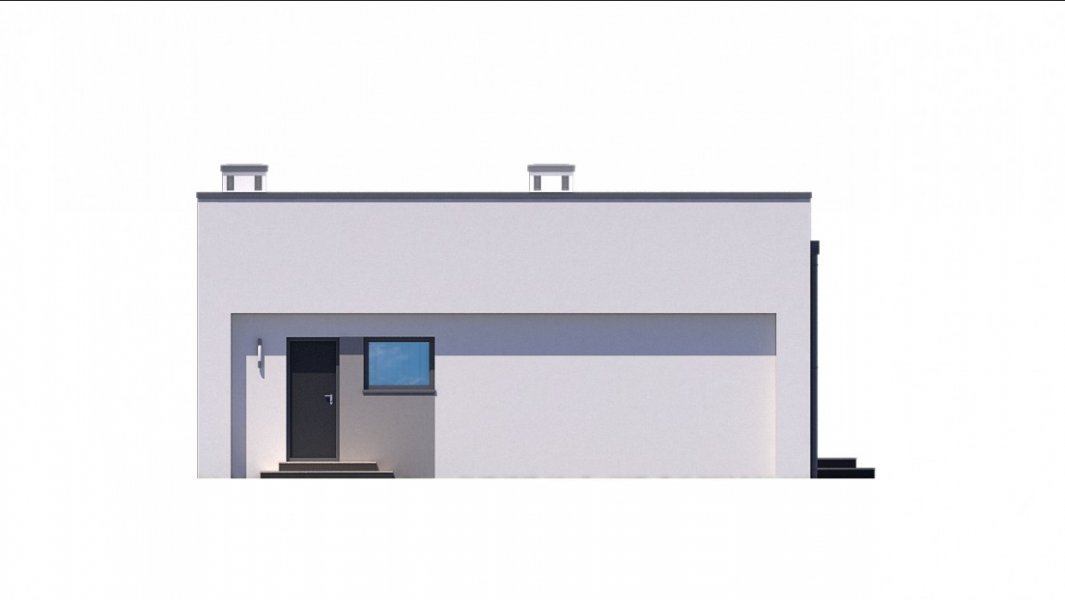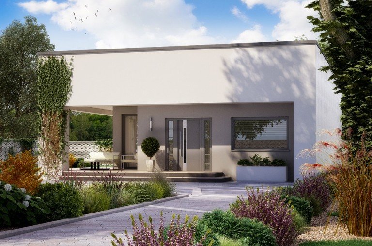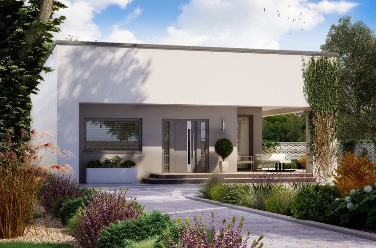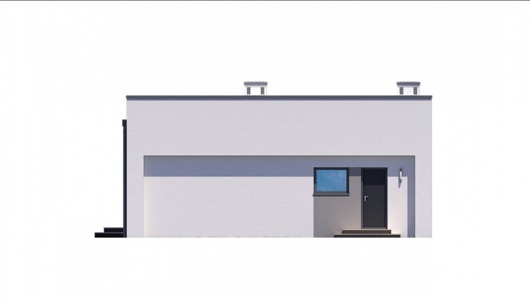 Mały i nowoczesny domek parterowy z płaskim dachem. Idealny na wąską działkę, możliwość zlokalizowania tuż przy jej granicy.