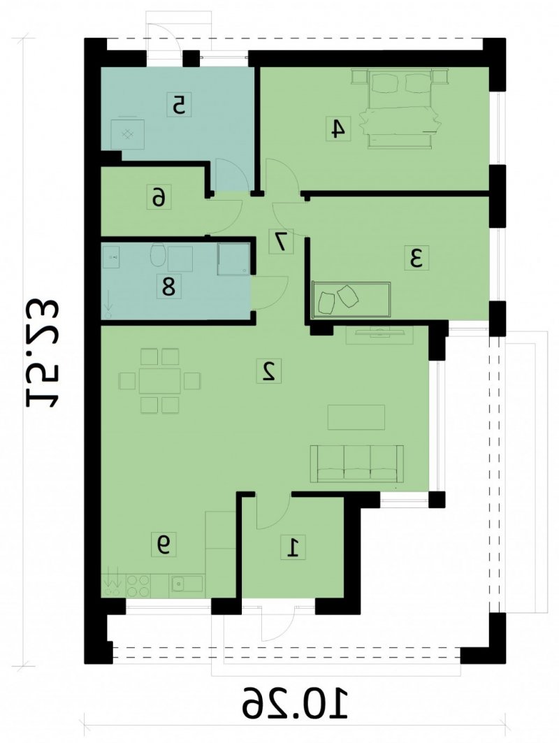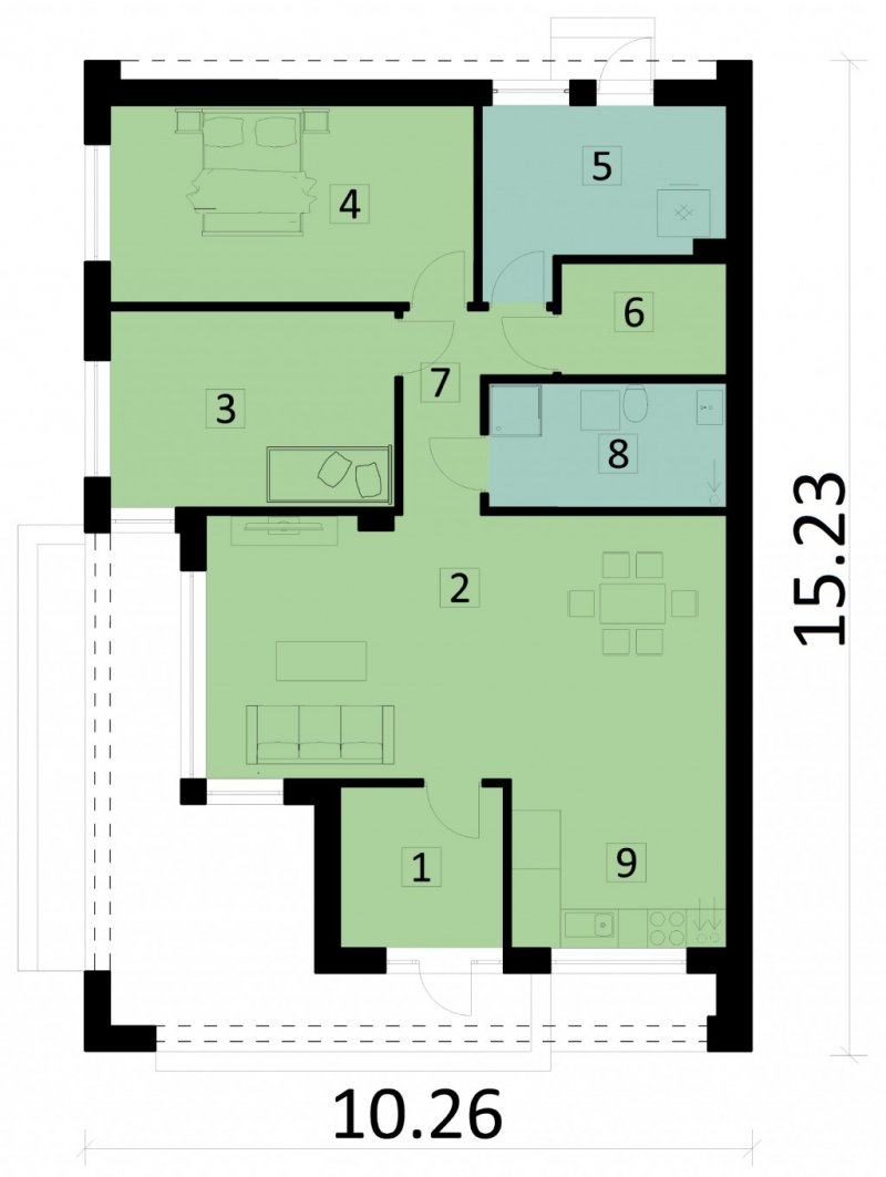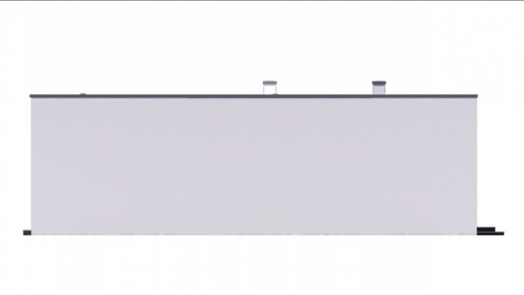 Dom o zwartej bryle, w którym znajdują się pokoje, kuchnia połączona z jadalnią i salonem oraz łazienka. Dodatkowo zlokalizowano garderobę i pomieszczenie gospodarcze.