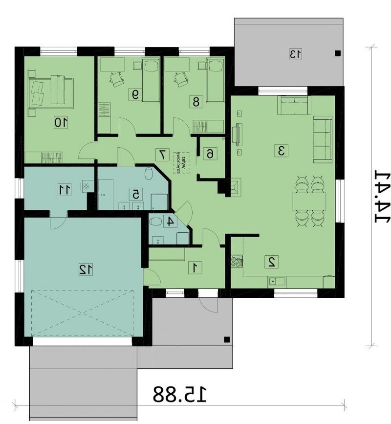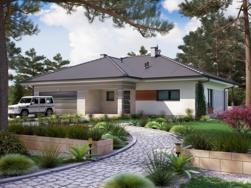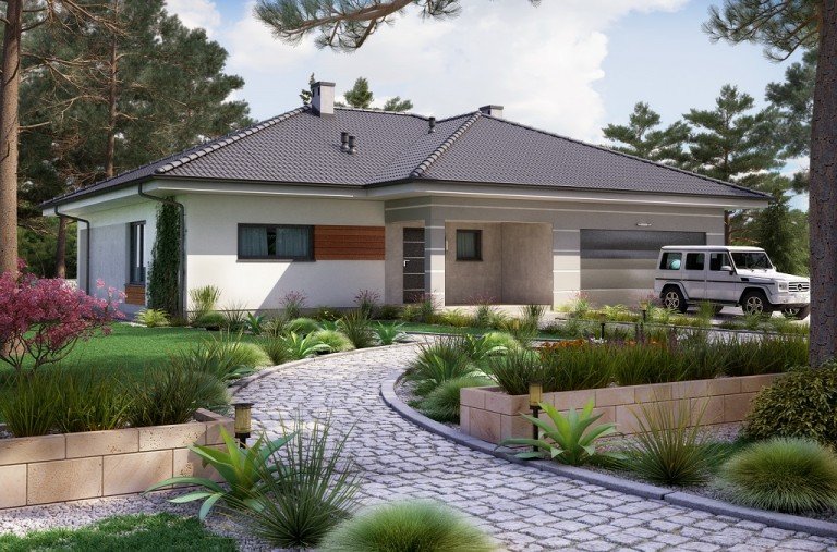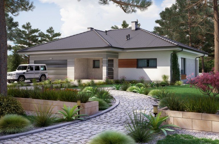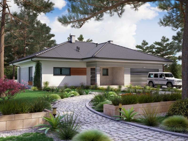 Ka17 to przestrzenny dom parterowy dla 4-5 osobowej rodziny z dwustanowiskowym garażem wbudowanym w bryłę budynku.