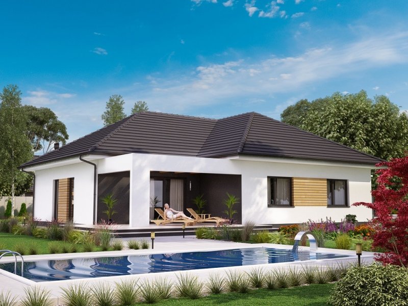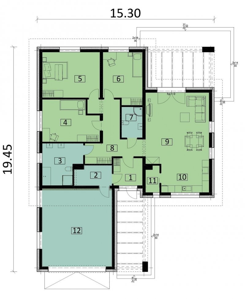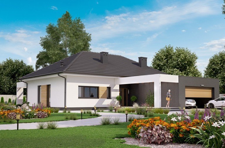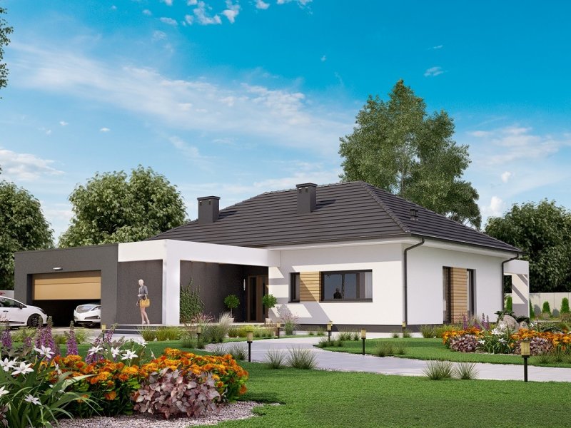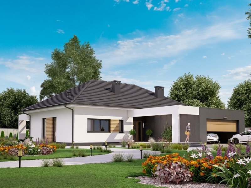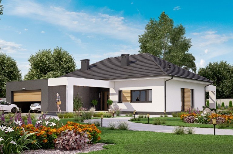 Atutem projektu jest ażurowe zadasznie tarasu, które nie zcienia salonu.
