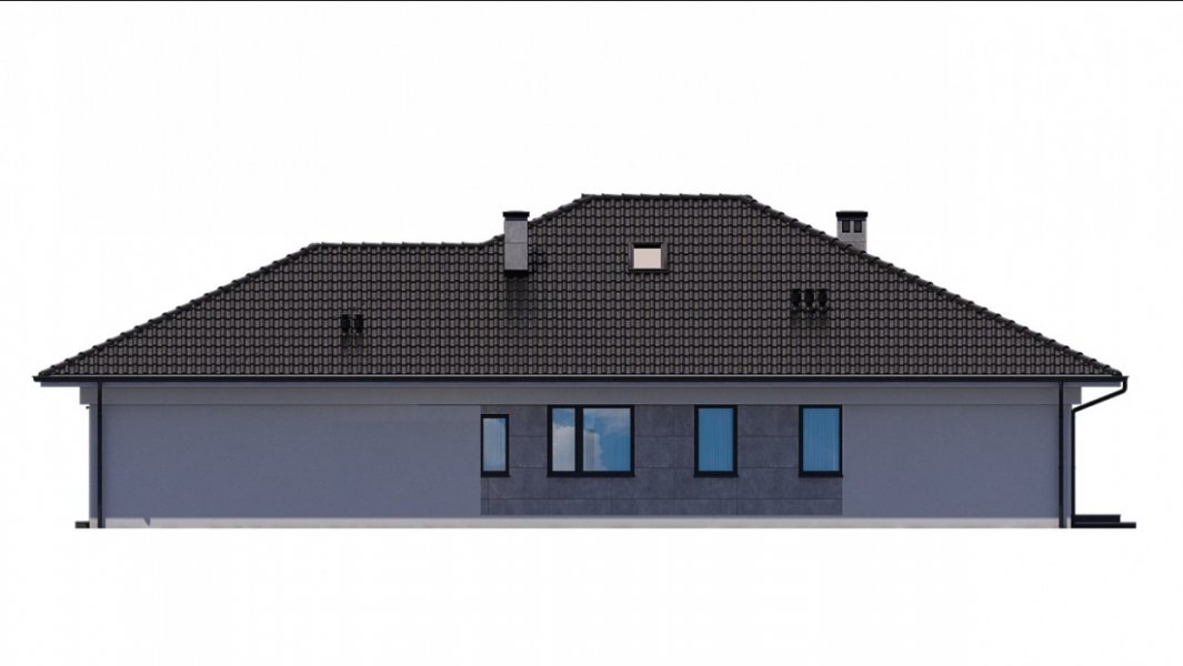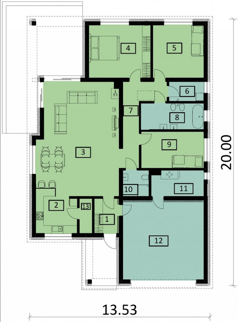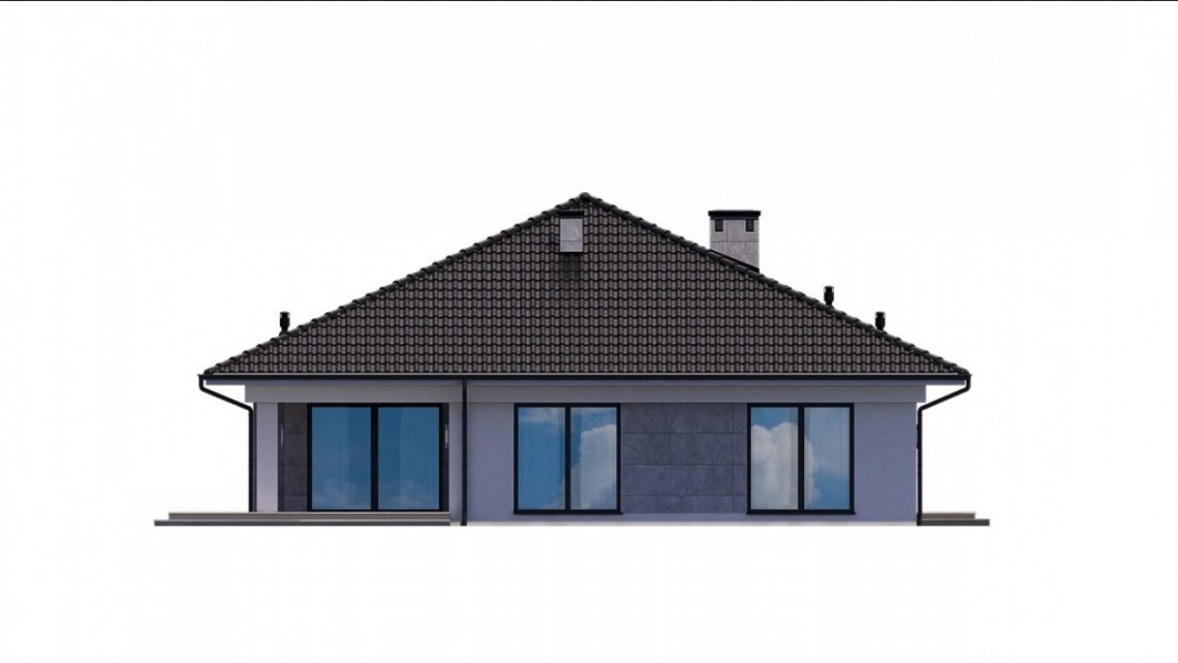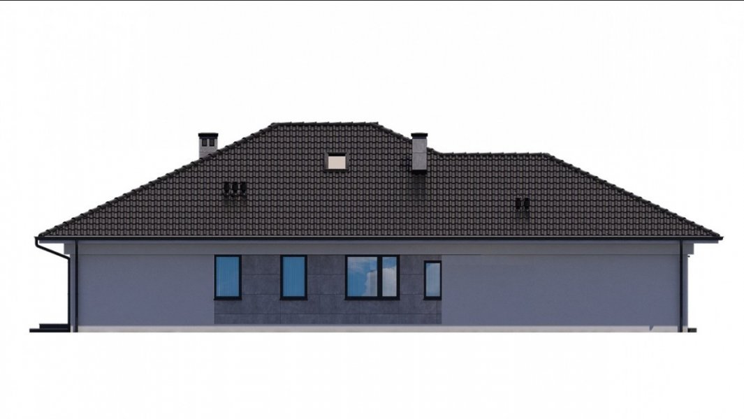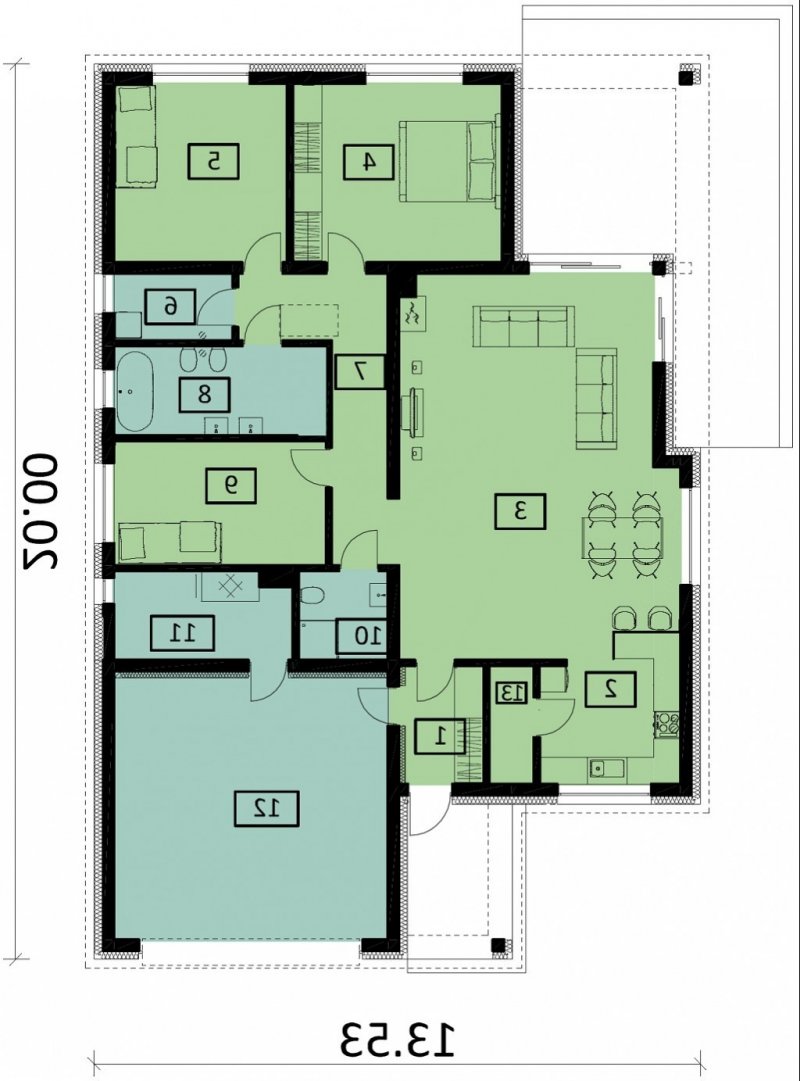 W pozostałej części domu znajdują się 3 duże sypialnie, łazienka oraz toaleta. Dodatkowe pomieszczenia to pralnia, pomieszczenie gospodarcze z przejściem do garażu.