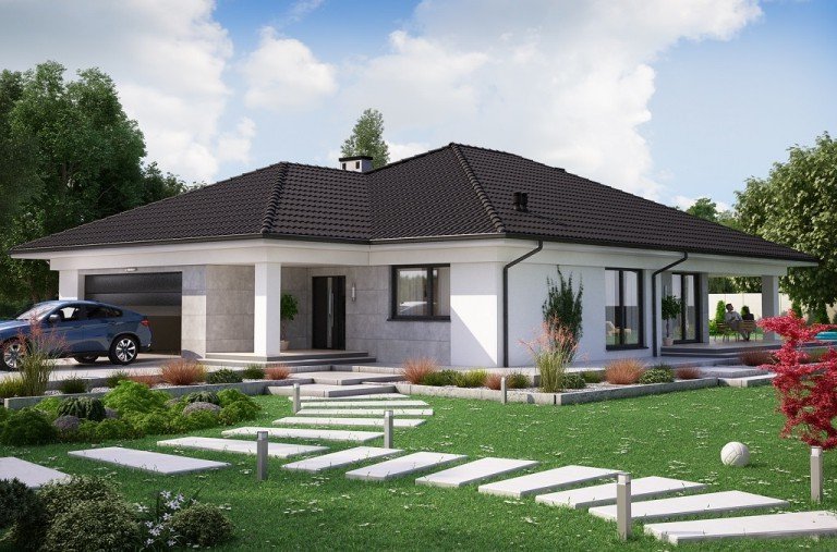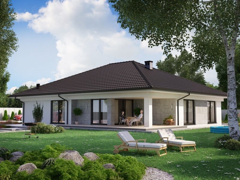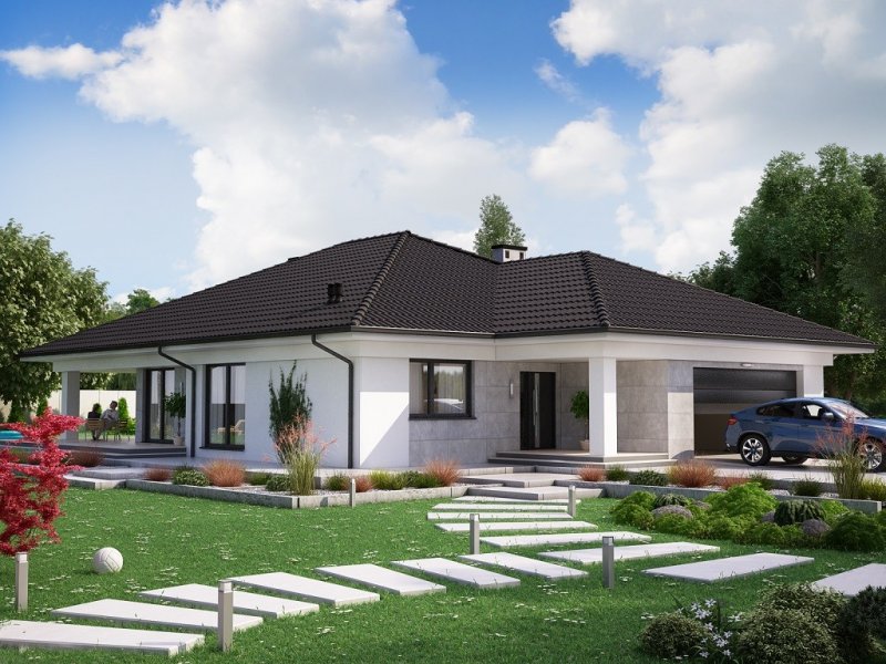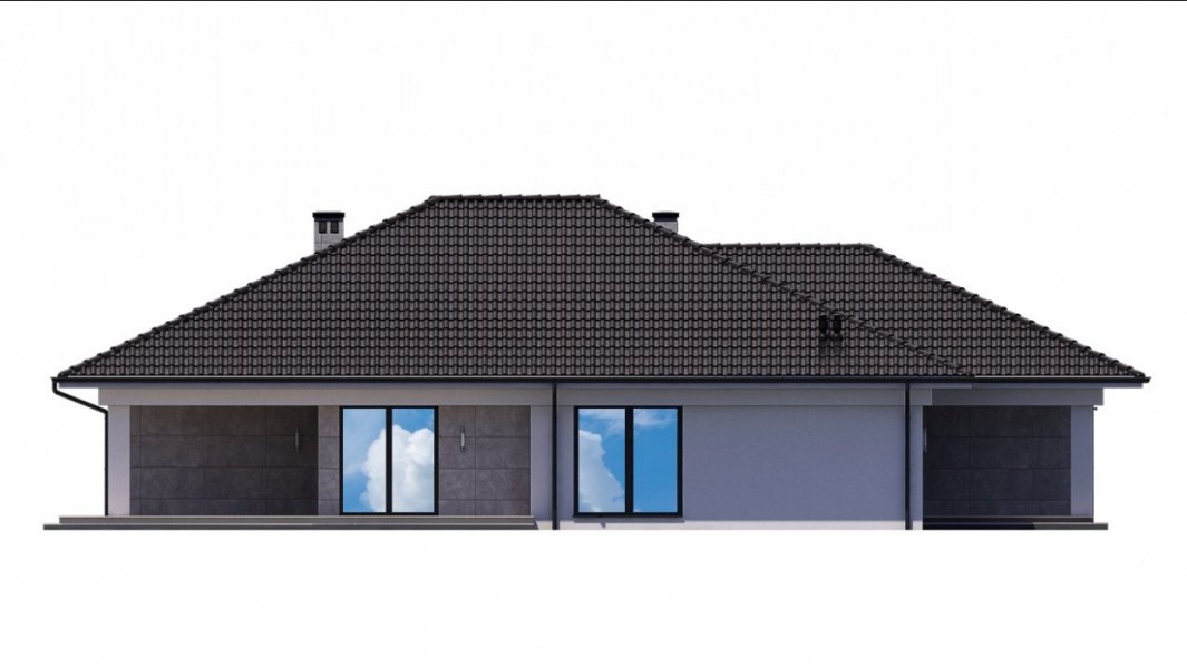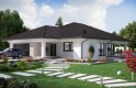 Ka23 ver.1 T to projekt przestronnego domu z dwustanowiskowym garażem, przekryty dachem wielospadowym. Centrum domu to saolon z wyjściem na taras - świetnie sprawdzi się jako miejsce do wspólnego grillowania. Natomiast w chłodniejsze dni spełni swoją rolę kominek w salonie. Ze wspomnianym pomieszczeniem połączona jest jadalnia oraz kuchnia ze spiżarnią.