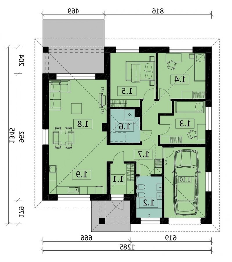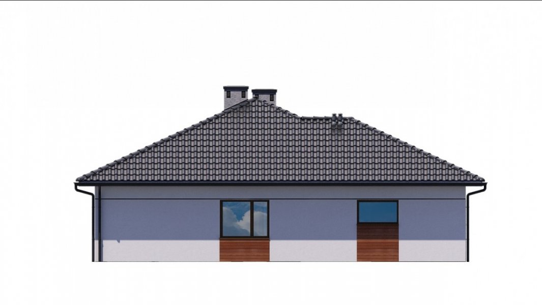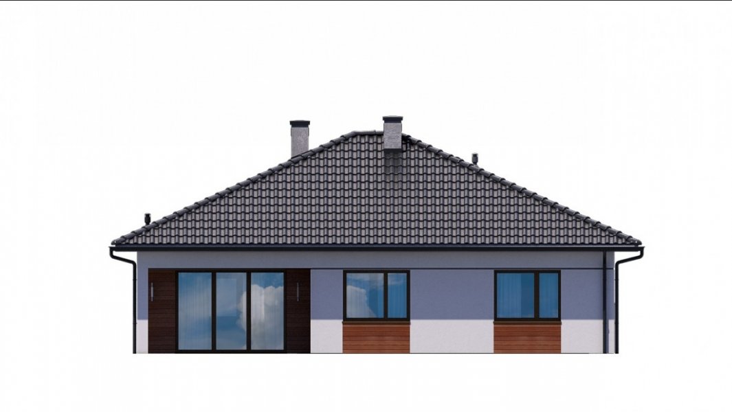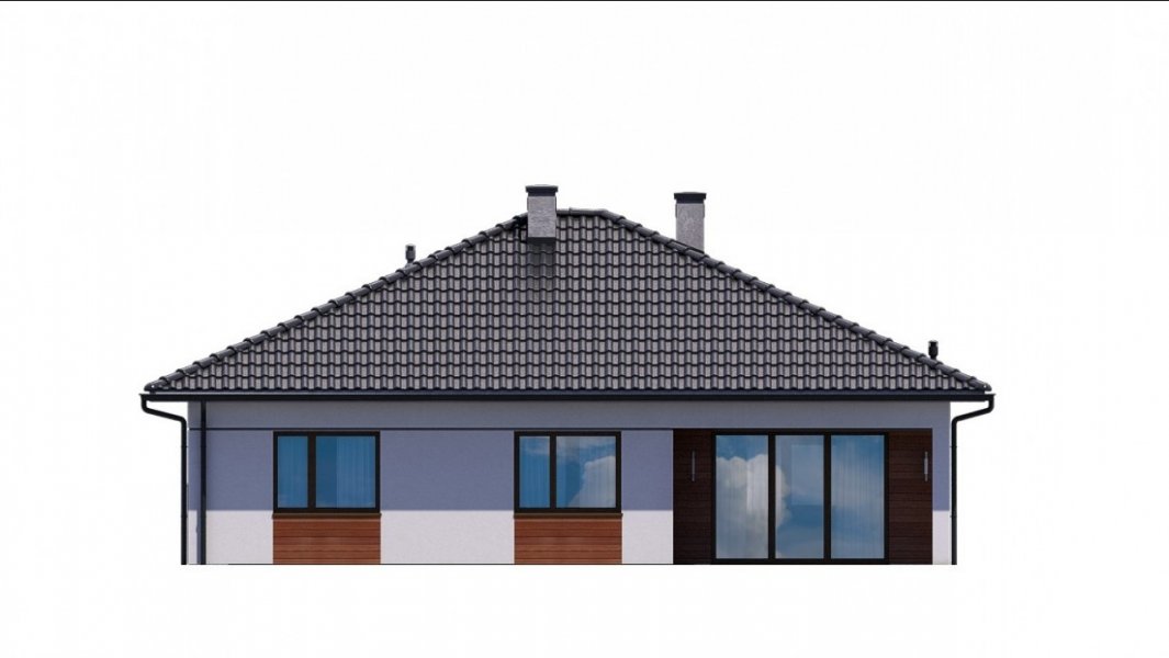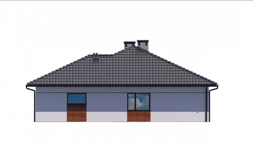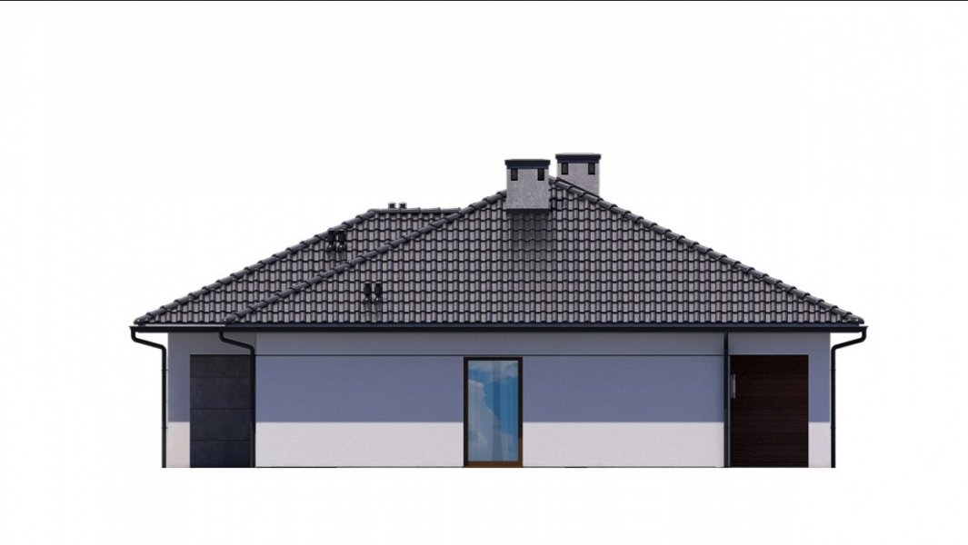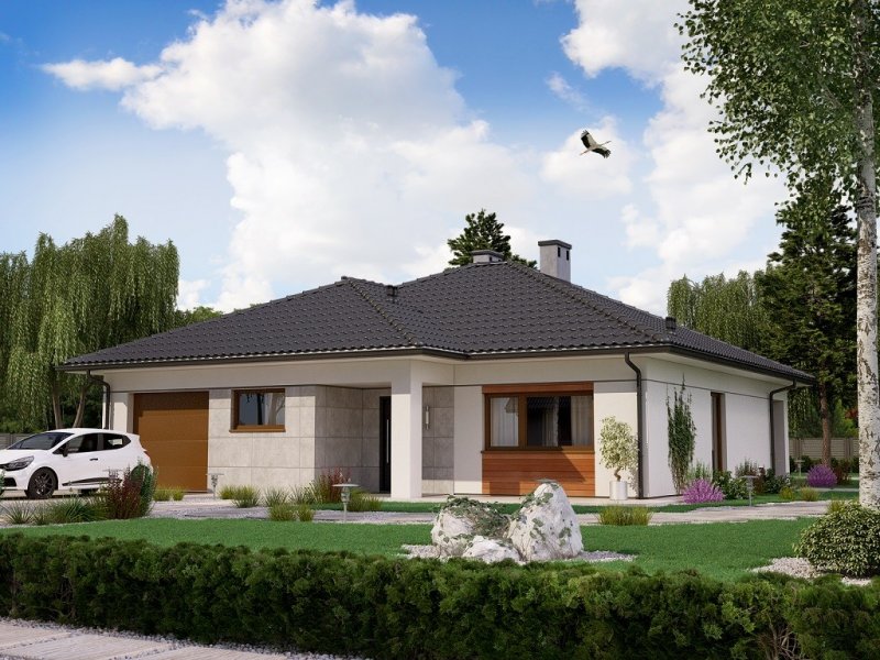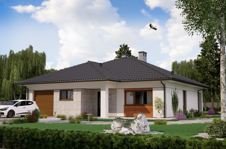 Strefa dzienna, w której zlokalizowano kuchnię oraz salon z jadalnią, oddzielona jest od strefy intymnej z 3 sypialniami. W domu zaprojektowano również łazienkę, pomieszczenie gospodarcze i jednostanowiskowy garaż.