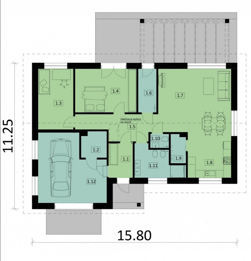 W budynku zlokalizowano dużą kotłownię oraz wydzielono pralnie. Dużym atutem tego domu jest przestronny zadaszony taras. Dodatkowym pomieszczeniem umożliwiającym przechowywanie rzeczy jest strych.