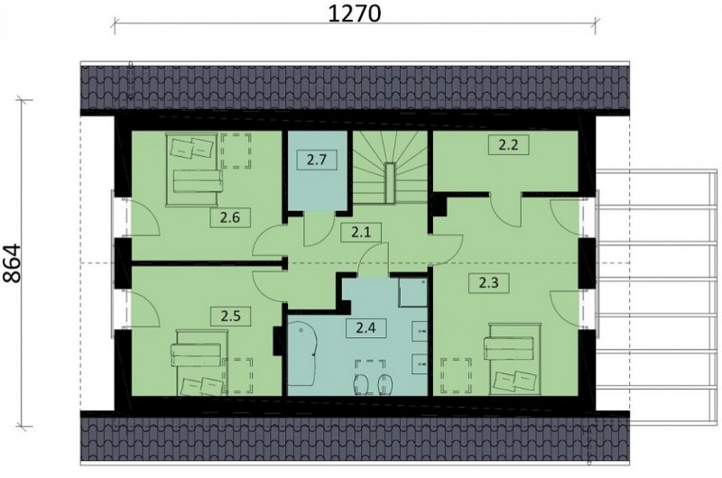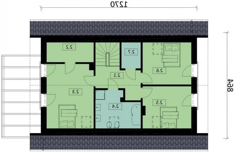 Na poddaszu zlokalizowano trzy sypialnie, dużą łazienkę oraz wydzieloną pralnię.