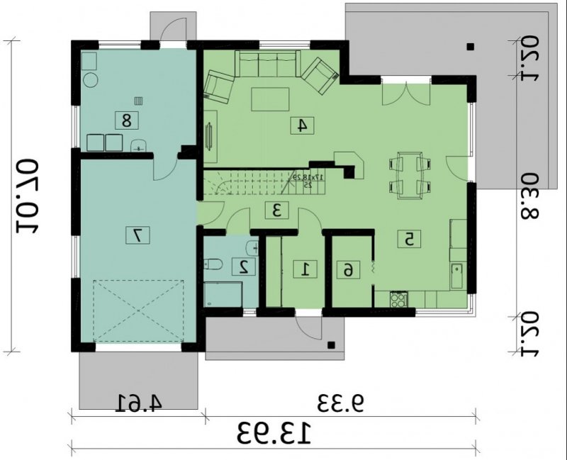 Na parterze znajduje się kuchnia ze spiżarnią, salon z jadalnią, łazienka oraz garaż z przejściem do pomieszczenia gospodarczego.