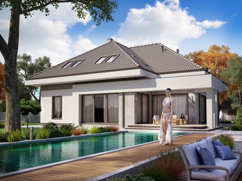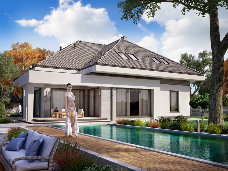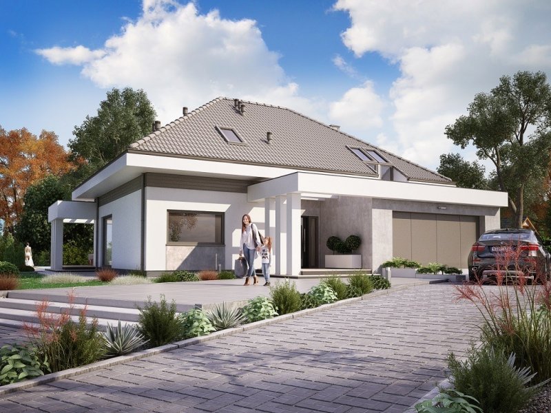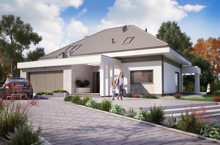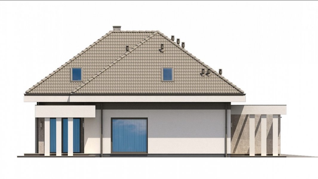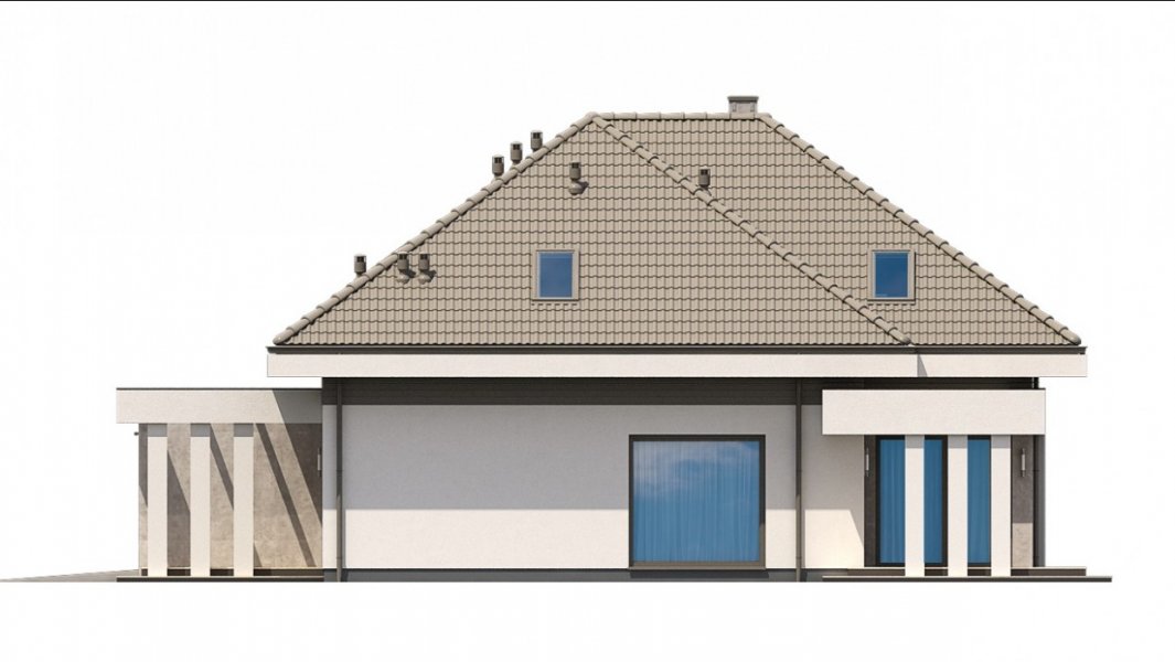 Ka61 projekt domu z użytkowym poddaszem, którego powierzchnię rozplanowano na blisko 183 m2. W strefie dziennej zaprojektowany został przestronny salon z jadalnią o powierzchni 50 m2. Dodatkowo tuż przy schodach wydzielony został pokój, który może pełnić funkcję gabinetu lub pokoju dla gości. Na poddaszu zaprojektowano 3 duże sypialnie, 2 garderoby, łazienkę oraz pralnię. Projekt tego domu jest przestronny i funkcjonalny.