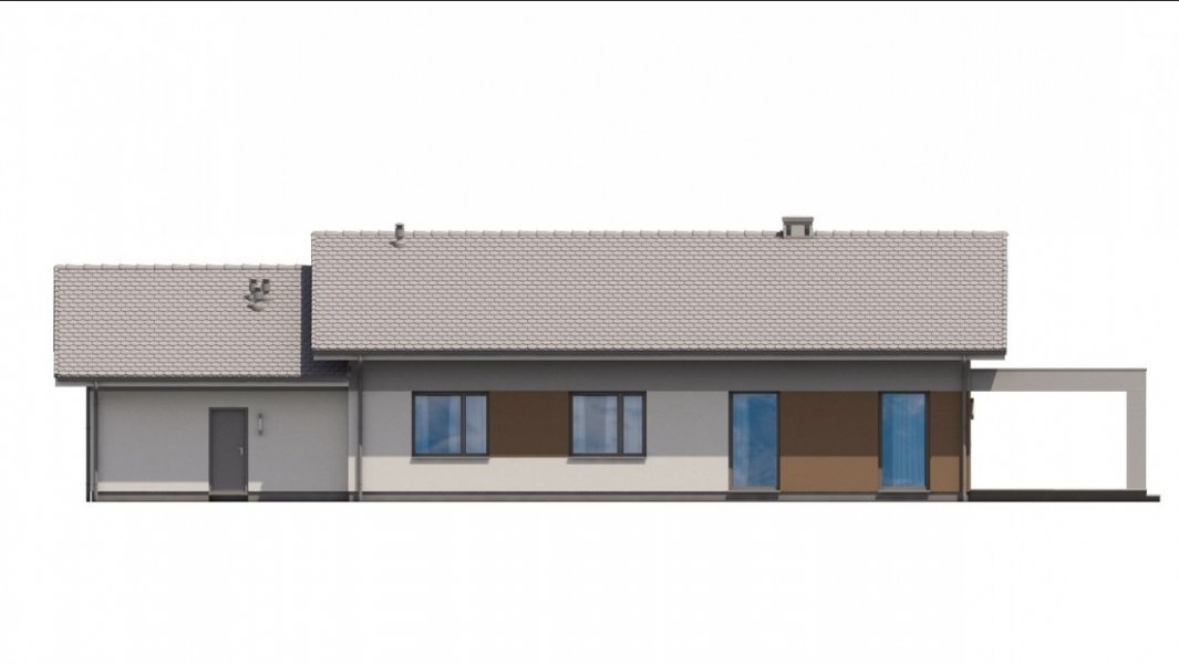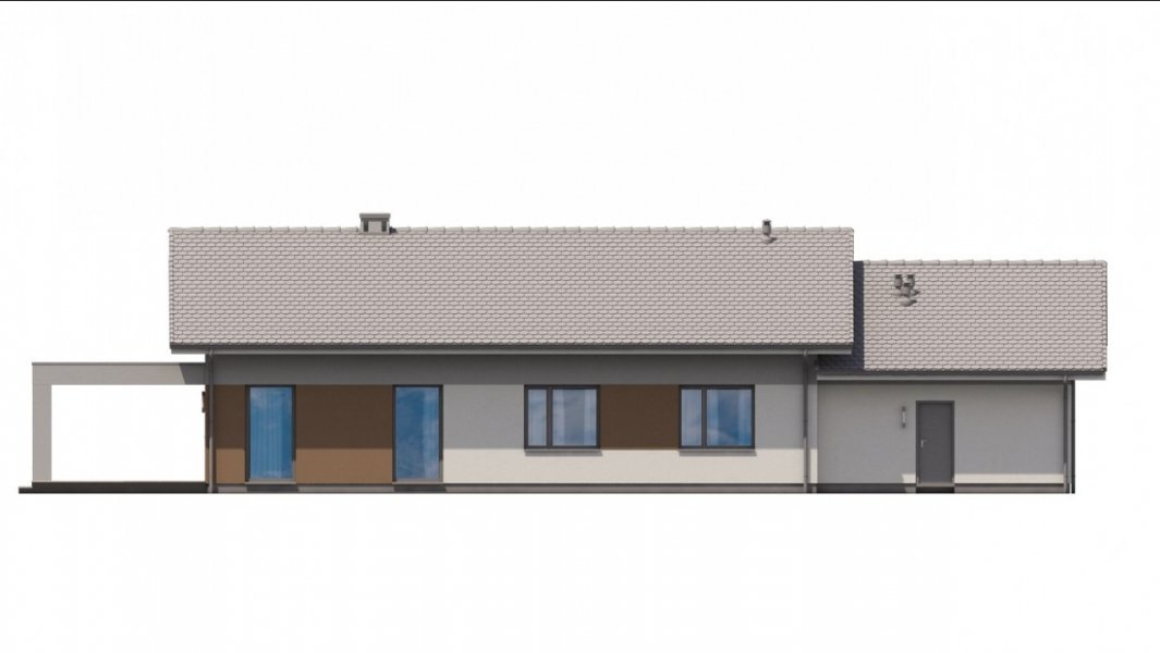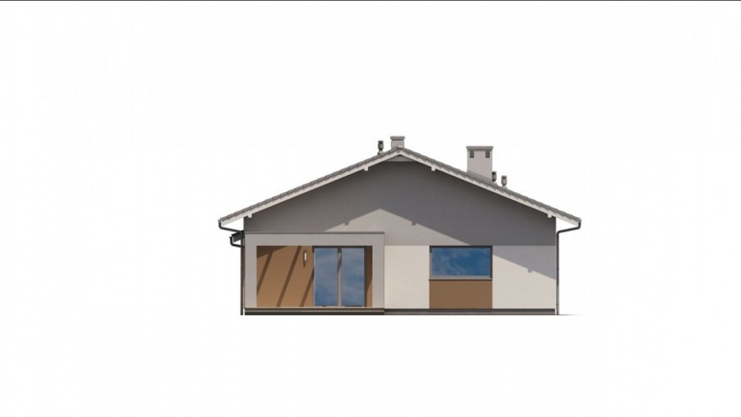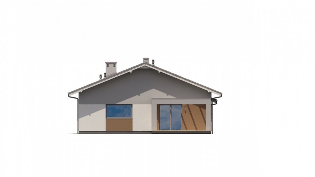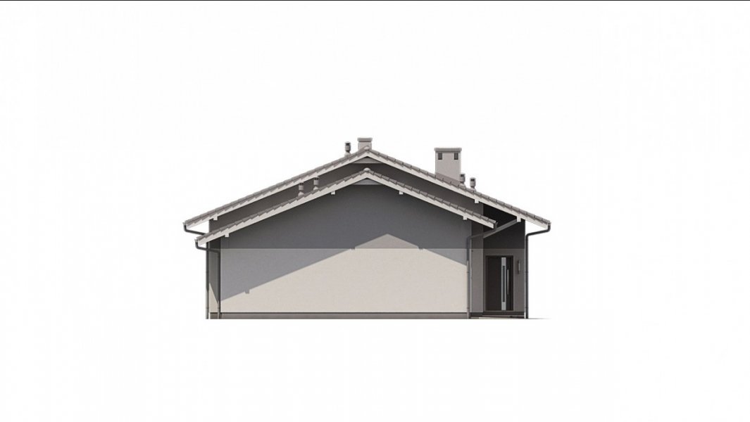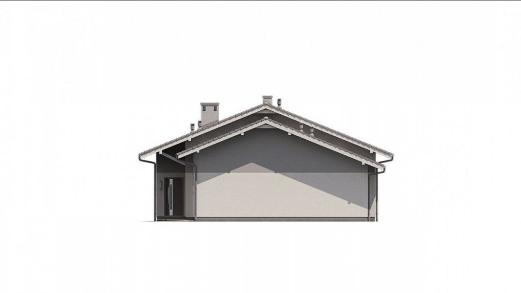 Ka68 projekt domu parterowego z dwuspadowym dachem. Część gospodarcza wydziela jednostanowiskowy garaż oraz pomieszczenie techniczne. Z garażu zaprojektowano przejście do strefy nocnej, w której znajdują się 3 sypialnie i łazienka. Część dzienna to jadalnia, otwarta kuchnia ze spiżarnią, natomiast za ścianką wydzielono przestronny salon. Tuż przy wiatrołapie wydzielono pomieszczenie gospodarcze.