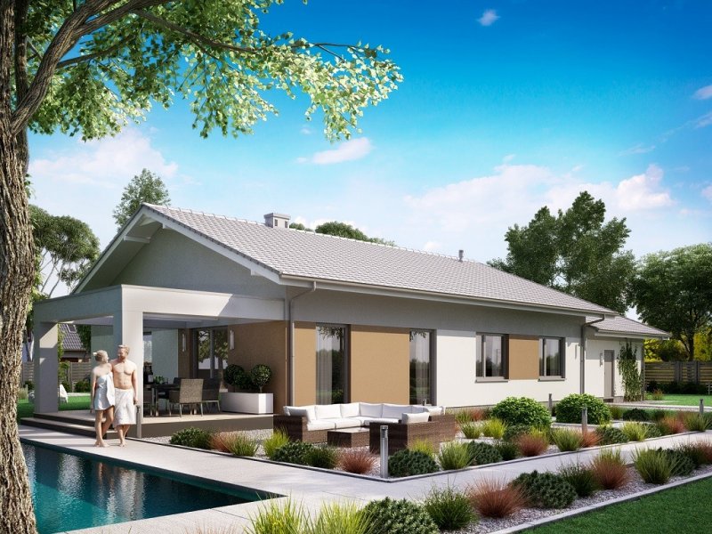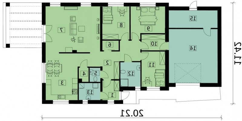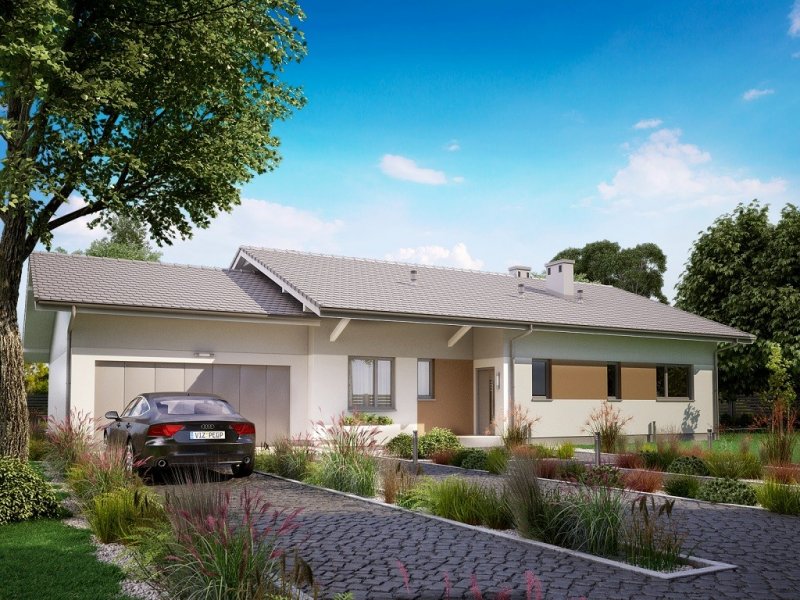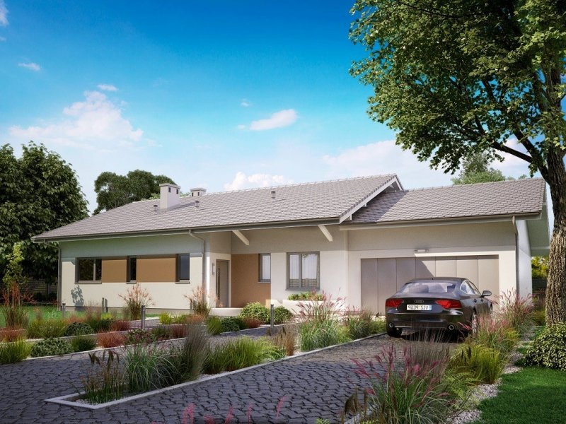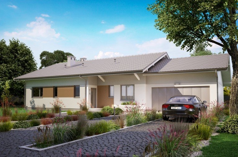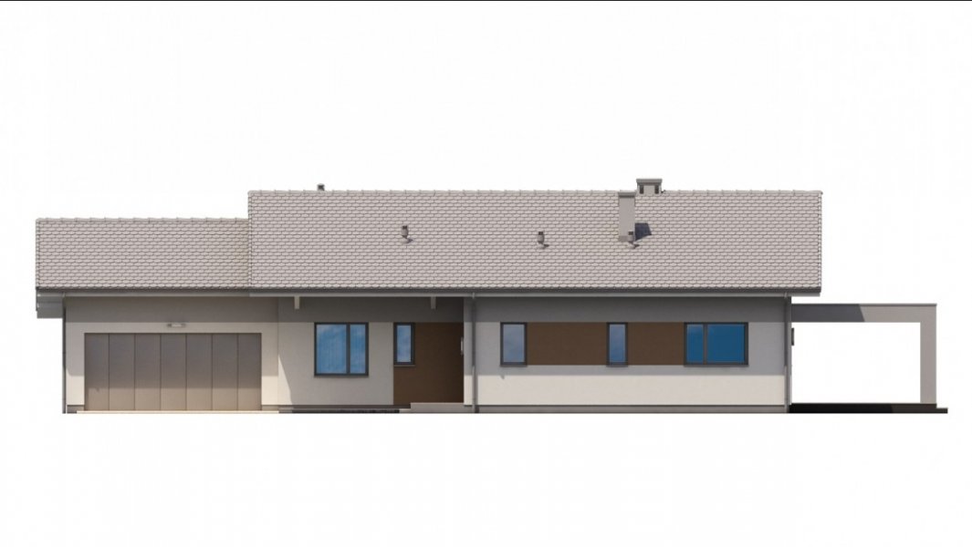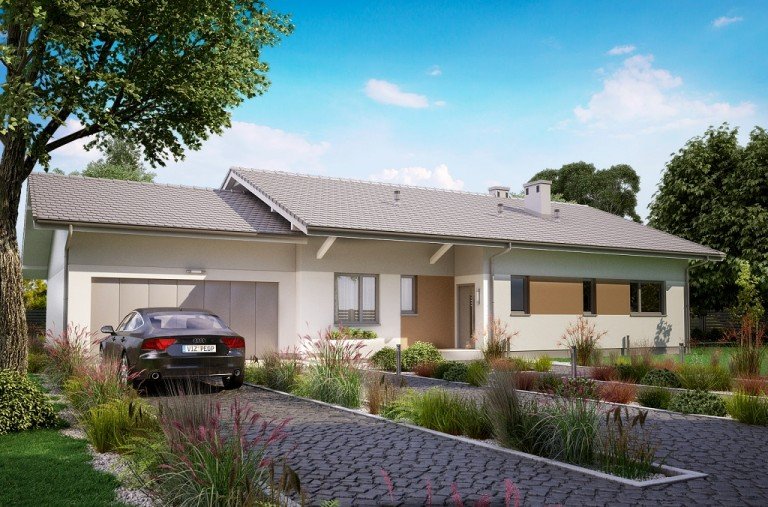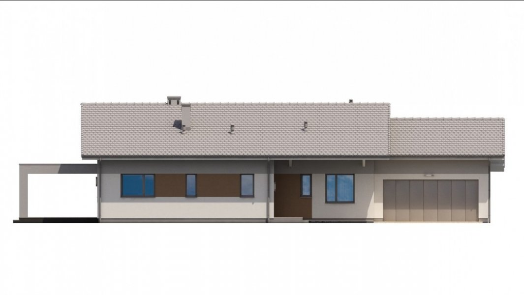 Ka68 projekt domu parterowego z dwuspadowym dachem. Część gospodarcza wydziela jednostanowiskowy garaż oraz pomieszczenie techniczne. Z garażu zaprojektowano przejście do strefy nocnej, w której znajdują się 3 sypialnie i łazienka. Część dzienna to jadalnia, otwarta kuchnia ze spiżarnią, natomiast za ścianką wydzielono przestronny salon. Tuż przy wiatrołapie wydzielono pomieszczenie gospodarcze.