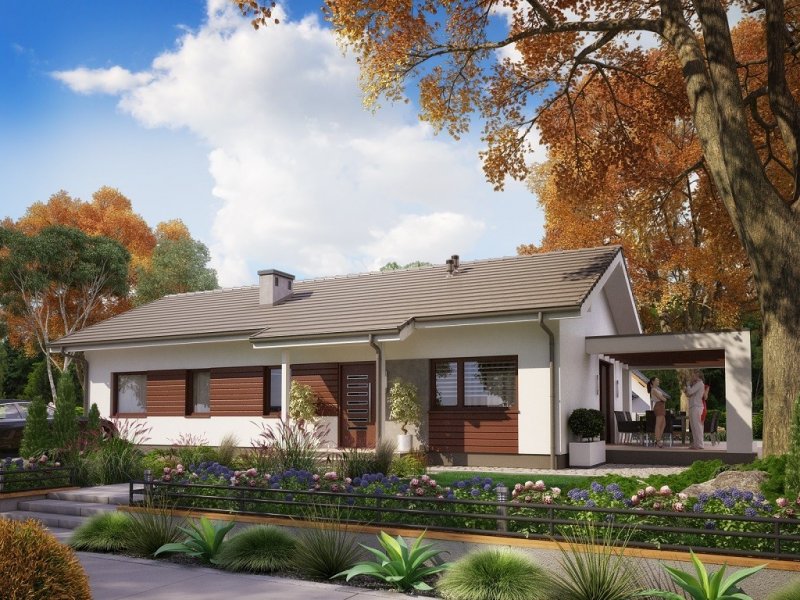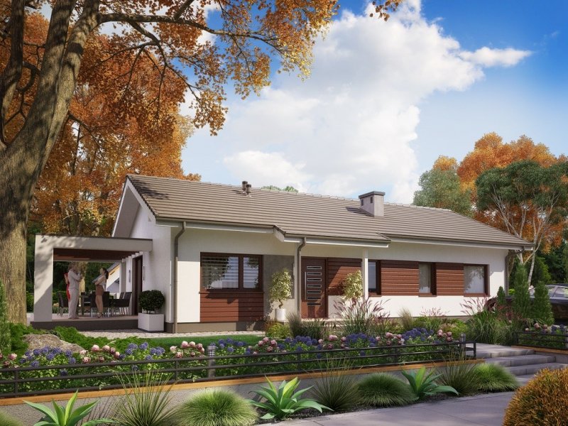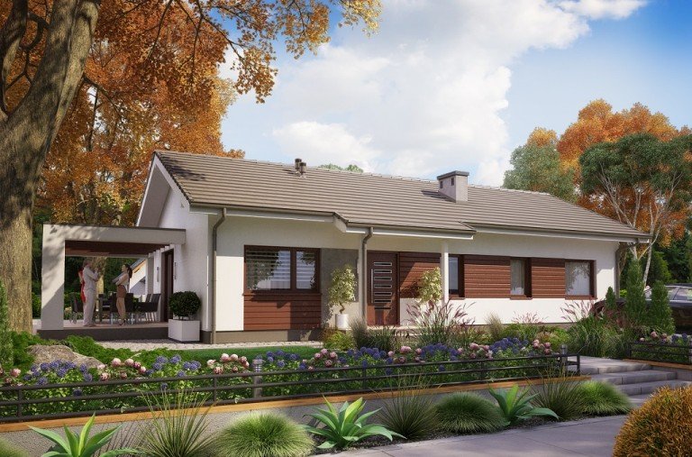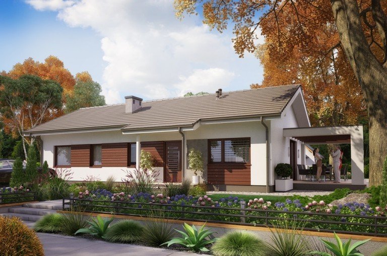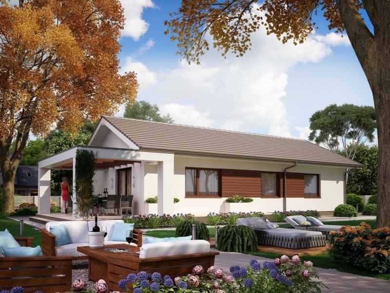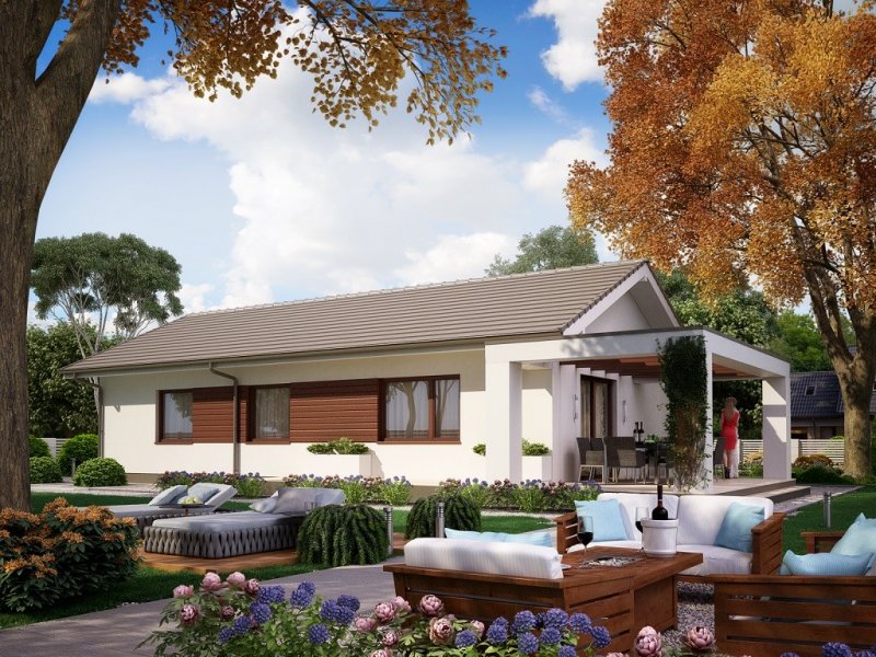 Ka73 to projekt domu parterowego bez garażu. Prosta bryła budynku oraz dwuspadowy dach obniżą koszty budowy domu. Powierzchnia użytkowa została rozplanowana na 83,17 m2. Strefa dzienna to półotwarta kuchnia oraz salon z jadalnią z wyjściem na taras. W strefie nocnej zaprojektowano 3 sypialnie z dużą łazienką.