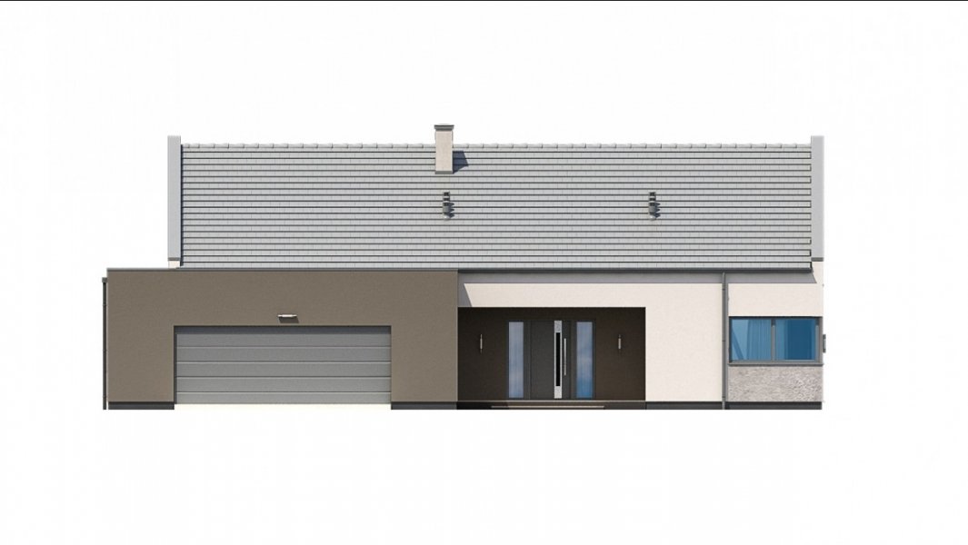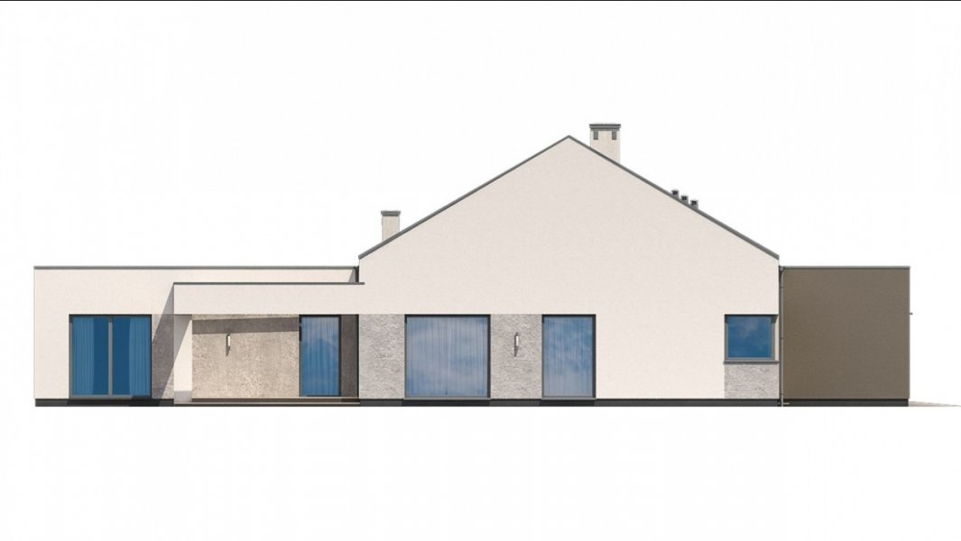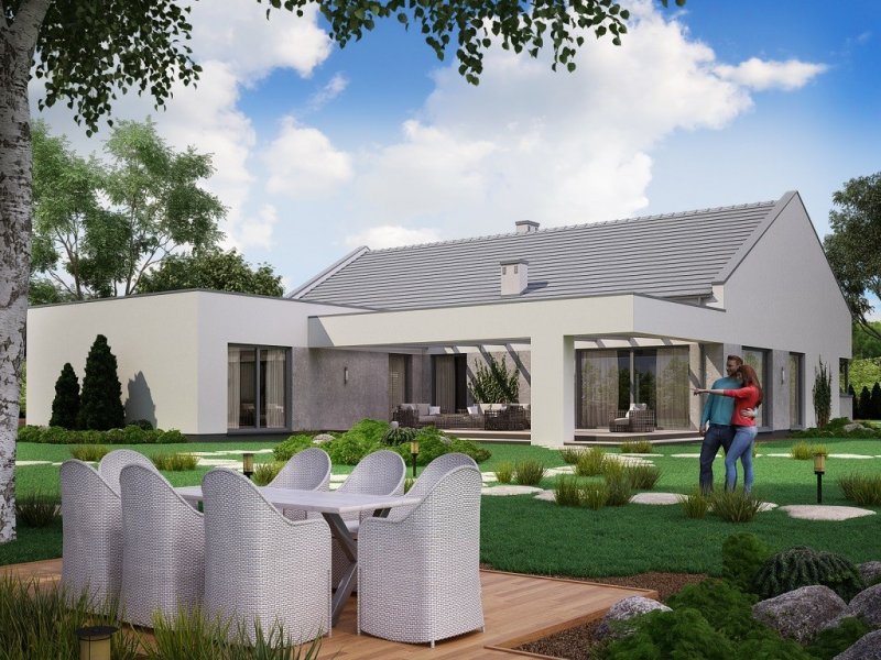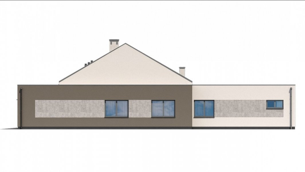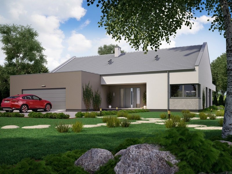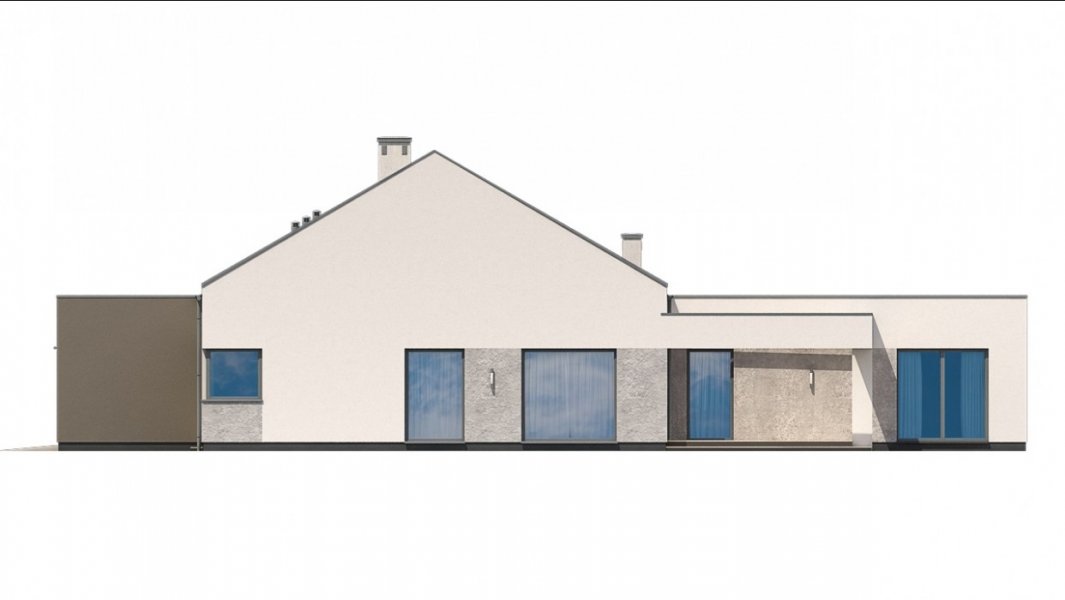 Ka75 przestronny projekt domu parterowego o powierzchni użytkowej blisko 215 m2. W strefie dziennej zaprojektowano otwartą kuchnię na jadalnię oraz salon z kominkiem i antresolą. Strefa nocna została oddzielona korytarzem od pozostałej części domu. Tutaj wydzielono 4 sypialnie, w tym jedną zaprojektowano z prywatną łazienką, garderobą i wyjściem na taras. Atutem są duże przeszklenia, które w pełni doświetlą wnętrze całego domu. W projekcie nie zabraknie części gospodarczej, do której należy garaż o powierzchni ok. 53 m2 oraz pomieszczenie gospodarcze.