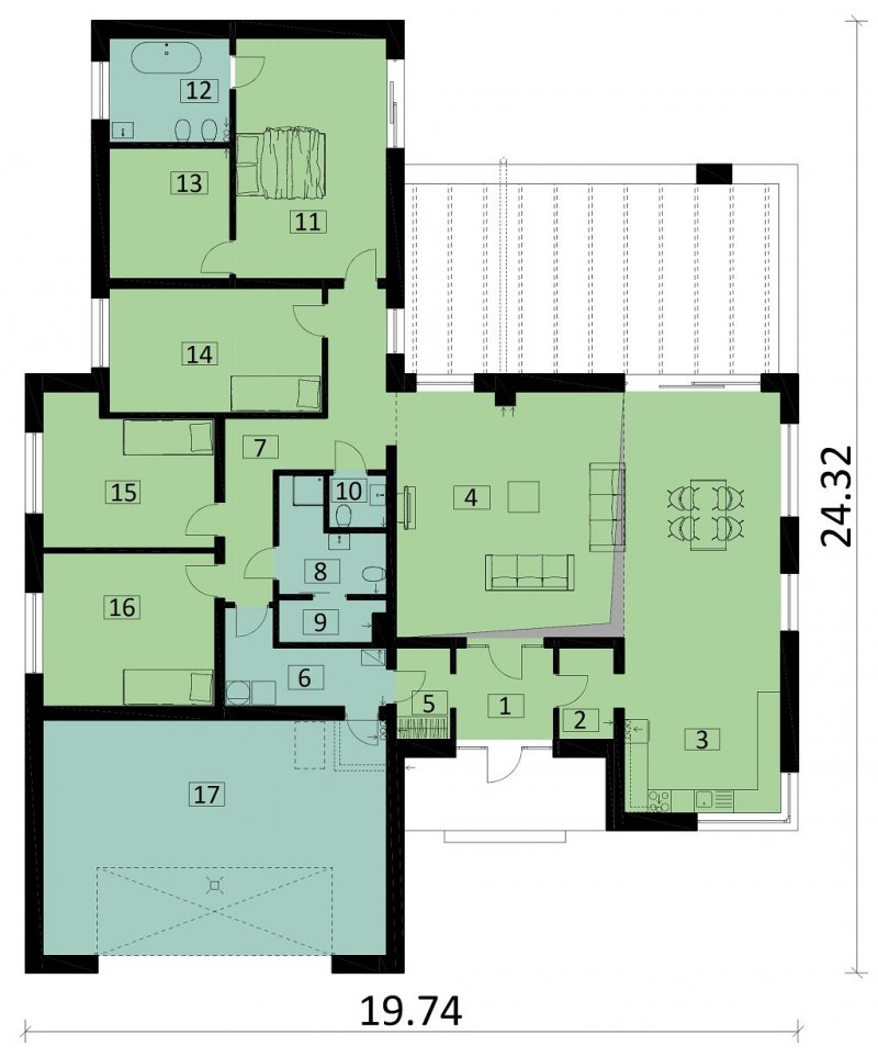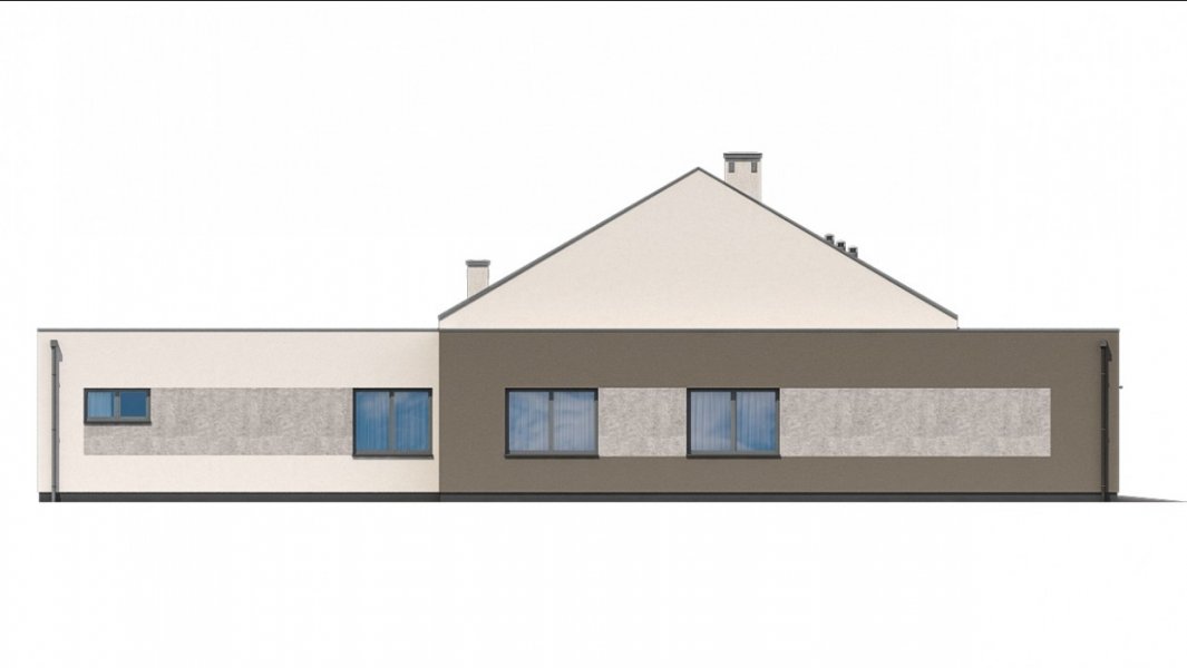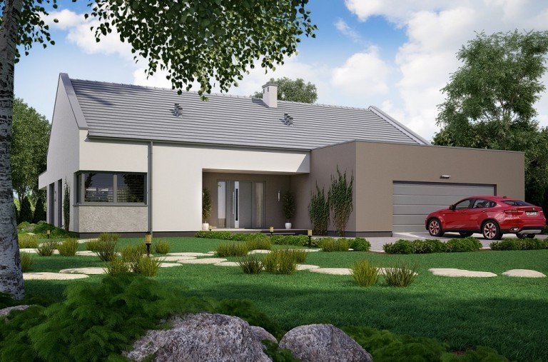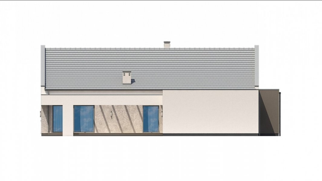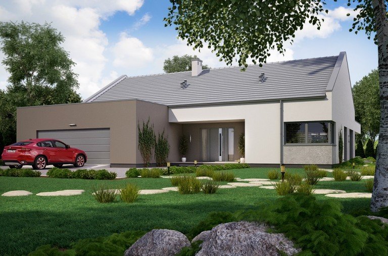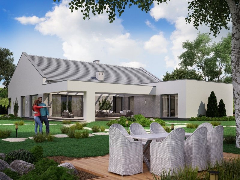 Ka75 przestronny projekt domu parterowego o powierzchni użytkowej blisko 215 m2. W strefie dziennej zaprojektowano otwartą kuchnię na jadalnię oraz salon z kominkiem i antresolą. Strefa nocna została oddzielona korytarzem od pozostałej części domu. Tutaj wydzielono 4 sypialnie, w tym jedną zaprojektowano z prywatną łazienką, garderobą i wyjściem na taras. Atutem są duże przeszklenia, które w pełni doświetlą wnętrze całego domu. W projekcie nie zabraknie części gospodarczej, do której należy garaż o powierzchni ok. 53 m2 oraz pomieszczenie gospodarcze.