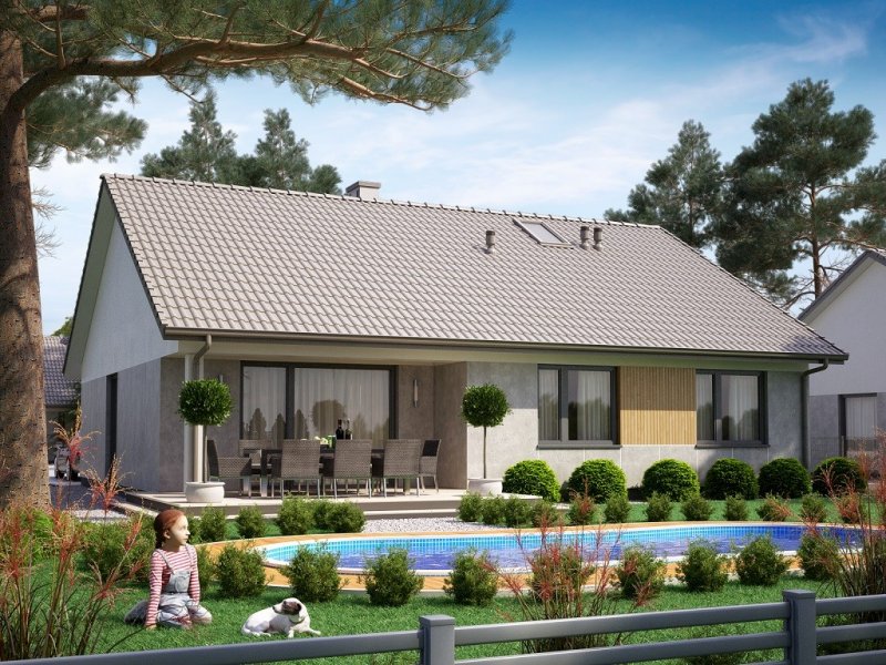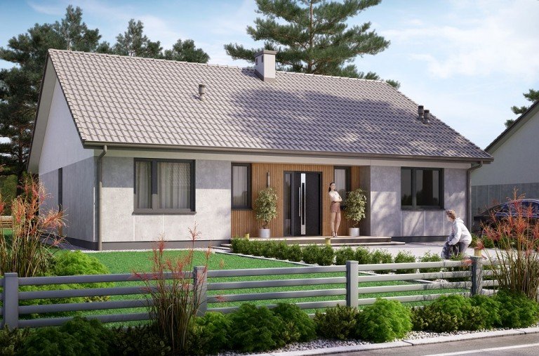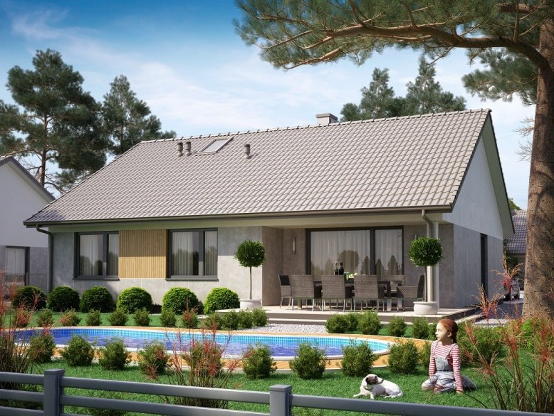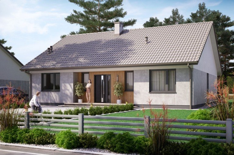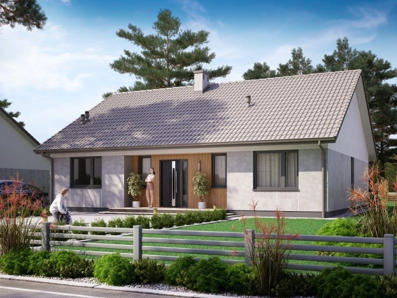 Ka78 to niewielki projekt domu parterowego bez garażu. Jego prosta bryła oraz dwuspadowy dach, obniżą koszty budowy domu. W domu zostały zaprojektowane najbardziej potrzebne pomieszczenia. Strefa dzienna to otwarta przestrzeń z wyjściem na taras. Natomiast strefę nocną oddziela korytarz, w której znajdują się 3 sypialnie, łazienka, kotłownia oraz toaleta.