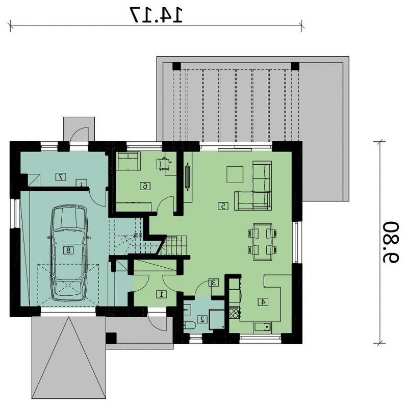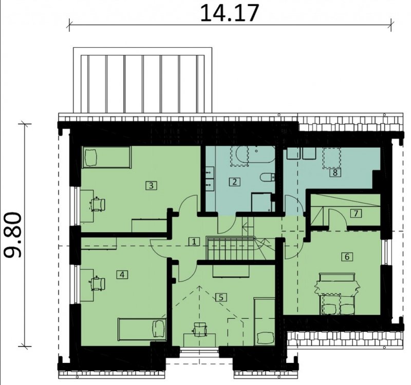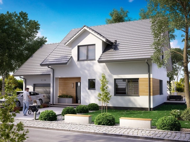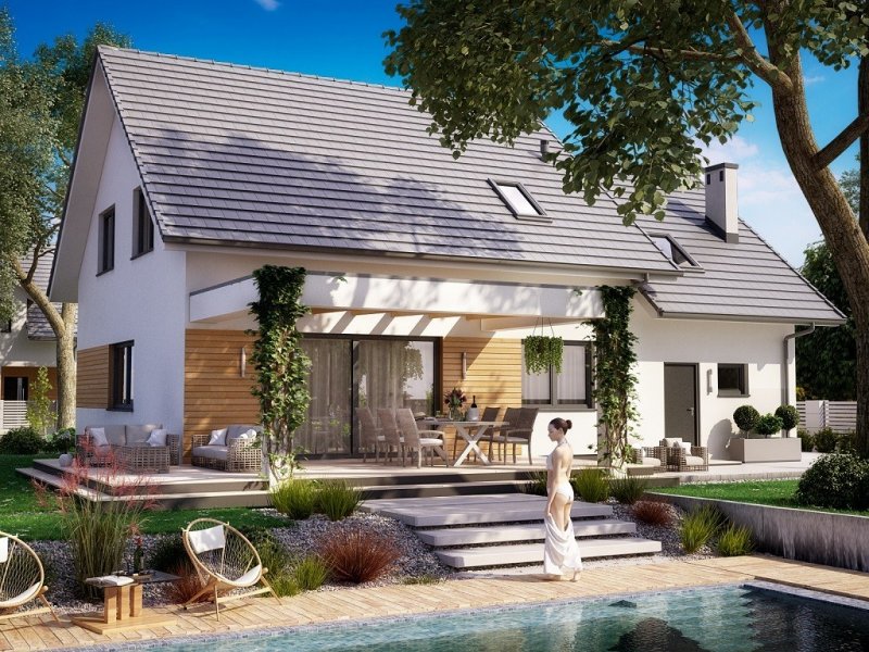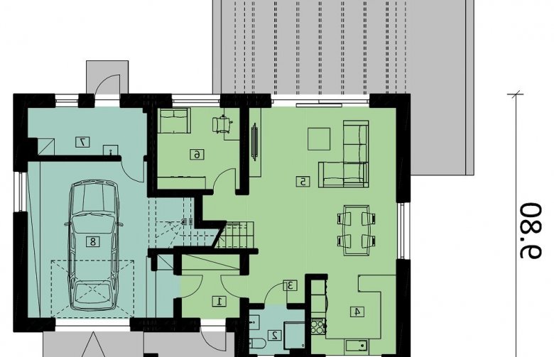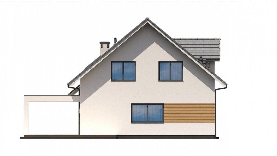 Ka80 to przestronny projekt domu parterowego z użytkowym poddaszem. Powierzchnia użytkowa została rozplanowana na 145,71 m2. Parter to strefa dzienna, gdzie zaprojektowano salon z jadalnią, otwartą kuchnię oraz łazienkę. Udogodnieniem jest gabinet w sąsiedztwie schodów i salonu, który może pełnić funkcję pokoju gościnnego. Na poddaszu przewidziano wykonanie 4 sypialni, łazienki, pralni oraz garderoby. Strefa gospodarcza to jednostanowiskowy garaż oraz pomieszczenie gospodarcze z dodatkowym wejściem.