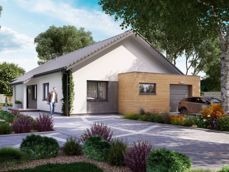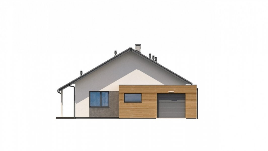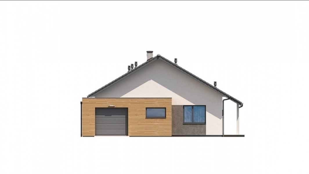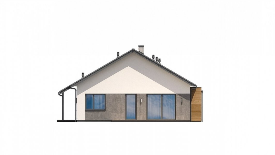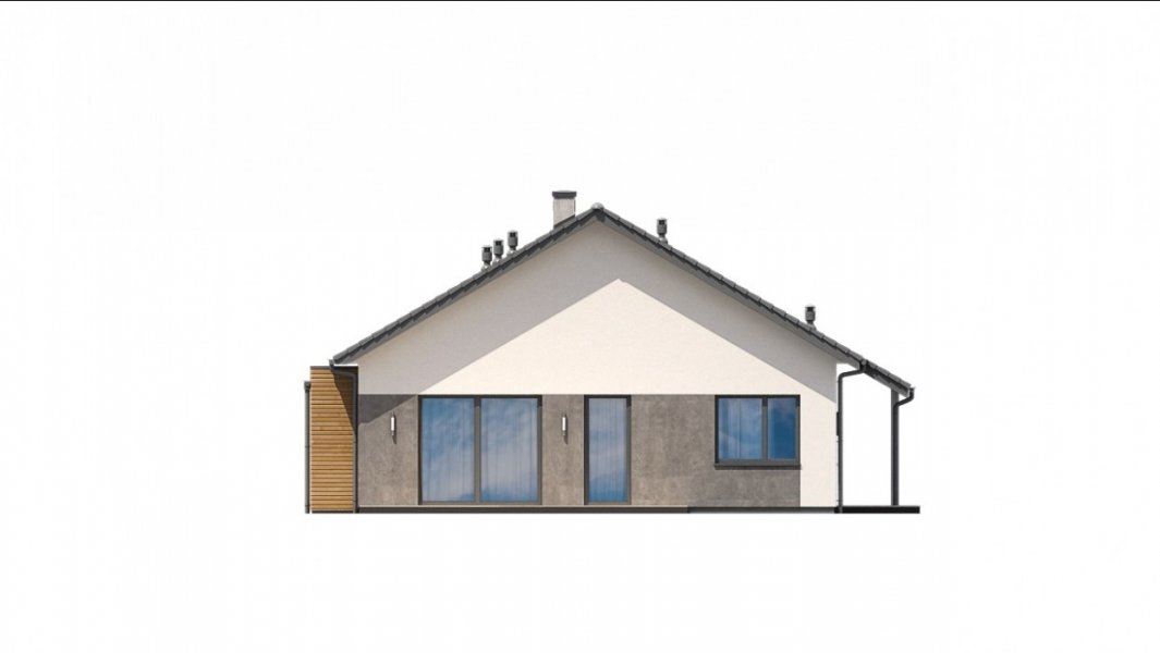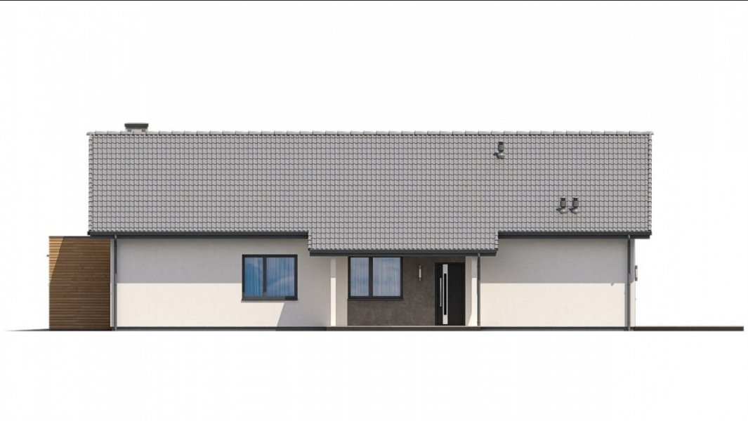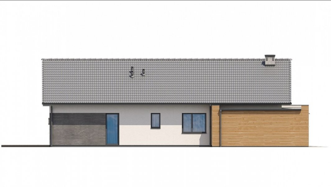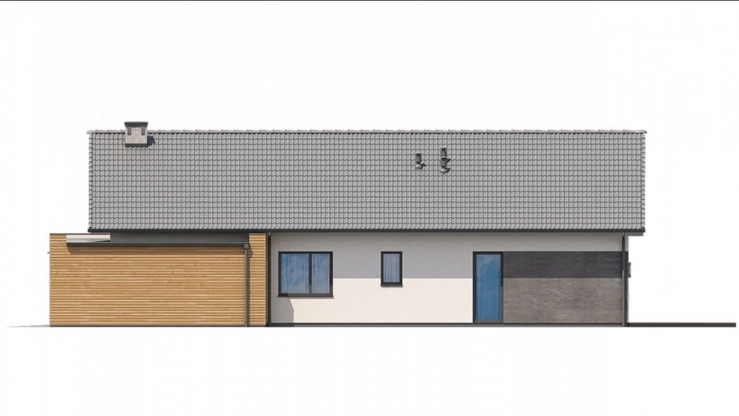 Ka83 new nowoczesny projekt domu parterowego, którego wnętrze zaprojektowane zostało na 121,61 m2 powierzchni użytkowej. Do wnętrza prowadzi wiatrołap z miejscem na garderobę. Po lewej stronie znajduje się kuchnia z wydzieloną spiżarnią oraz salon i jadalnia - stąd okno przesuwne prowadzi na taras. W drugiej części domu znajduje się gabinet, łazienka, toaleta oraz 3 sypialnie. W pobliżu tych pokoi zaprojektowano pomieszczenie gospodarcze, w którym wyodrębniono przejście do garażu.