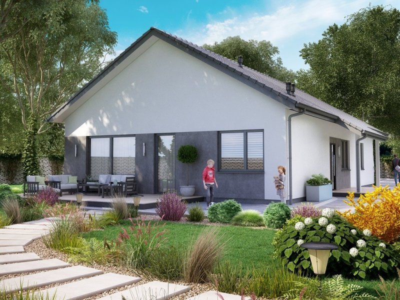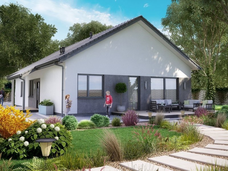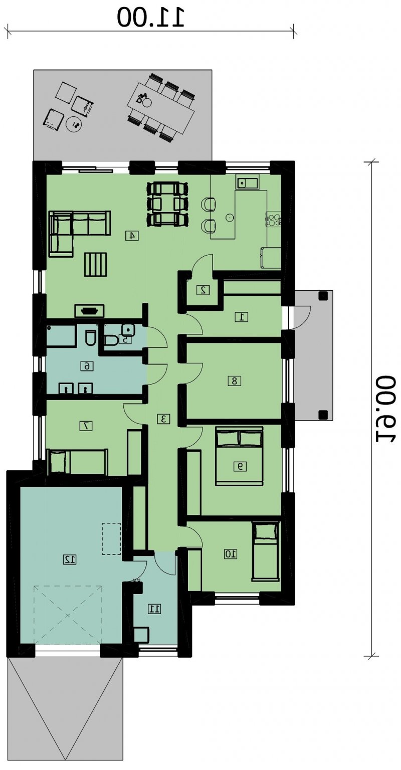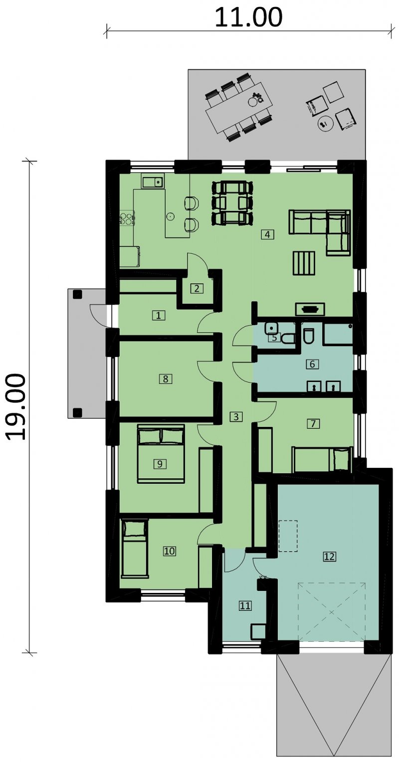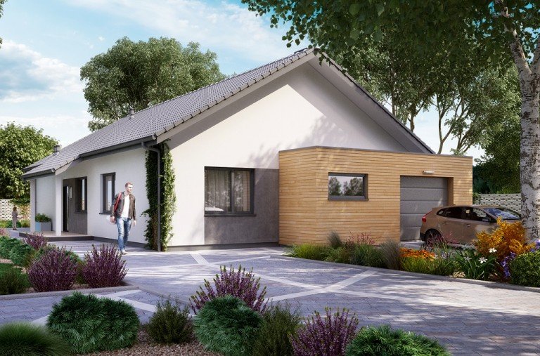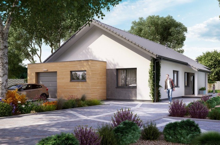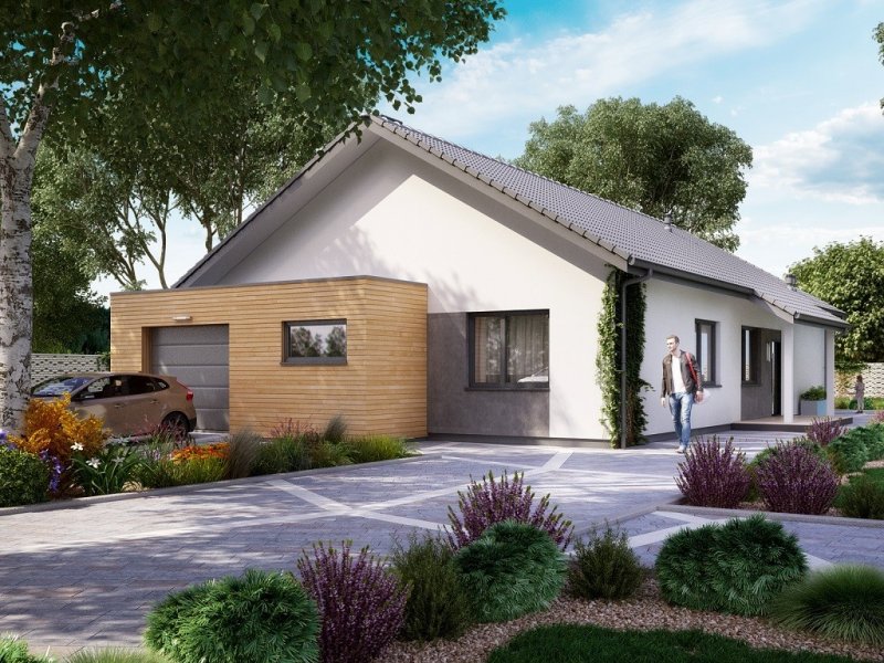 Ka83 new nowoczesny projekt domu parterowego, którego wnętrze zaprojektowane zostało na 121,61 m2 powierzchni użytkowej. Do wnętrza prowadzi wiatrołap z miejscem na garderobę. Po lewej stronie znajduje się kuchnia z wydzieloną spiżarnią oraz salon i jadalnia - stąd okno przesuwne prowadzi na taras. W drugiej części domu znajduje się gabinet, łazienka, toaleta oraz 3 sypialnie. W pobliżu tych pokoi zaprojektowano pomieszczenie gospodarcze, w którym wyodrębniono przejście do garażu.