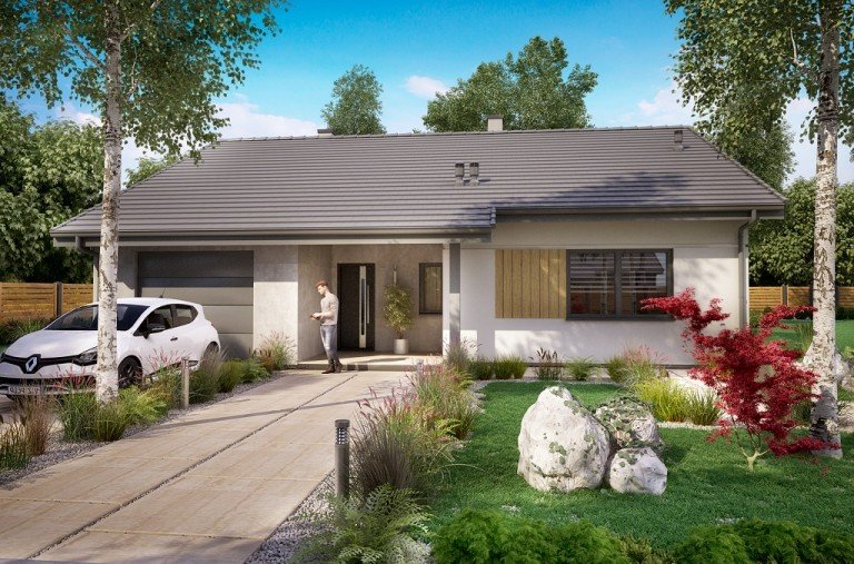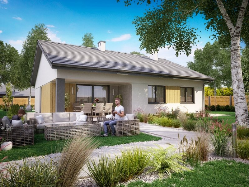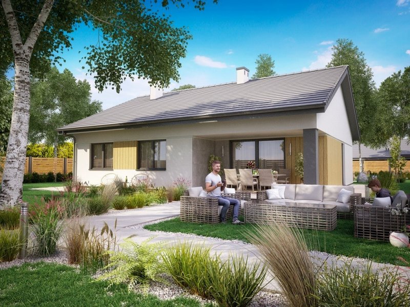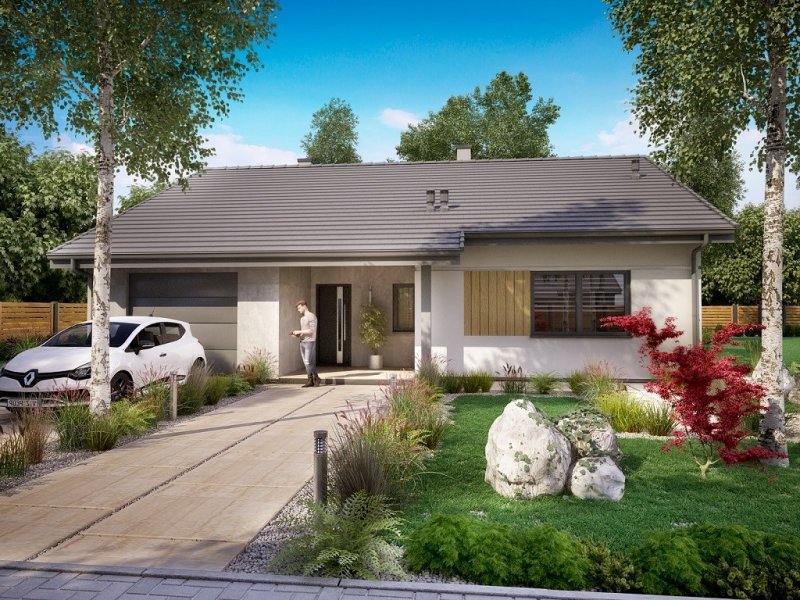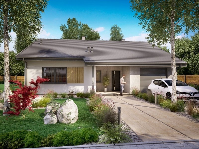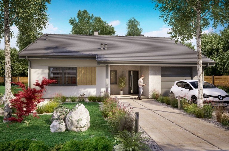 Ka84 to niedrogi w budowie projekt domu parterowego z dwuspadowym dachem. Jego powierzchnia użytkowa została rozplanowana na 83,64 m2. W strefie dziennej znajduje się otwarta kuchnia, jadalnia oraz salon. Część nocna to dwie przestronne sypialnie. W bryle domu zaprojektowany został również jednostanowiskowy garaż wraz z pomieszczeniem gospodarczym.