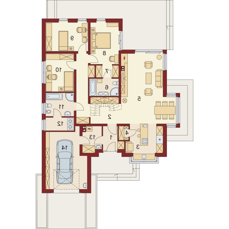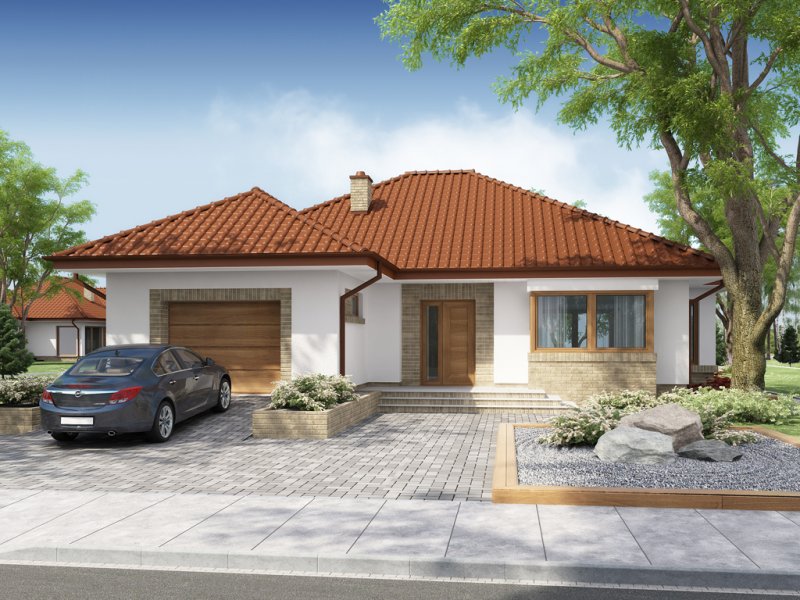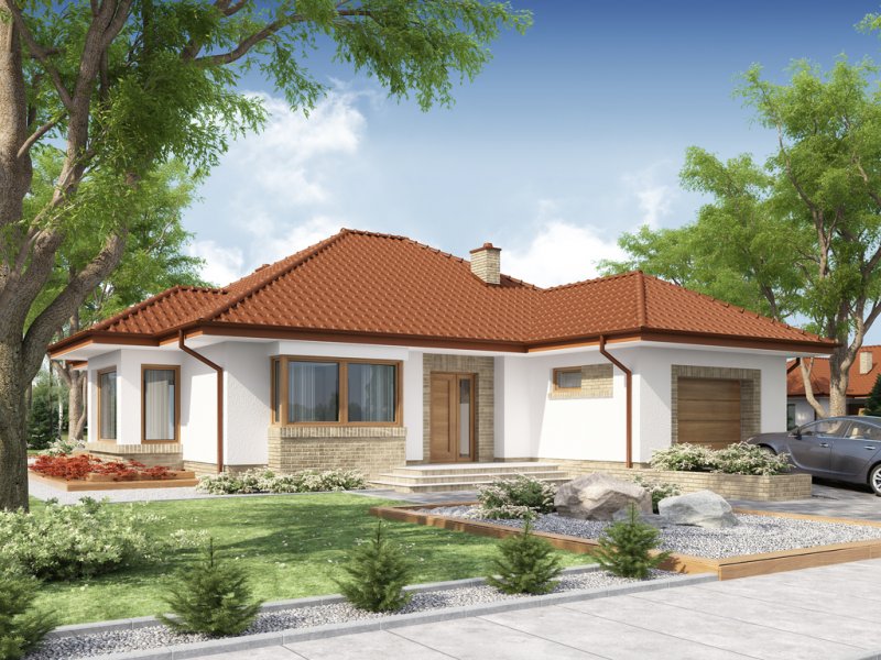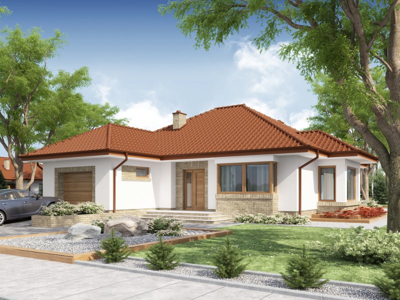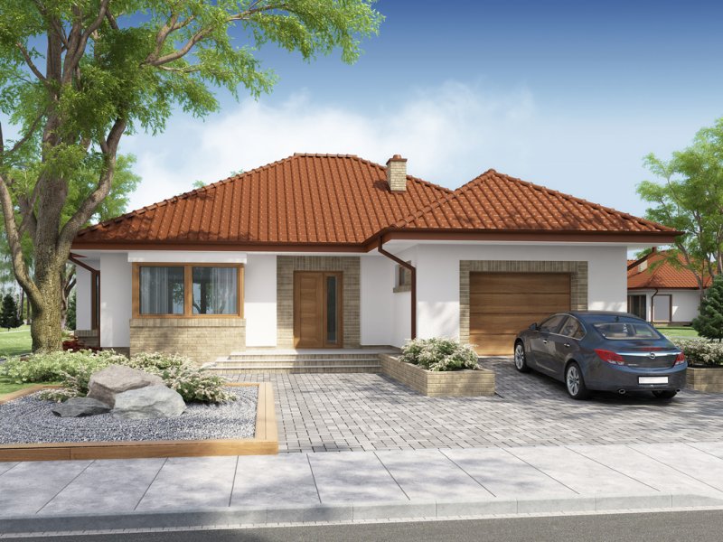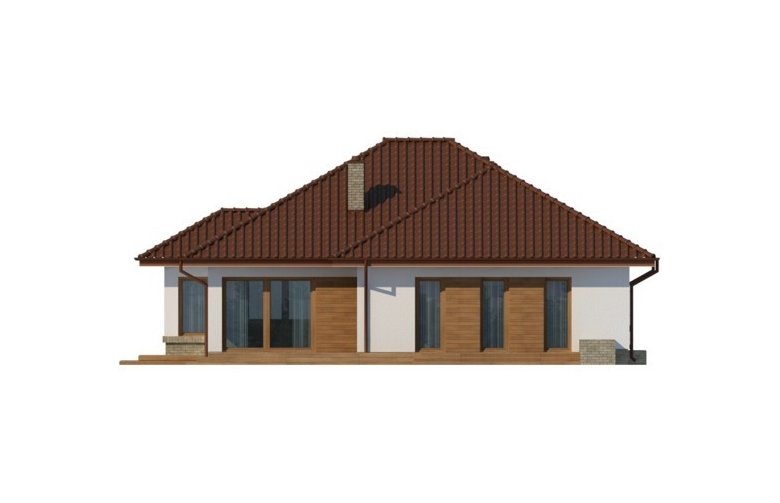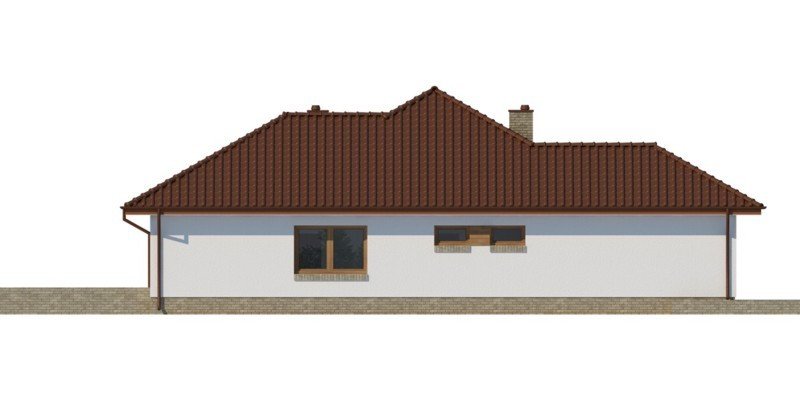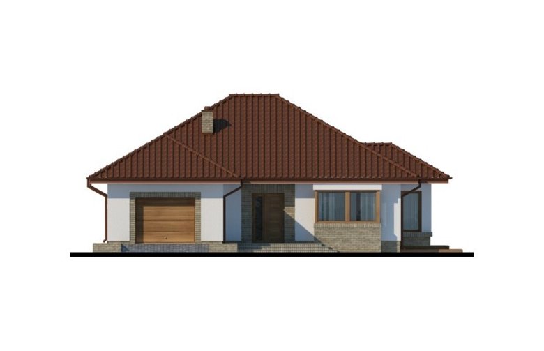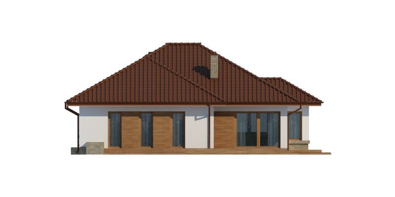 Kasandra to dom parterowy zaprojektowany dla rodziny 4-5-osobowej. Mimo nowoczesnej architektury, podkreślonej dużymi przeszkleniami i wykuszami, budynek sprawia wrażenie przytulnego i gościnnego. Po minięciu praktycznego podcienia przed głównym wejściem do domu, przechodząc przez wiatrołap, wkraczamy do strefy dziennej budynku. Stanowi ją otwarta przestrzeń, z której bez trudu wyodrębnić można salon z kominkiem, ograniczoną dużym przeszkleniem jadalnię oraz kuchnię. Szczególnie atrakcyjnie kształtuje się ta ostatnia, wyposażona w wyspę kuchenną, spiżarnię oraz blat roboczy umieszczony w ciekawy sposób w przeszklonym wykuszu. Można ją także prostymi środkami przekształcić, np. rezygnując ze spiżarni dostawić dodatkowy blat kuchenny, powiększając jednocześnie wiatrołap o miejsce dla szaf, czy dostawiając ściankę działową, z kuchni otwartej zrobić zamkniętą. W drugiej części domu mieści się strefa nocna. Składają się na nią trzy pokoje, w tym dwa z nich z osobnym wyjściem na przestronny taras. Jedna z sypialni posiada indywidualną łazienkę oraz wydzieloną przestrzeń na szafy, kosztem której możemy powiększyć bądź łazienkę, bądź samą sypialnię. Przy ogólnodostępnej łazience znajduje się pralnia, z której rezygnując zyskujemy przestronny salon kąpielowy. Strefa pomocnicza z kotłownią i garażem dostępna jest bezpośrednio z wiatrołapu. W hallu głównym, w przestrzeni oryginalnie przeznaczonej na szafy, można zamiennie usytuować schody, prowadzące na zaadaptowane na cele mieszkalne poddasze.