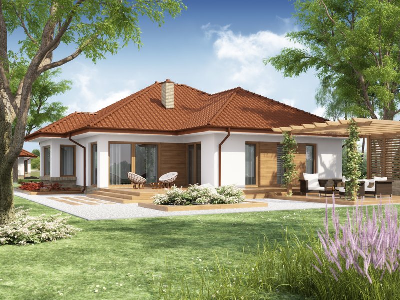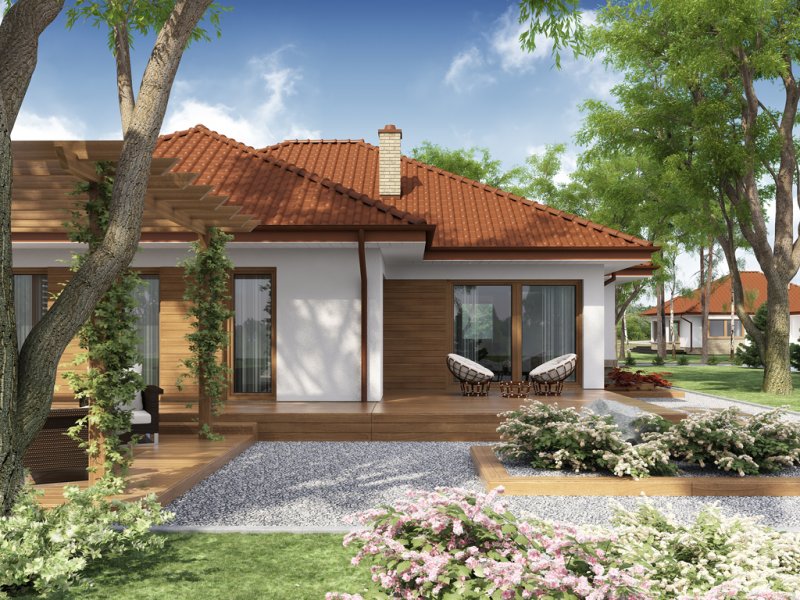 Wizualizacja jest propozycją tego jak dany projekt domu oraz jego otoczenie można zaaranżować. Sposób prowadzenia tarasu, kształt murków i elementy małej architektury typu pergole, donice itp. nie są objęte zakresem projektu. W związku z powyższym na projekcie budowlanym elementy te mogą nie być uwzględnione w projekcie ( patrz pergole ) lub zmieniony może być ich kształt i sposób prowadzenia ( wielkości tarasów, profil murków ).