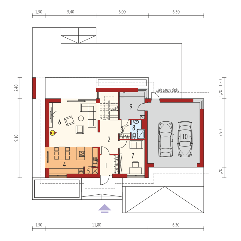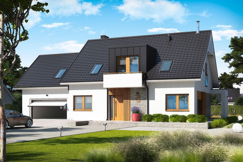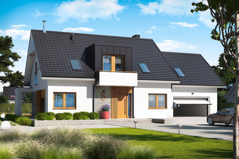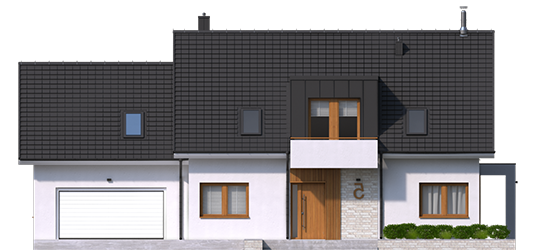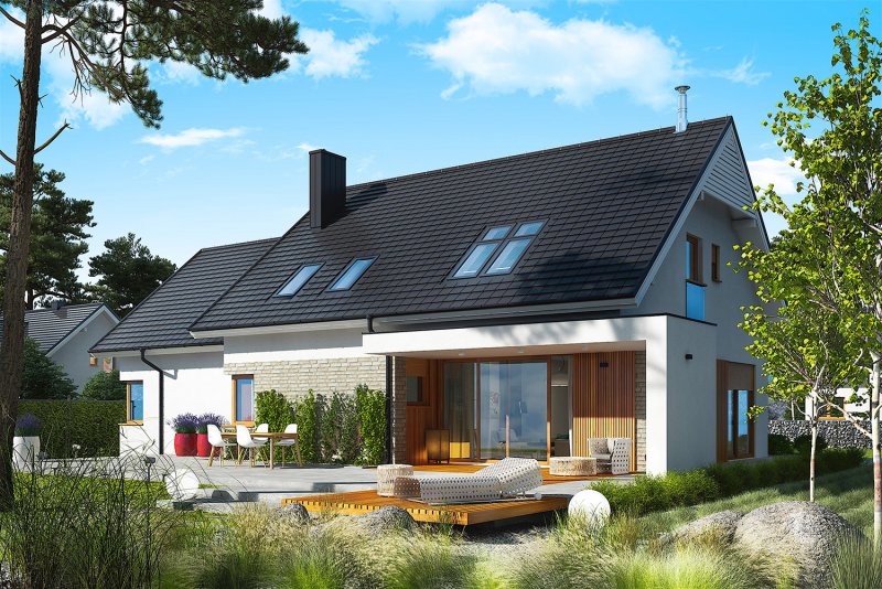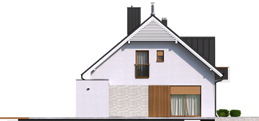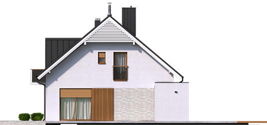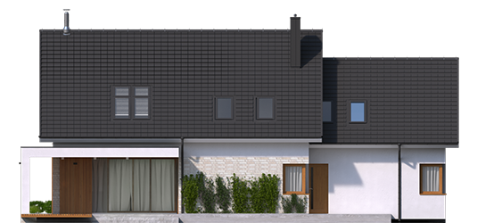 Katrina G2 to nowoczesny i energooszczędny dom, w którym świetnie odnajdą się miłośnicy wnętrz wypełnionych naturalnym światłem. Mimo swojej prostej konstrukcji, projekt prezentuje się efektownie i niebanalnie. Strefę wejściową zdobi atrakcyjna lukarna, a od strony ogrodowej fasadę dekoruje modne zadaszeniu tarasu, które ciekawie podkreśla współczesny charakter domu. Katrina G2 to świetny wybór dla wszystkich, którzy chcą mieszkać przestronnie, wygodnie i w najlepszym stylu.