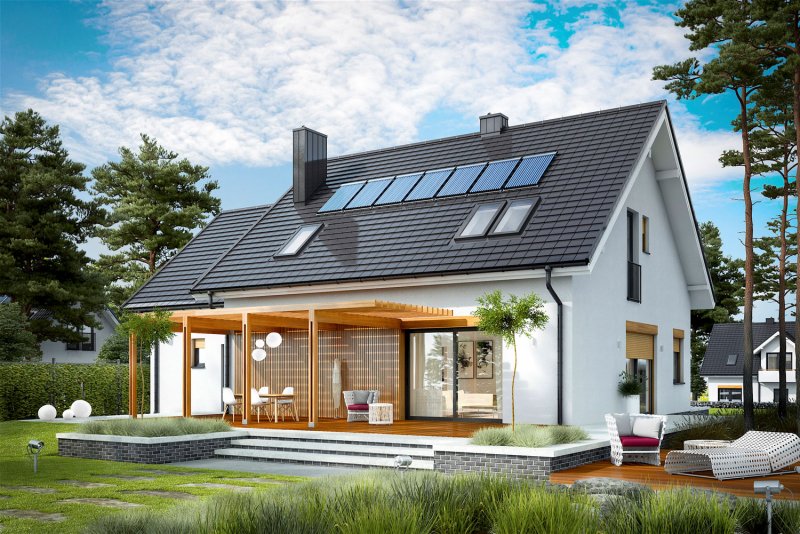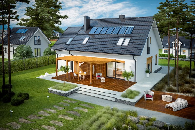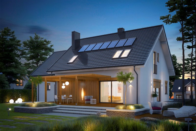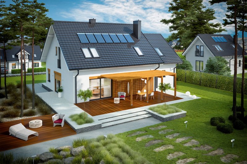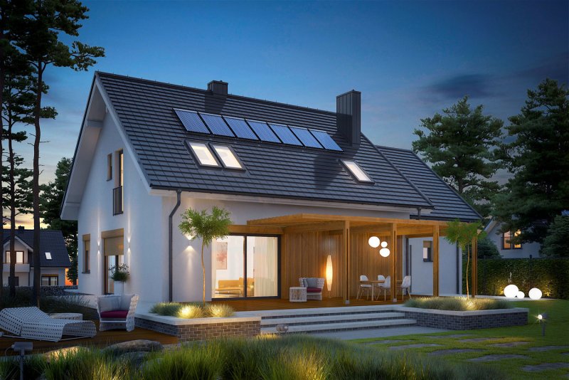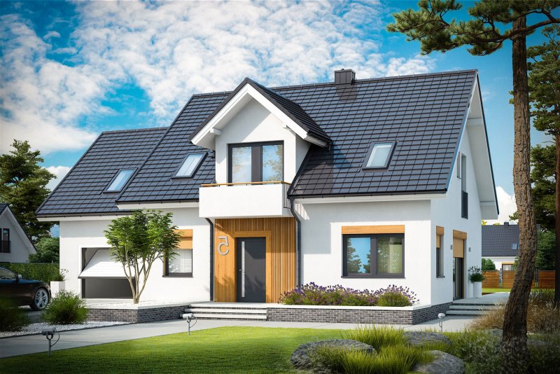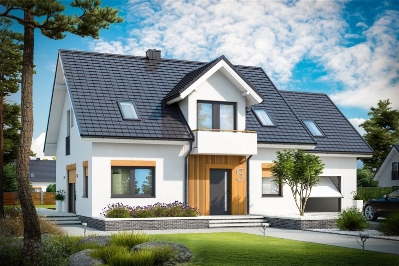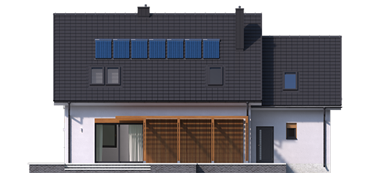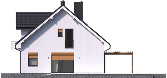 Dom Katrina (mała) G1 to idealny wybór dla rodziny, która chce mieszkać komfortowo, przytulnie i w najlepszym stylu. Śnieżnobiała fasada wzbogacona drewnem i licznymi przeszkleniami świetnie wtapia się w charakter działki oraz sprawia, że budynek prezentuje się subtelnie i z klasą. Wnętrze projektu to ponad 136 m2 świetnie zorganizowanej przestrzeni, w której zadbano o pełną harmonię wszystkich rozwiązań. Dużym plusem projektu jest szeroki taras, który stanowi naturalne przedłużenie salonu, zapewniając domownikom wspaniałe warunki do wypoczynku na świeżym powietrzu.
