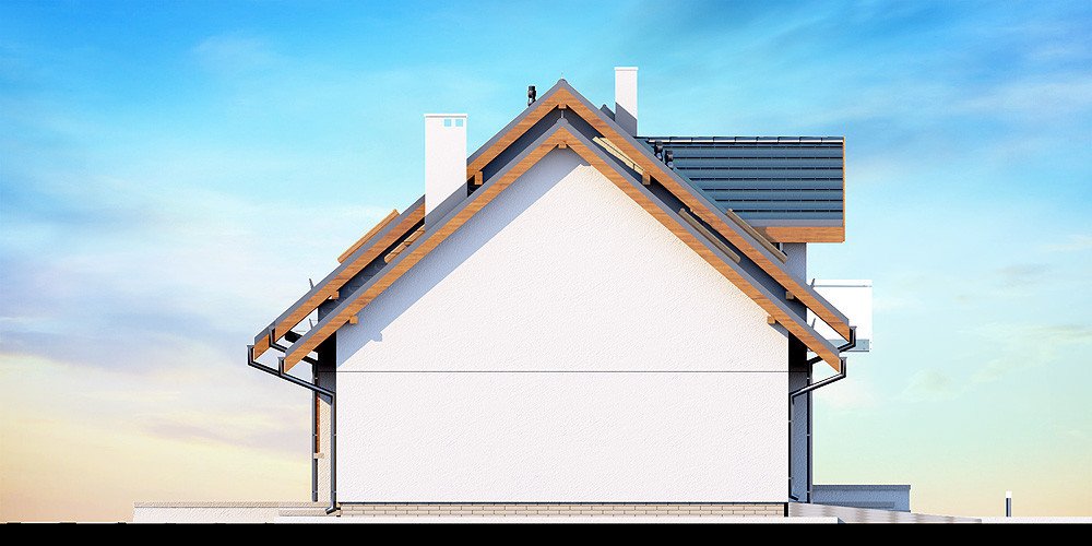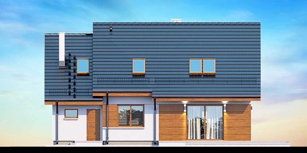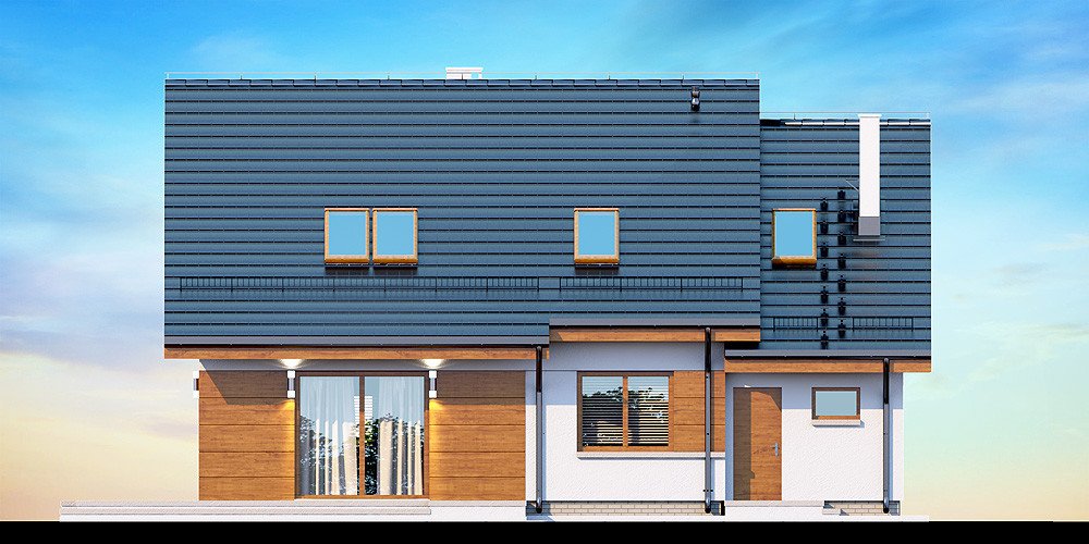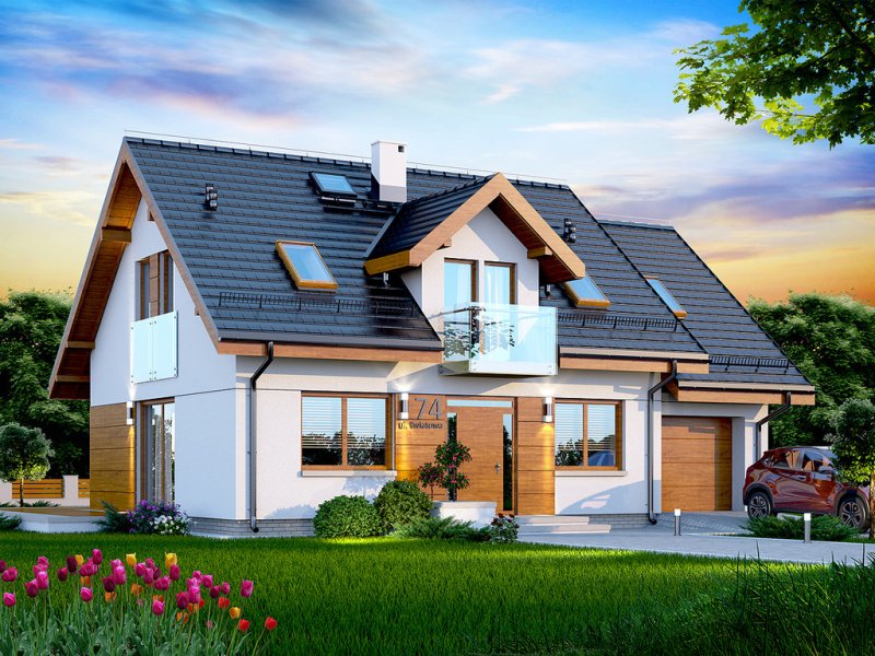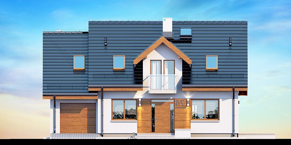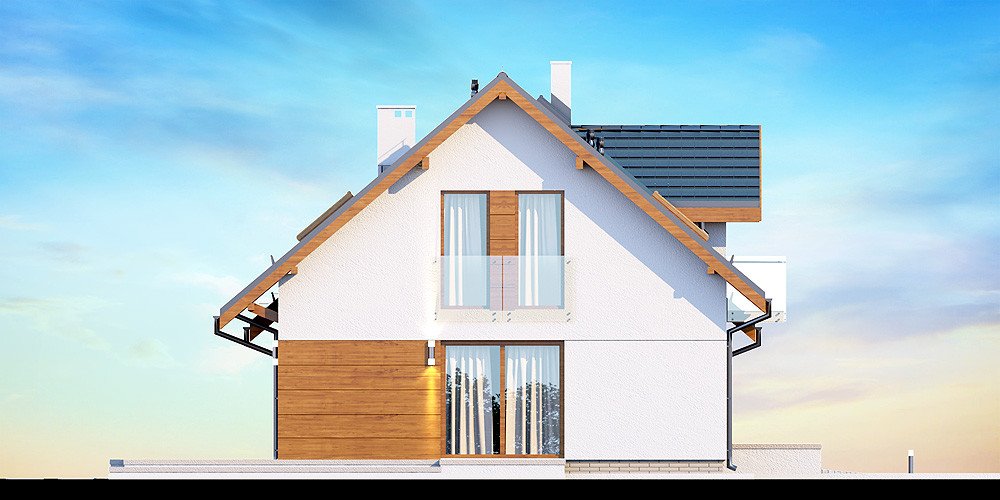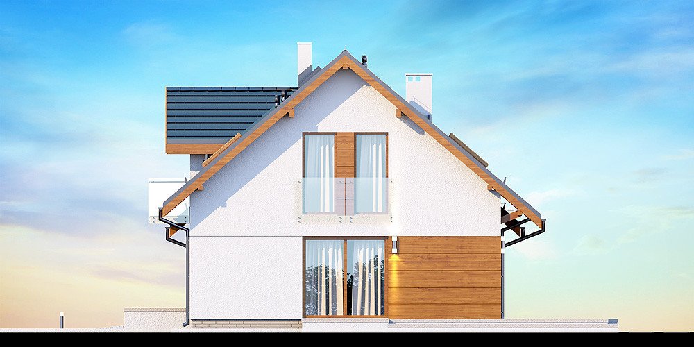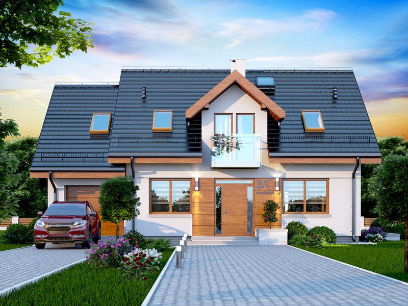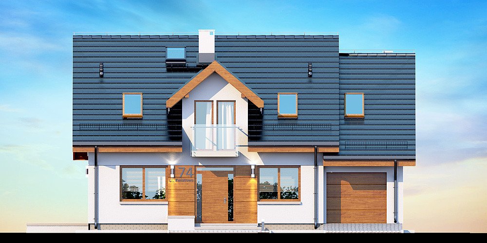 Projekt Kendra XS przedstawia funkcjonalny, atrakcyjny wizualnie dom z poddaszem użytkowym. Architektura budynku stanowi przykład niezwykle udanego połączenia tradycji z nowoczesnością. Prosta, zwarta bryła na rzucie w kształcie prostokąta została w tym przypadku przekryta stromym dachem dwuspadowym. Tradycyjny rodowód budynku podkreślono, umieszczając we frontowej połaci dachu elegancką lukarnę z balkonem. Wykończenie elewacji natomiast zaprojektowano zgodnie ze współczesnymi, modnymi trendami. Dom o takiej architekturze może stać się atrakcyjnym elementem, który doskonale wypadnie w każdym otoczeniu. Budynek zaprojektowano jako energooszczędny.