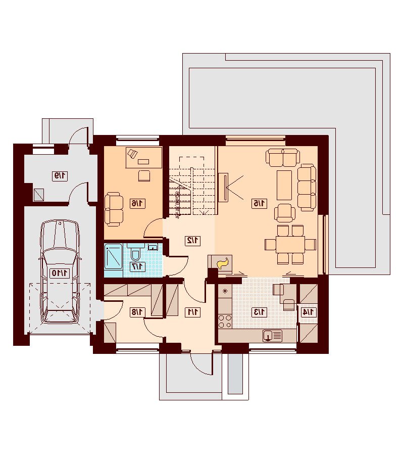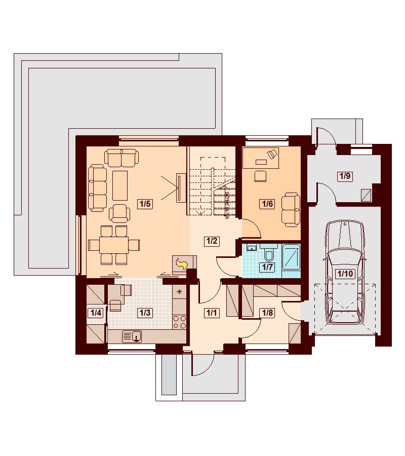 Kendra XS wyróżnia się nie tylko dokładnie przemyślaną konstrukcją, ale także precyzyjnie zaplanowanym układem wnętrz. Pierwszym pomieszczeniem, w którym znajdziemy się po przekroczeniu progu budynku, jest wiatrołap, z którego przez garderobę można dostać się do garażu. Z tyłu garażu wydzielono pomieszczenie gospodarcze z piecem gazowym oraz wyjściem na zewnątrz. Ze względu na swoje usytuowanie i dostępność bezpośrednio z ogrodu to pomieszczenie może pełnić funkcję nie tylko kotłowni, ale jednocześnie składu na narzędzia.