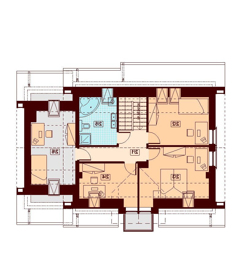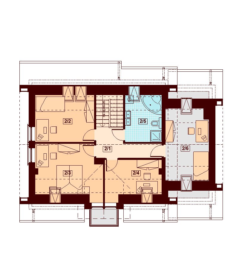 Na poddaszu domu Kendra XS wydzielono trzy wygodne pokoje oraz rodzinną łazienkę z miejscem na dużą wannę. Dwa pokoje posiadają dostęp do wspólnego balkonu. Strych nad garażem można przeznaczyć na pomieszczenie mieszkalne lub urządzić tutaj garderobę, siłownię czy pralnię z suszarnią.