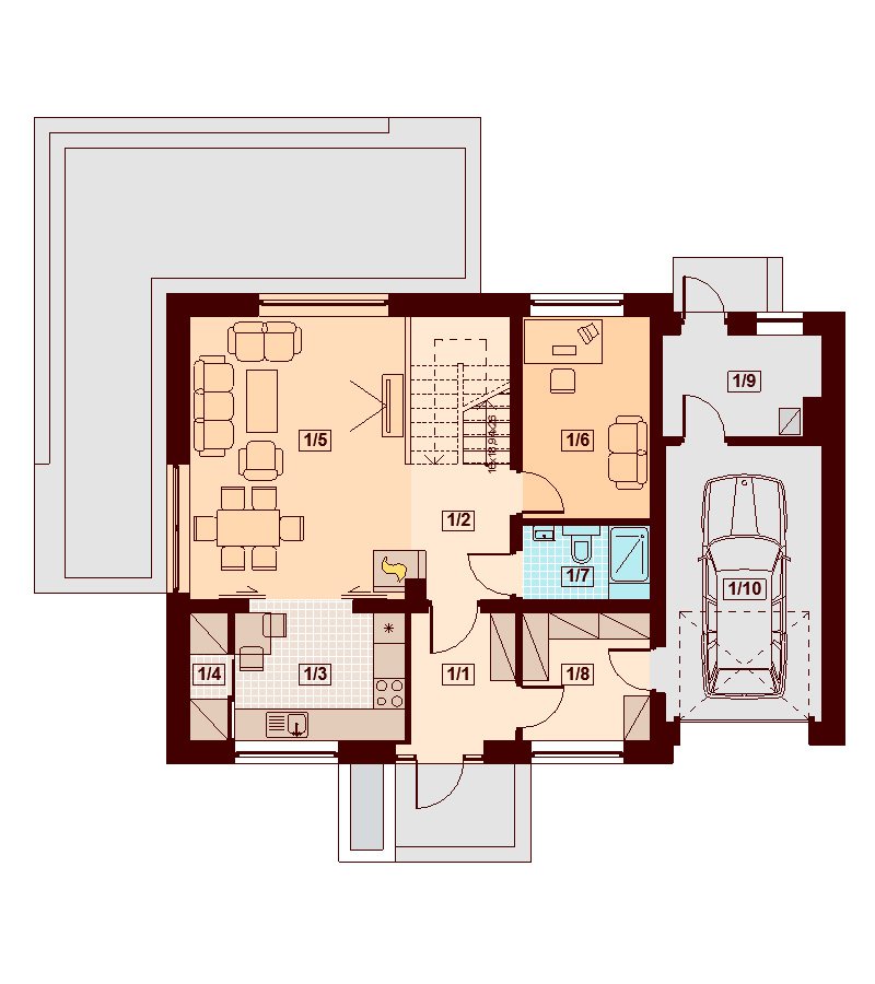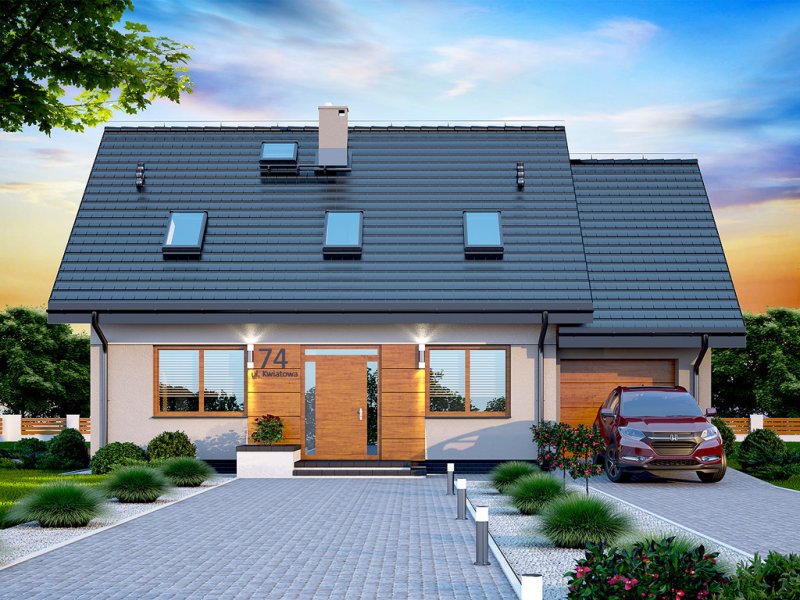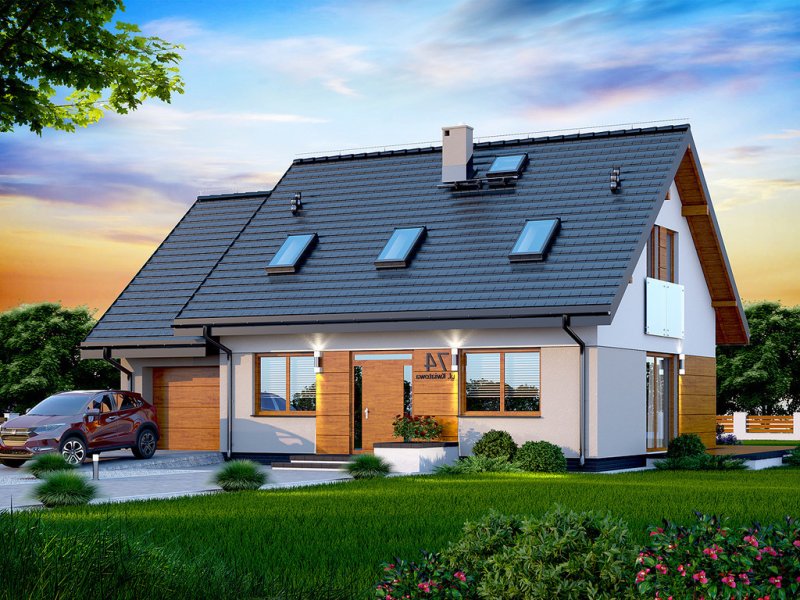 Kendra XS BIS to funkcjonalny, atrakcyjny wizualnie dom o prostej i taniej, dokładnie przemyślanej konstrukcji, przeznaczony dla 3-6 osobowej rodziny, o eleganckiej formie i współczesnej estetyce. Jest to budynek parterowy z użytkowym poddaszem, niepodpiwniczony, z garażem jednostanowiskowym. Na parterze zlokalizowana jest obszerna strefa dzienna składająca się z kuchni (która w zależności od potrzeb może być zamykana lub otwarta) słonecznej jadalni oraz salonu otwartego na taras i ogród. Uzupełnieniem kuchni jest pojemna spiżarnia. Schody w holu w zależności od potrzeb mogą być otwarte na salon powiększając w ten sposób przestrzeń dzienną i stanowiąc ciekawy element architektoniczny, mogą też być odizolowane ścianką działową od salonu. Dzięki doświetleniu strefy dziennej zarówno od strony ogrodu jak i z boku dom nadaje się na każdą działkę, zarówno z wjazdem od północy jak i od południa, wschodu bądź zachodu. Dodatkowo na parterze zaprojektowano pokój gościnny / gabinet, łazienkę oraz garderobę / schowek z przejściem do garażu oraz pomieszczenie gospodarcze (kotłownię) dostępną z garażu z wyjściem na ogród dzięki czemu może ona stanowić też miejsce składowania narzędzi ogrodowych. W wiatrołapie przewidziano miejsce na dużą szafę. Na poddaszu znalazły się trzy pokoje oraz wygodna łazienka i strych z możliwością przeznaczenia na dodatkowy pokój, garderobę, pralnię/suszarnię, siłownię czy saunę. W projektowaniu domu szczególną uwagę zwrócono na atrakcyjny wygląd zewnętrzny, proporcjonalność bryły budynku, odpowiednie doświetlenie i funkcjonalne rozplanowanie pomieszczeń przy zachowaniu prostoty konstrukcji oraz zwartości bryły domu. Architektura domu to połączenie tradycji z nowoczesnością oraz elegancji z dbałością o proporcje i estetykę. Dom zaprojektowano jako energooszczędny. Dostępne są również inne wersje projektu (Kendra XS, Kendra Mała BIS, Kendra Mała, Kendra, Kendra BIS) oraz wersje z garażem dwustanowiskowym (Kendra XS 2M i Kendra 2M).