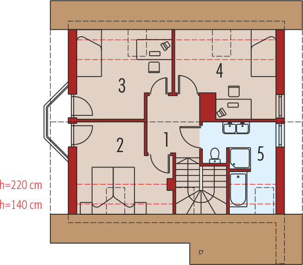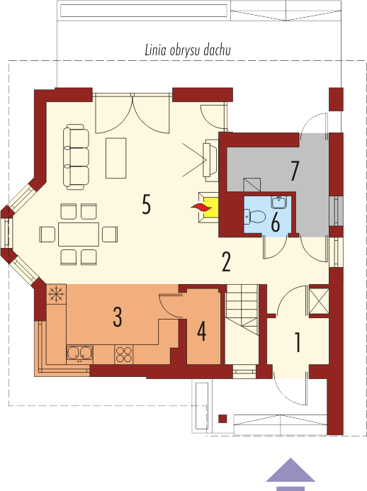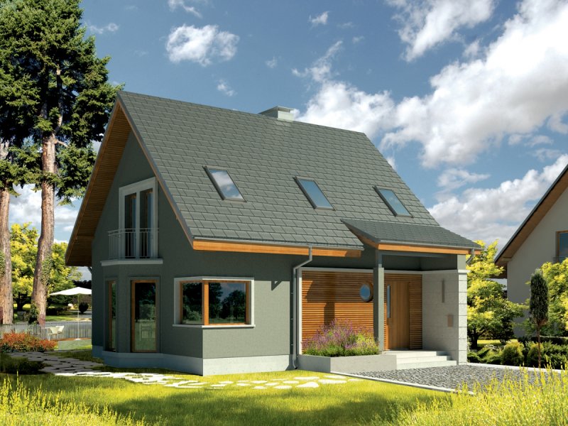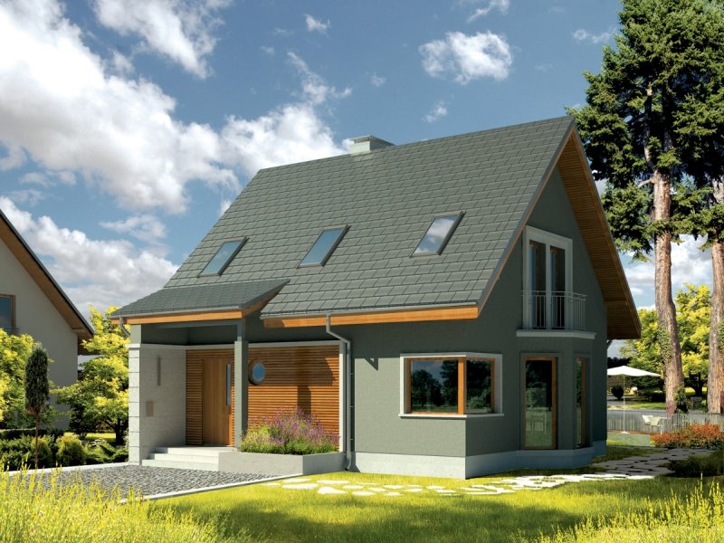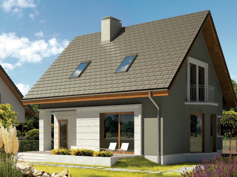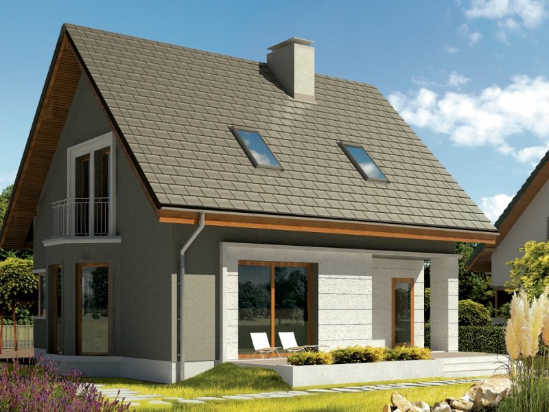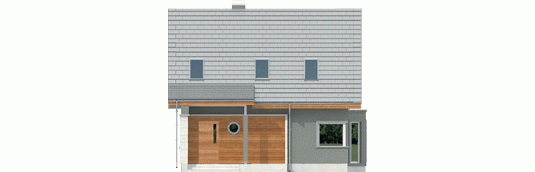 Dom Kim (wersja A) to kolejny przykład na to, że prosta bryła i tradycyjny dwuspadowy dach mogą stworzyć zjawiskowy efekt wizualny, a przy tym być niedrogie w realizacji. Na szczególną uwagę zasługuje elewacja, która choć nawiązuje do tradycji sprawia wrażenie nowoczesnej, dynamicznej. Atutem domu Kim (wersja A) jest wyraźny, funkcjonalny układ pomieszczeń. Strefę dzienną, zlokalizowaną na parterze tworzy przytulny pokój dzienny z jadalnią, kuchnia ze spiżarnią, toaleta oraz praktyczne pomieszczenie gospodarcze. Z pokoju dziennego można wyjść na zadaszony taras, który osłoni mieszkańców przed letnim słońcem oraz jesiennym deszczem. Poddasze zostało przeznaczone na strefę nocną. Dwa wygodne pokoje, komfortowa sypialnia oraz łazienka kreują przestrzeń pełną intymnego uroku. Istnieją dwie inne wersje wykończenia elewacji. Dom Kim (wersja A) to doskonała propozycja dla zwolenników czystej formy i ergonomicznych rozwiązań. Dom dostępny także w wersji z garażem.