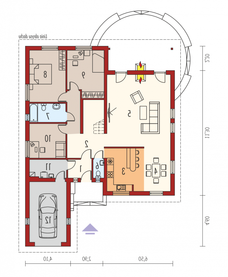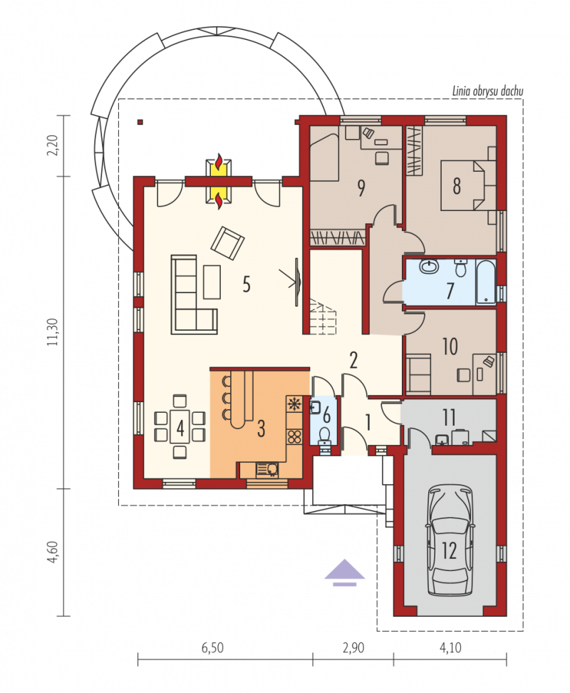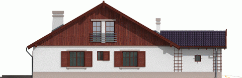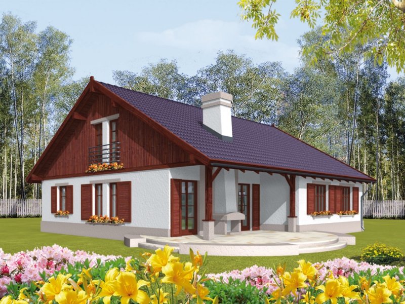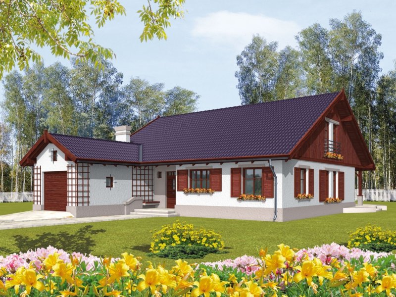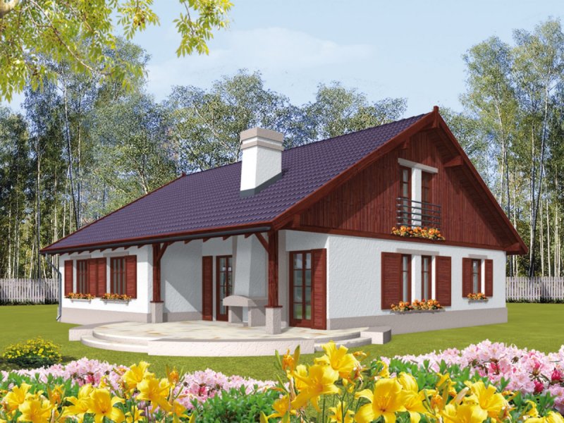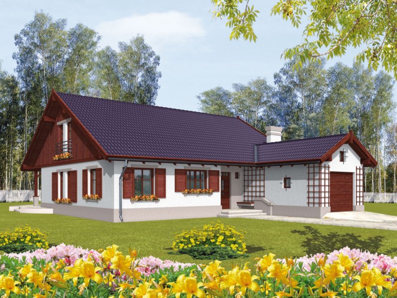 Dom parterowy z poddaszem nadającym się do późniejszego zagospodarowania i wbudowanym garażem niepodpiwniczony przeznaczony dla 3-4 osobowej rodziny. Strefę dzienną stanowi pokój dzienny z jadalnią oraz kuchnia. Strefa nocna to trzy sypialnie i łazienka. Prosta bryła budynku o niewielkiej ilości ścian nośnych daje duże możliwości aranżacji wnętrza.